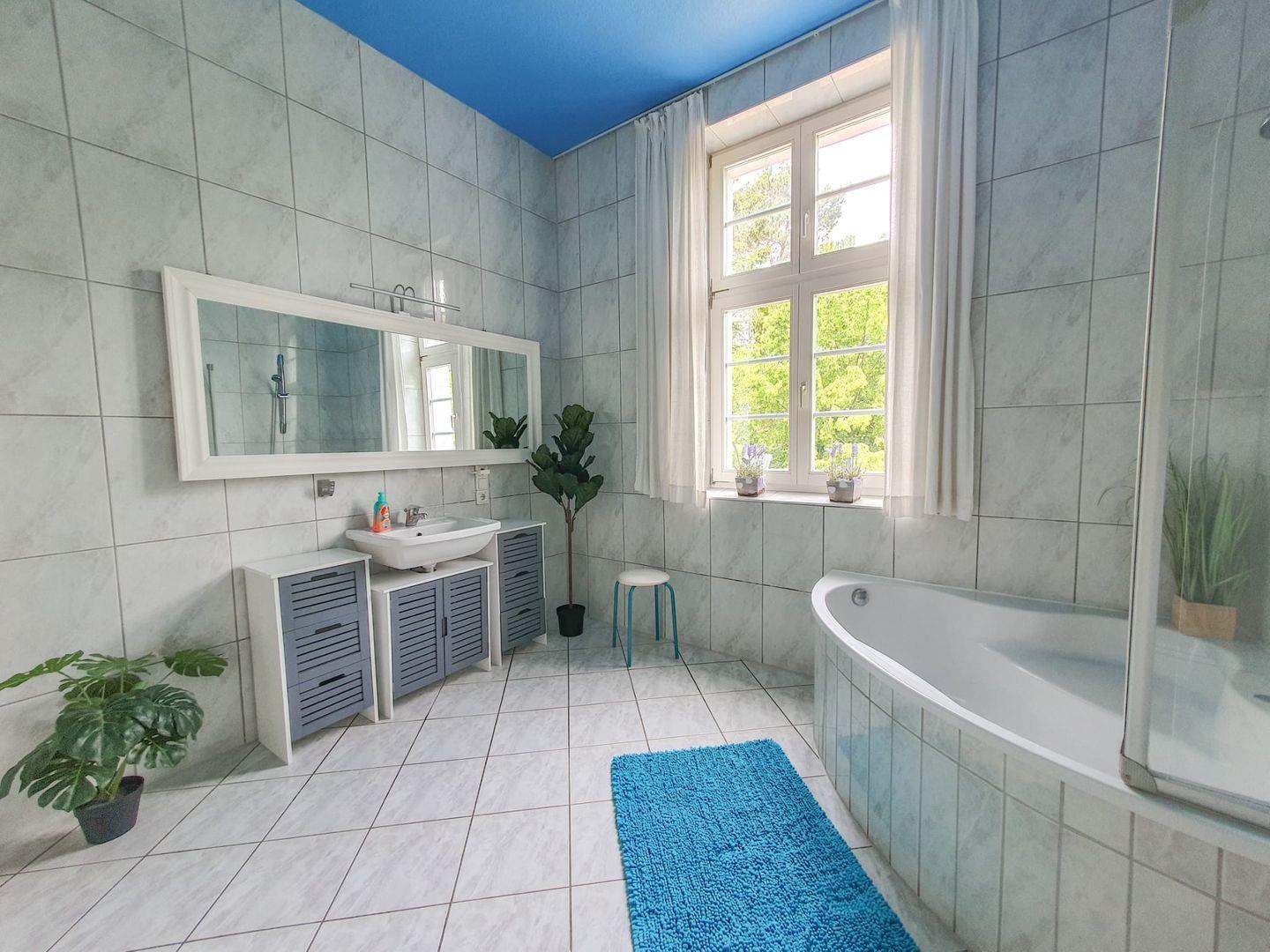 Über das große Treppenhaus gelangt man in die Hochparterre Wohnung. Die großzügig geschnittene Wohneinheit hat 150qm. Das luxuriöses Wohnzimmer mit einer großen Couch einem großen 75Zoll-Smart-TV mit Streamingdiensten, Kamin und einem Schlafsessel. Im Schlafzimmer finden Sie ein Himmelbett sowie einen wieteren Schlafsessel und einen eigenen großen möblierten Balkon mit Blick in den weitläufigen Garten.Weiterhin befindet sich ein kleines Schlafzimmer in der Einheit. Hier steht ein Etagenbett bereit. Das Badezimmer ist sehr großzügig geschnitten mit Eckbadewanne.