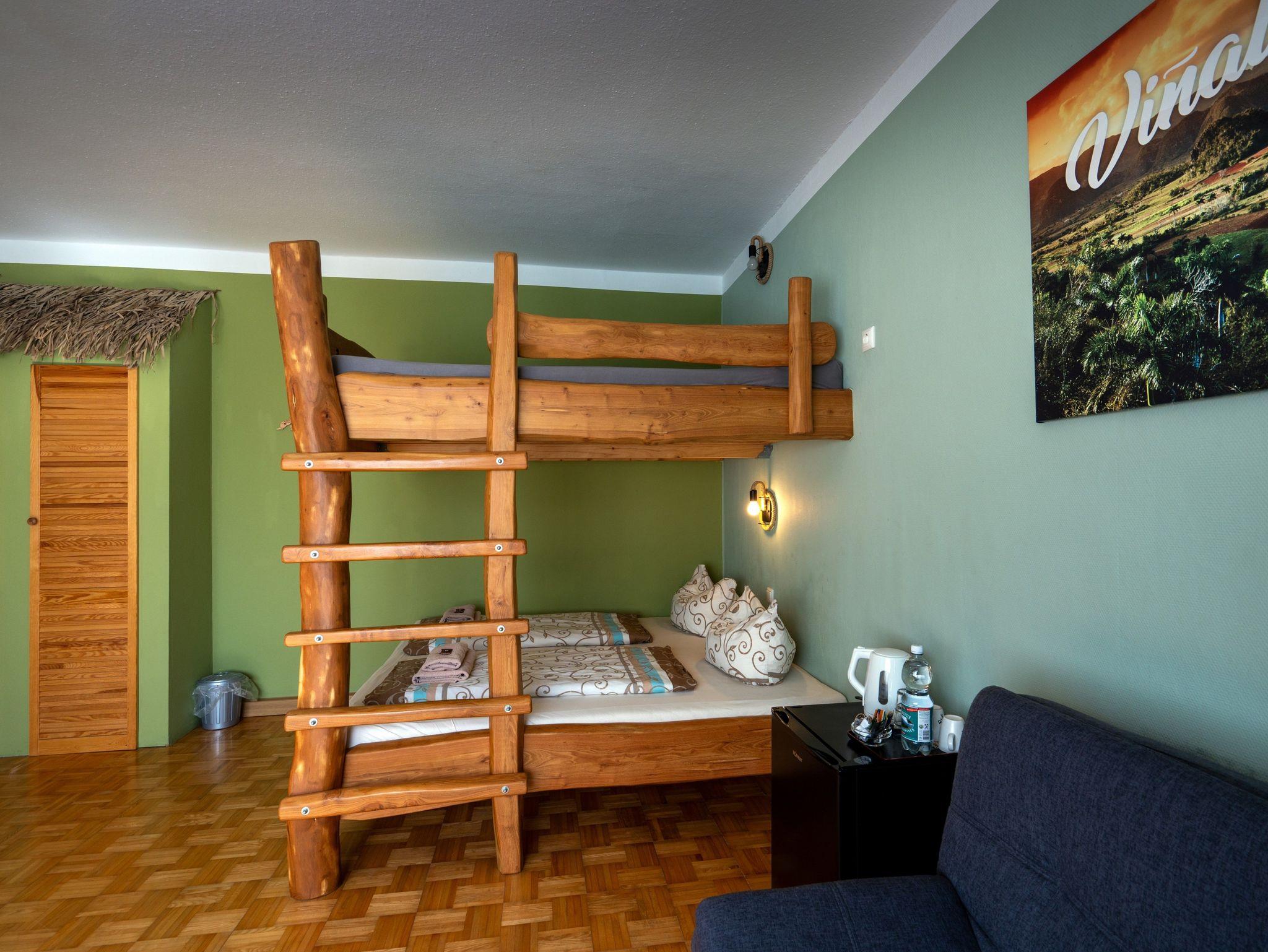 Das Vierbettzimmer Varadero vereint kreative Raumgestaltung mit gemütlichem Flair. Auf ca. 27 m² bietet es zwei übereinander angeordnete Doppelbetten in Form eines stabilen Doppelstockbetts eine originelle und zugleich praktische Lösung für Familien oder kleine Gruppen bis 4 Personen.