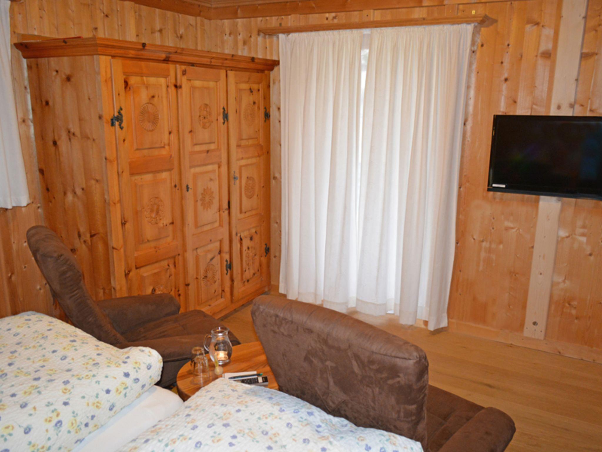 Gemütliches Eckzimmer mit Morgen- und Nachmittagssonne und einer schönen Sonnenterrasse. Zwei Relaxsessel und ein höher gestelltes Bett ohne Fußende ist für alle Rückengeplagten ein Zucker`l.