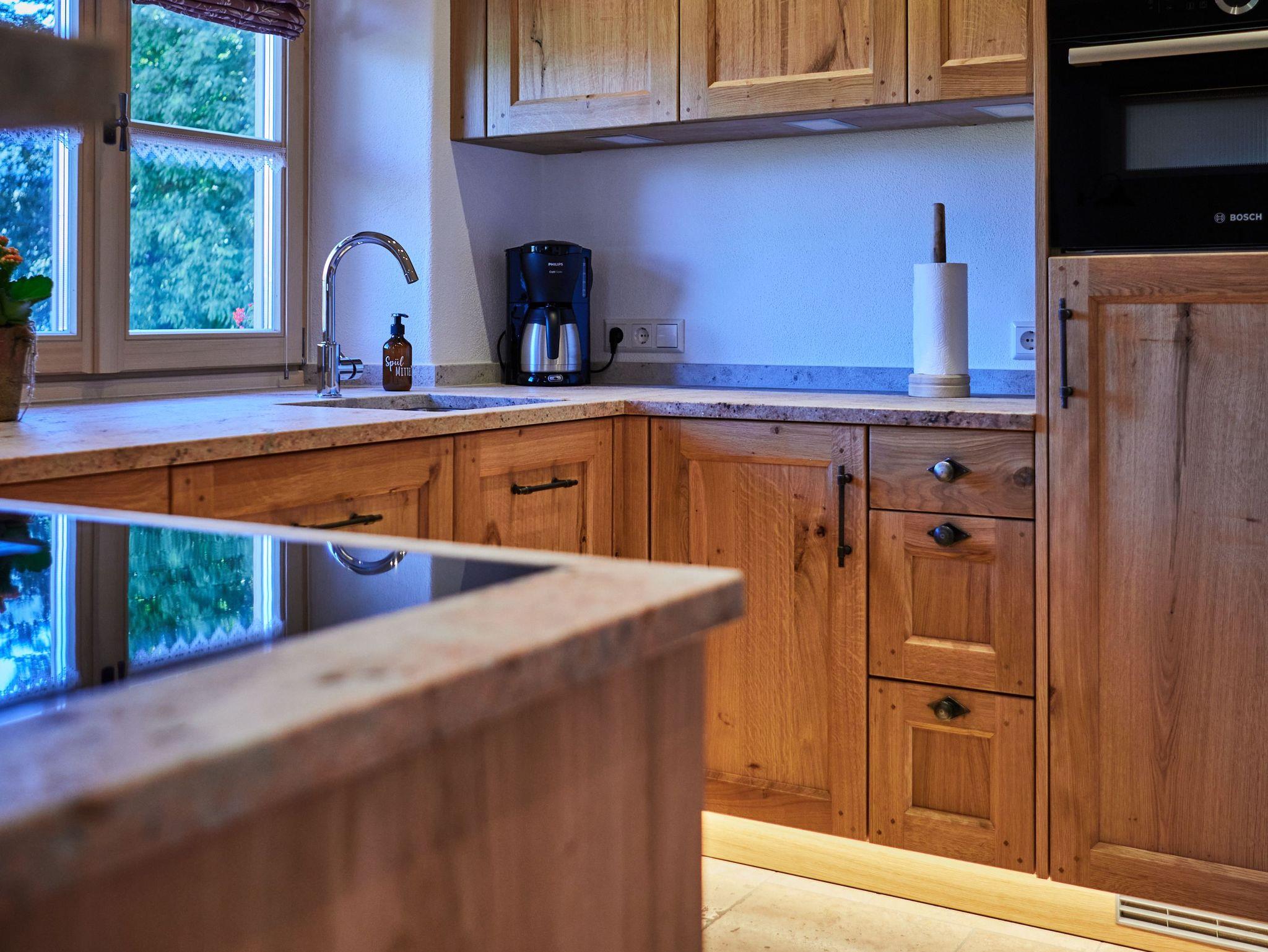 Der gemauerte Holzofen in der vollausgestatteten Wohnküche sorgt für eine angenehme Atmosphäre und vermittelt den Eindruck einer Bauernstube. Zwei getrennte Schlafzimmer, ein Bad mit ebenerdiger Dusche und ein separates Gäste-WC bieten ausreichend Platz für max. 4 Personen.