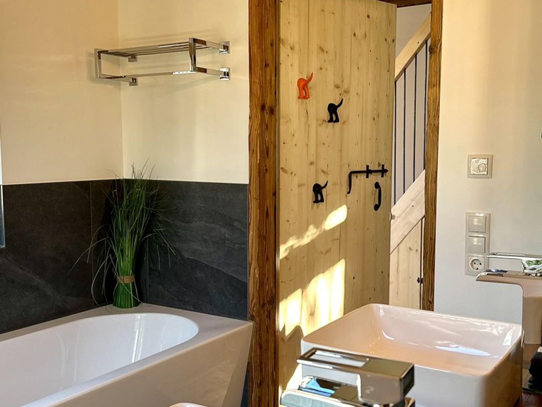 Großzügiges Bad mit WC, Waschbecken, offener Dusche, Badewanne