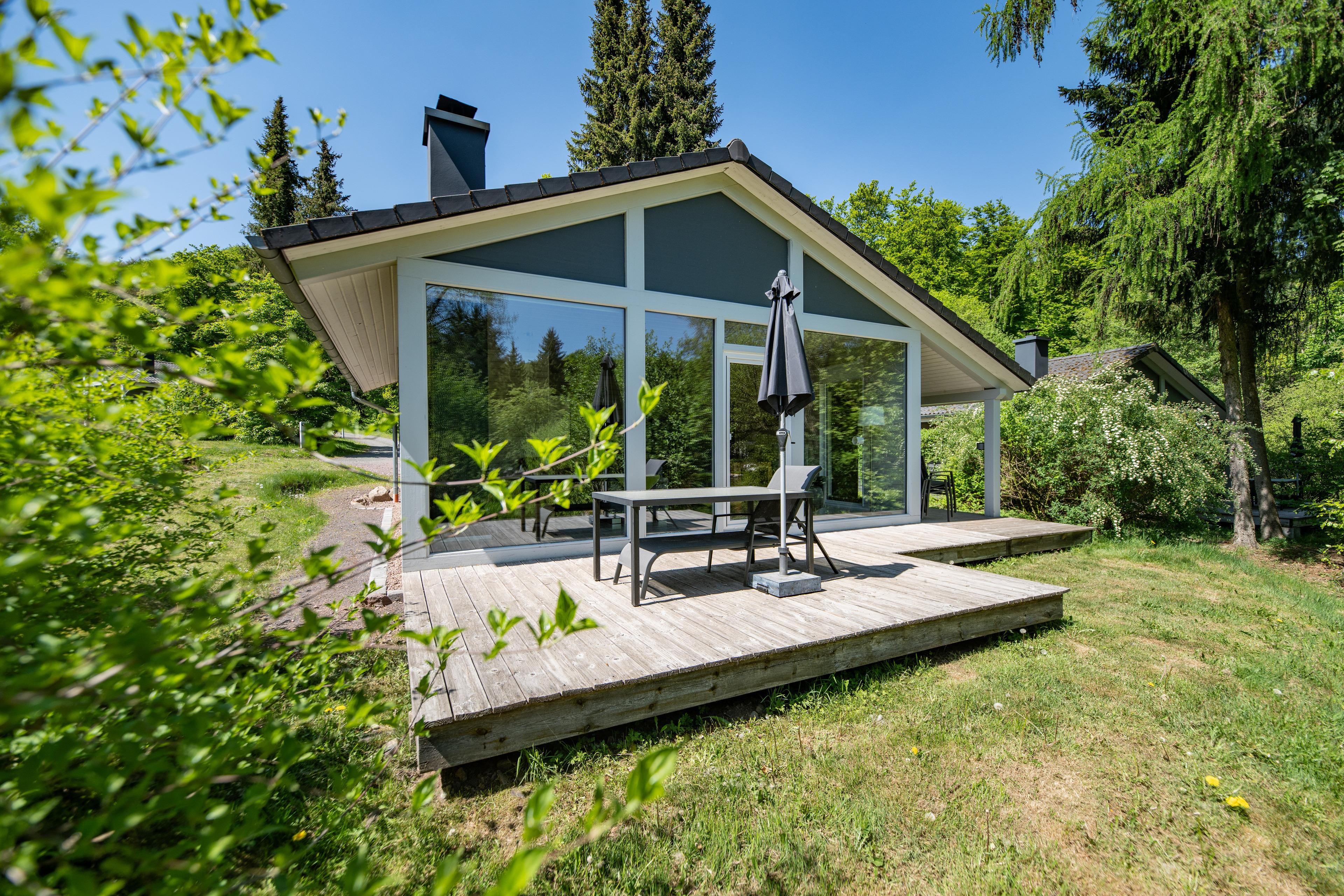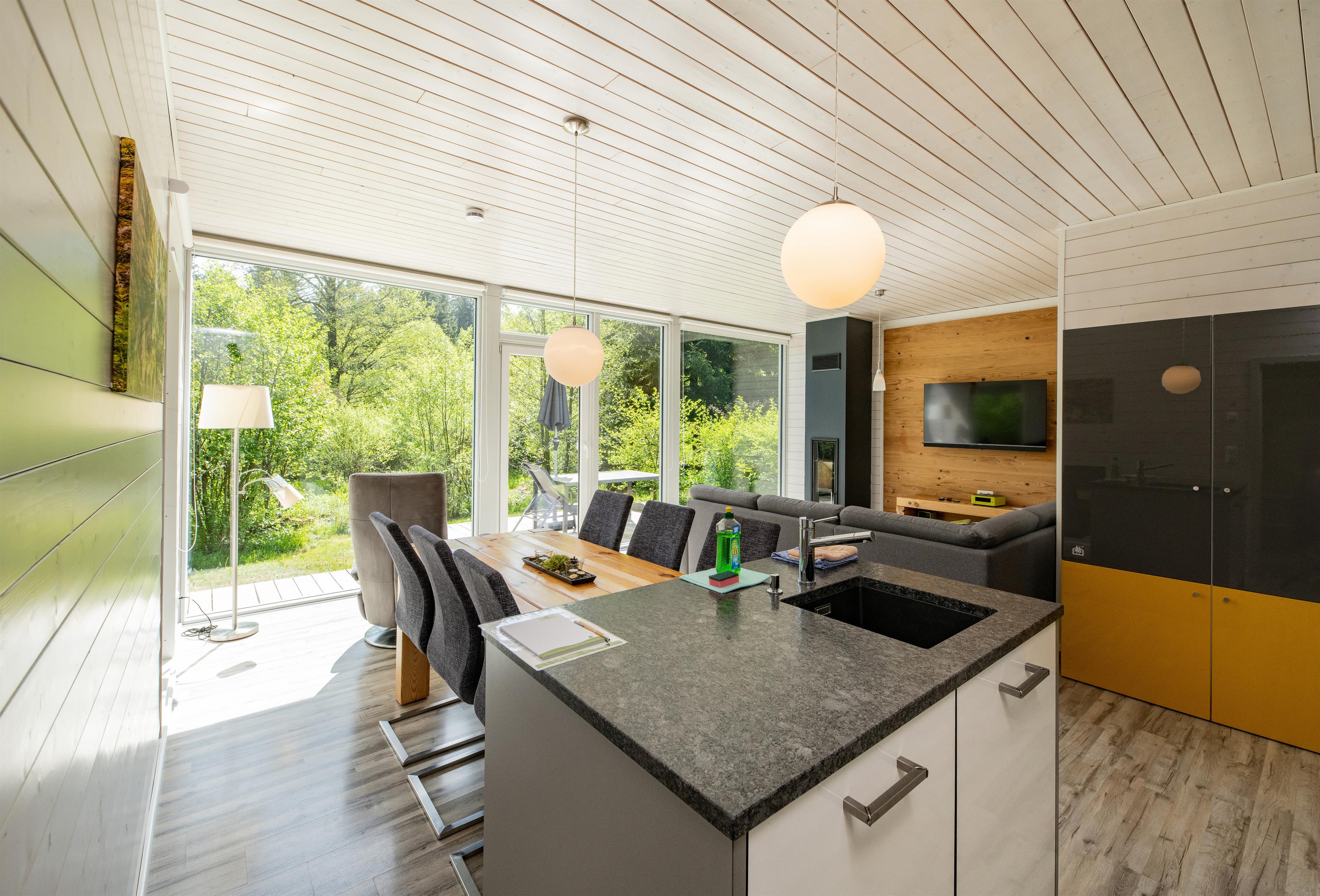 Das Ferienhaus mit einem lichtdurchluteten offenen Wohn- und Küchenbereich, zwei Schlafzimmern und einem Wellness-Bad mit Sauna bietet Ihnen auf 70 Quadratmetern ausreichend Platz für 4 Personen. Die 7 Meter breite Glasfront lässt die Natur beim Essen oder Relaxen teilhaben. In der kalten Jahreszeit vollendet das knisternde Kaminfeuer das Urlaubsfeeling.