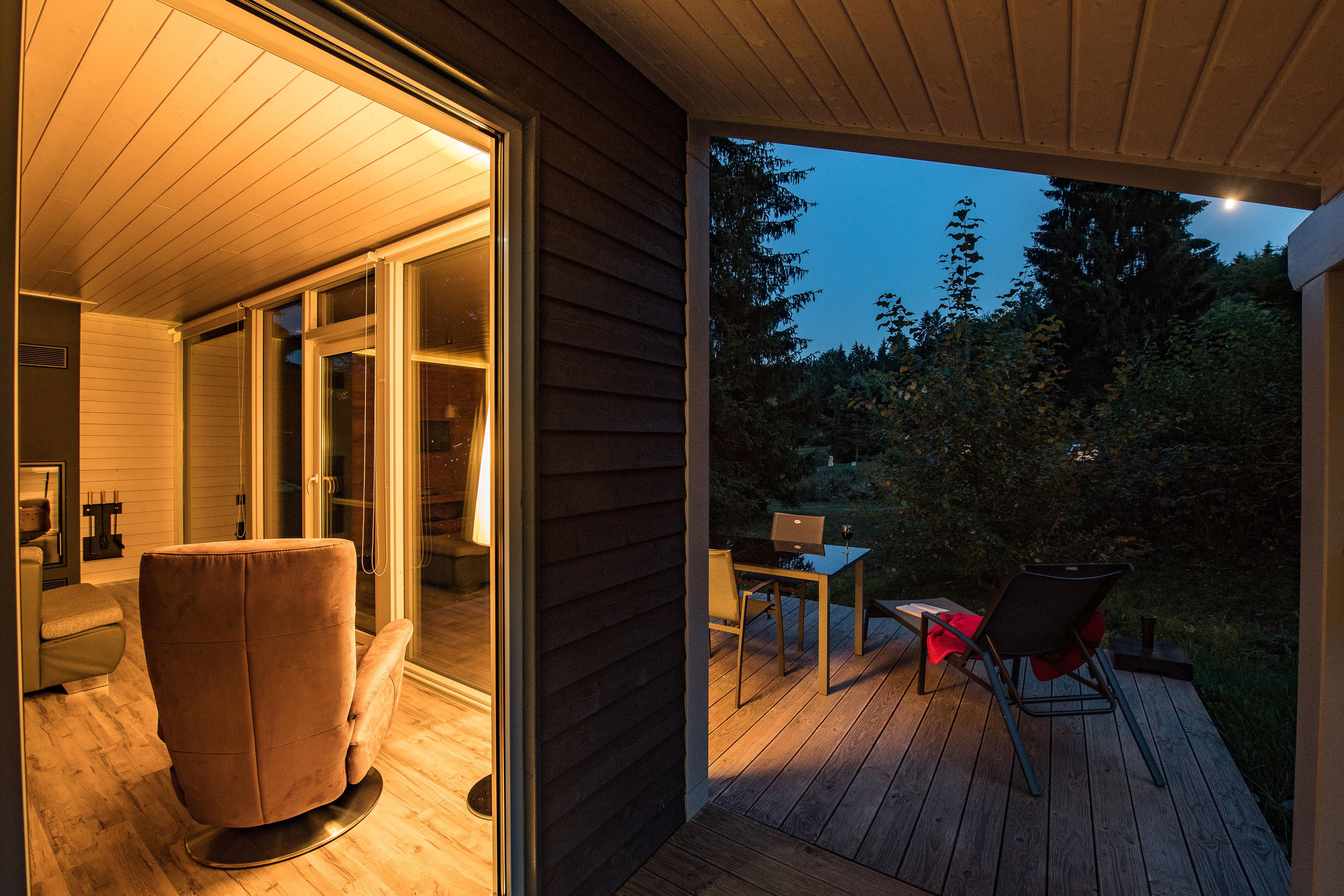 Das Ferienhaus mit einem lichtdurchluteten offenen Wohn- und Küchenbereich, zwei Schlafzimmern und einem Wellness-Bad mit Sauna bietet Ihnen auf 70 Quadratmetern ausreichend Platz für 4 Personen. Die 7 Meter breite Glasfront lässt die Natur beim Essen oder Relaxen teilhaben. In der kalten Jahreszeit vollendet das knisternde Kaminfeuer das Urlaubsfeeling.