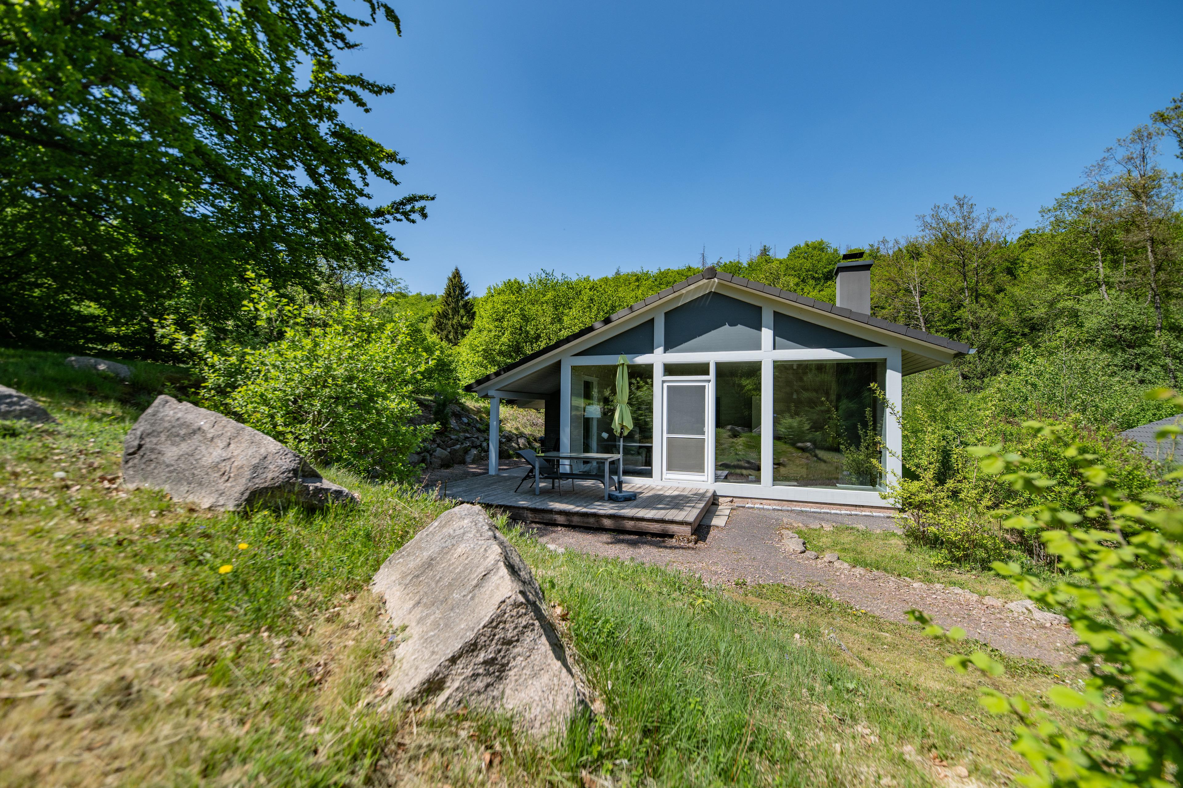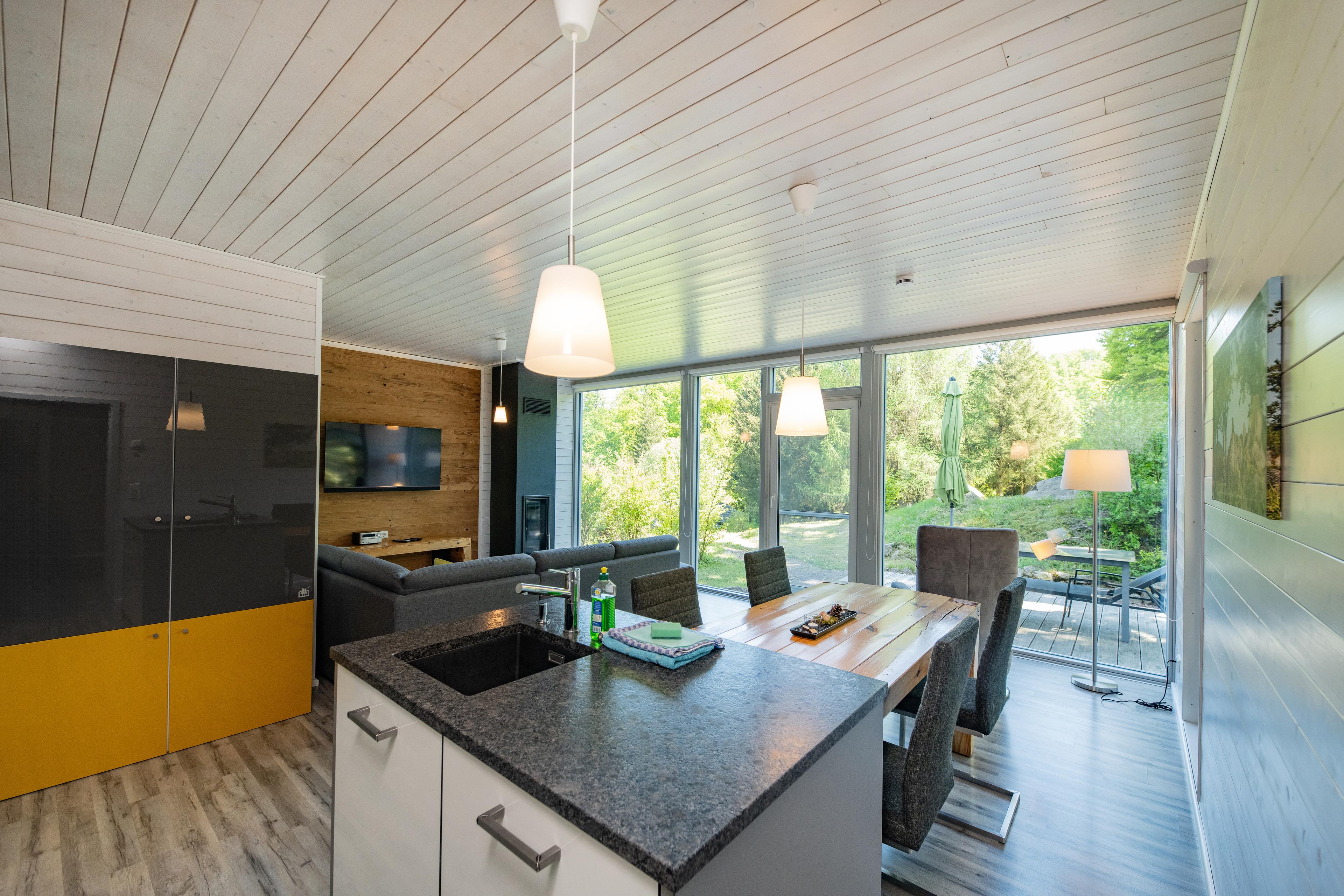 Das Ferienhaus mit einem lichtdurchluteten offenen Wohn- und Küchenbereich, zwei Schlafzimmern und einem Bad bietet Ihnen auf 61 Quadratmetern ausreichend Platz für 4 Personen. Die 7 Meter breite Glasfront lässt die Natur beim Essen oder Relaxen teilhaben. In der kalten Jahreszeit vollendet das knisternde Kaminfeuer das Urlaubsfeeling.