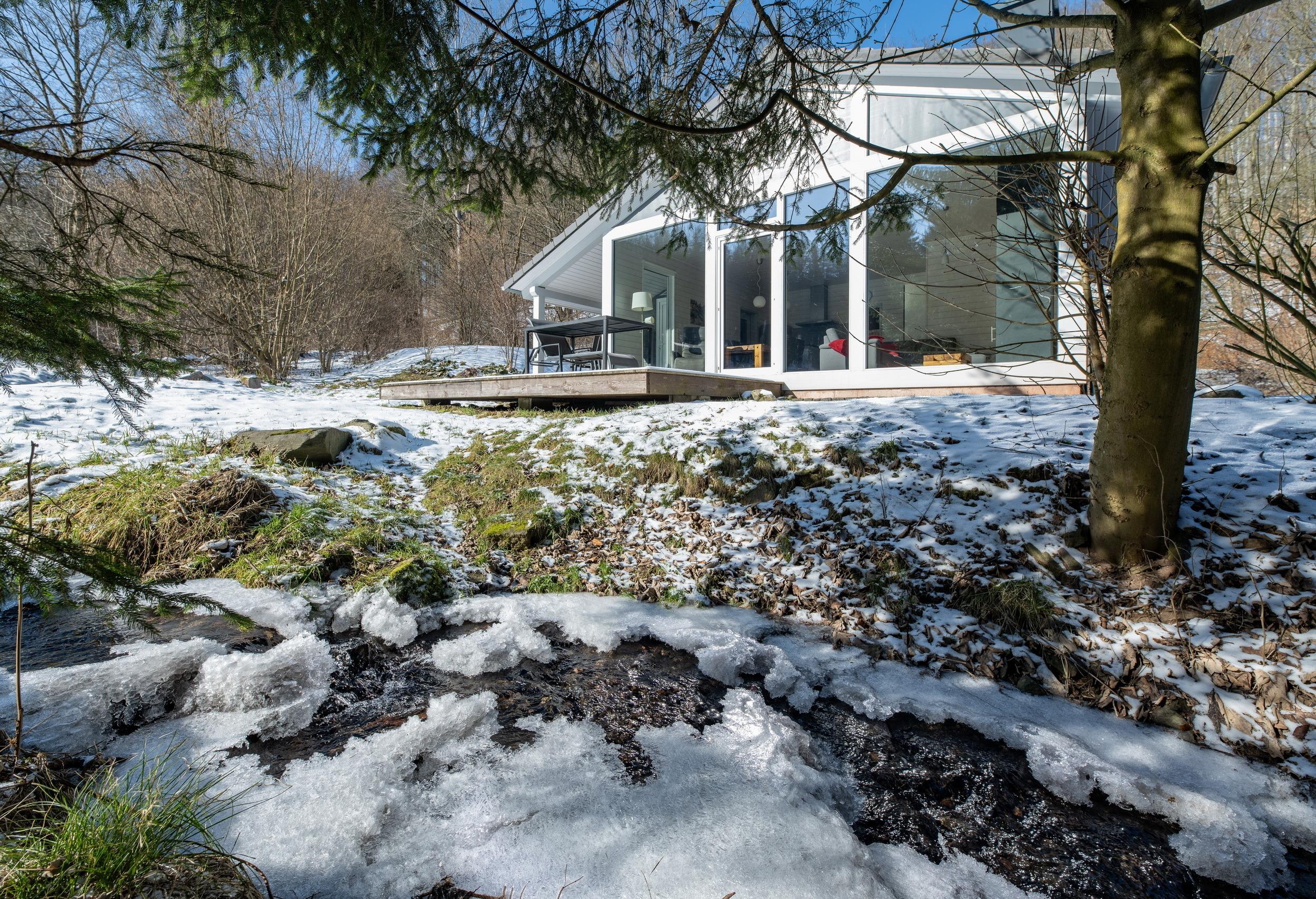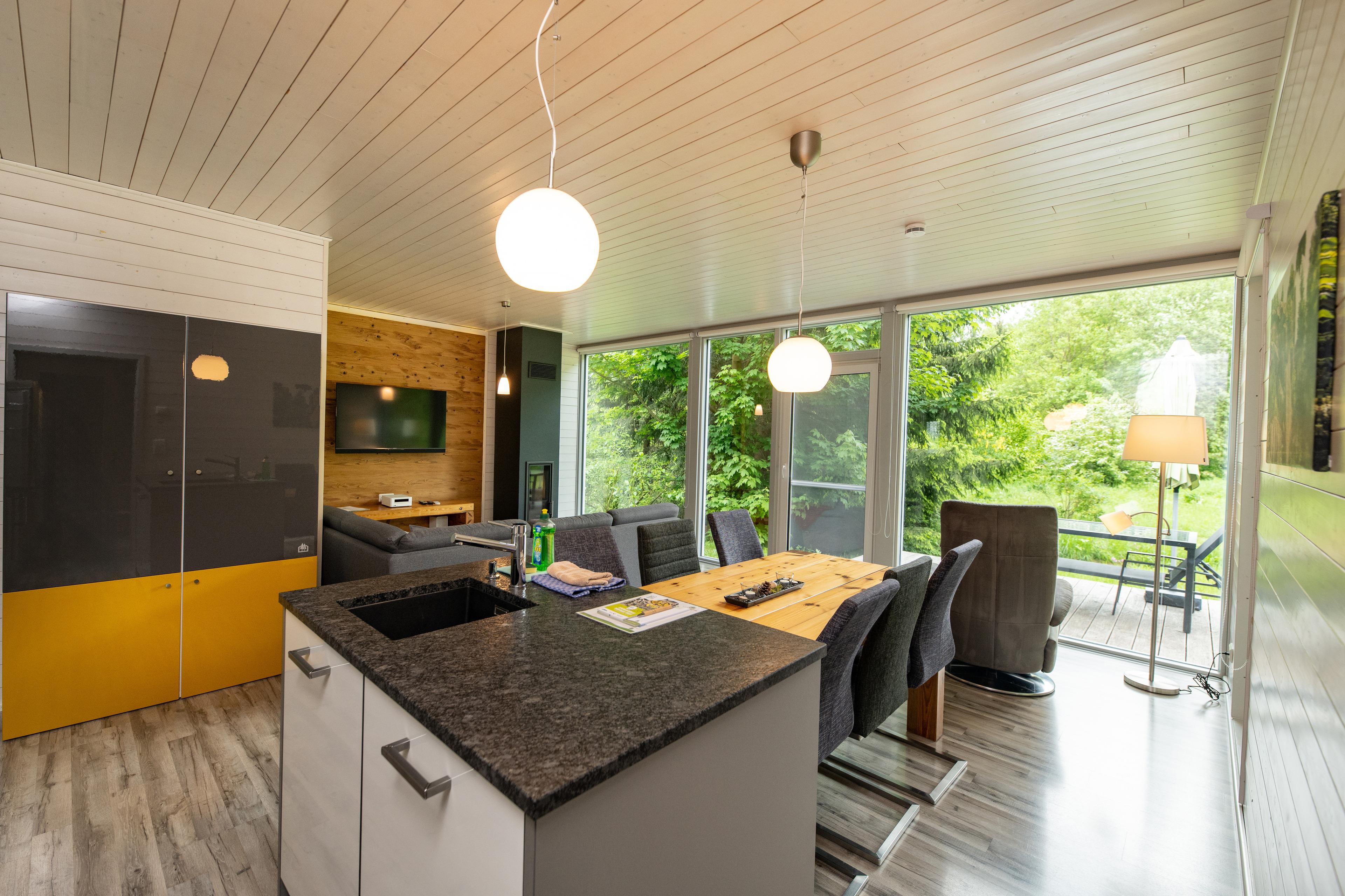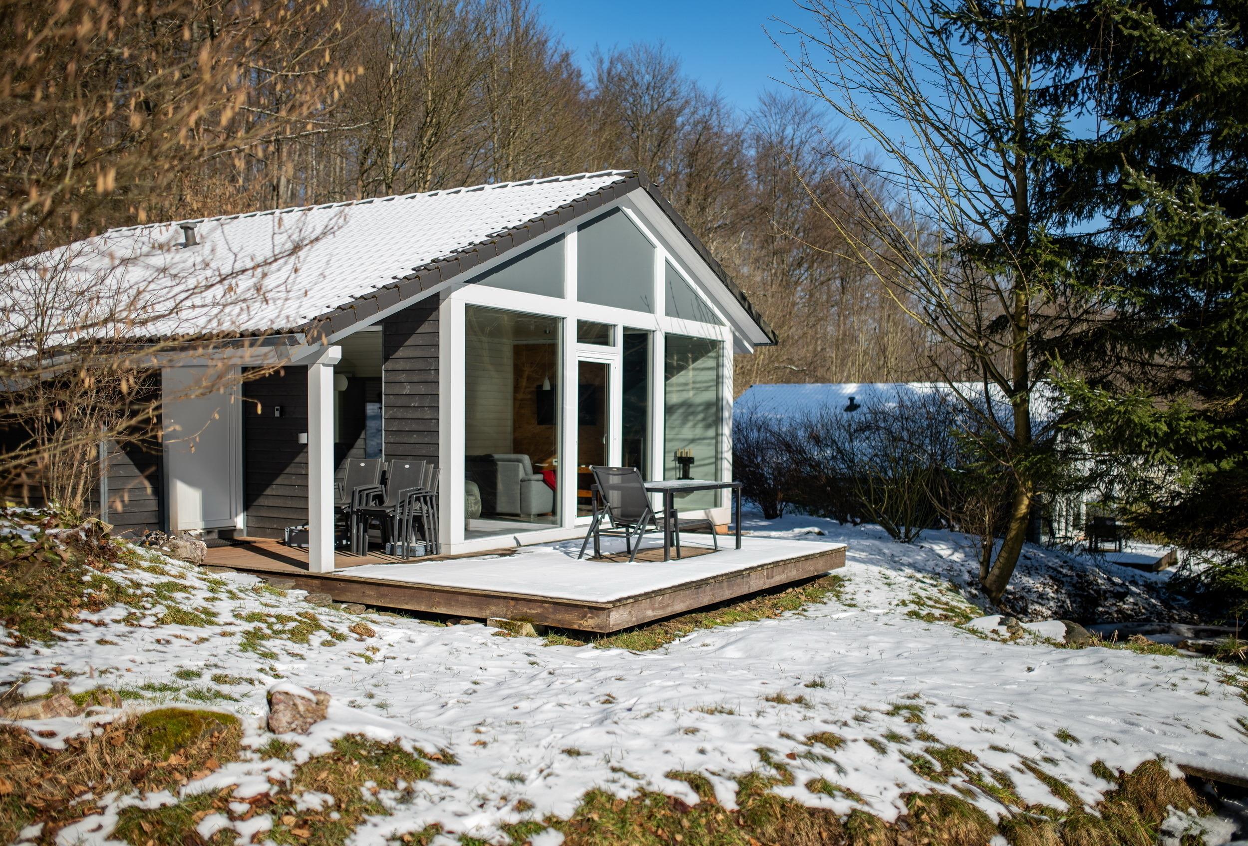 Das Ferienhaus mit einem lichtdurchluteten offenen Wohn- und Küchenbereich, zwei Schlafzimmern, einem Wellnessraum mit Infrarotkabine (Infrarotsauna) und einem Bad bietet Ihnen auf 70 Quadratmetern ausreichend Platz für 4 Personen. Die 7 Meter breite Glasfront lässt die Natur beim Essen oder Relaxen teilhaben. In der kalten Jahreszeit vollendet das knisternde Kaminfeuer das Urlaubsfeeling.