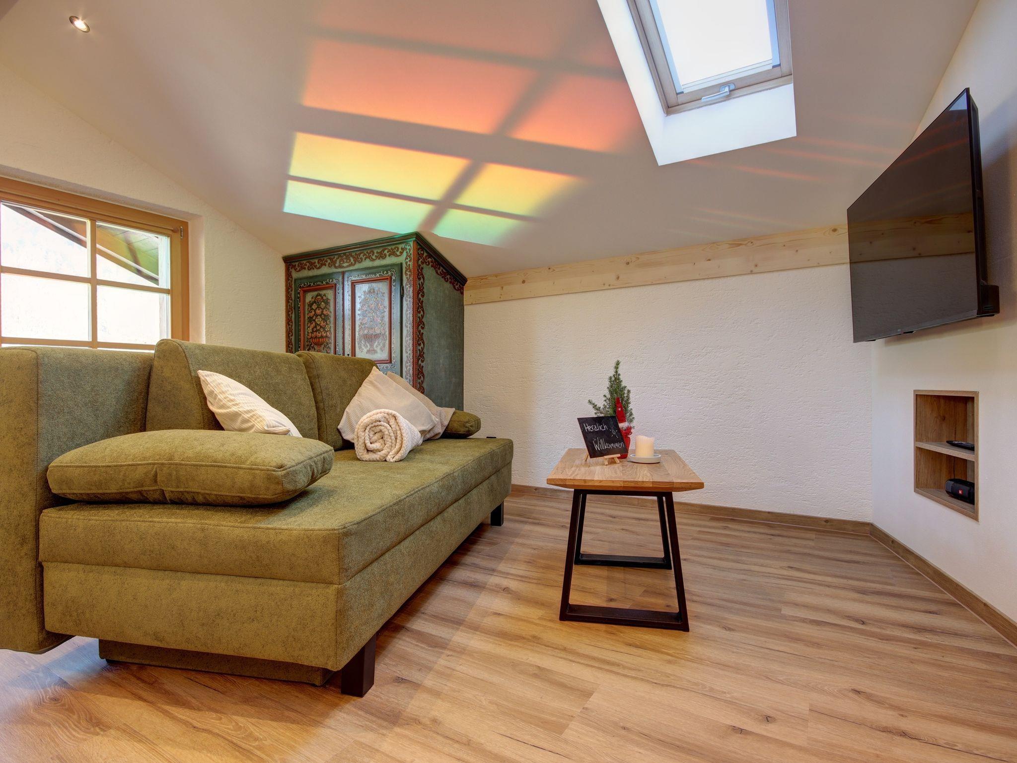 Das Wohnzimmer der gemütlichen Dachwohnung verfügt über einen offenen Kamin und einer Ausziehcouch. Vom Balkon haben Sie einen tollen Blick auf den Rauschberg. Im separaten Schlafzimmer träumen Sie von tollen Ausflügen.