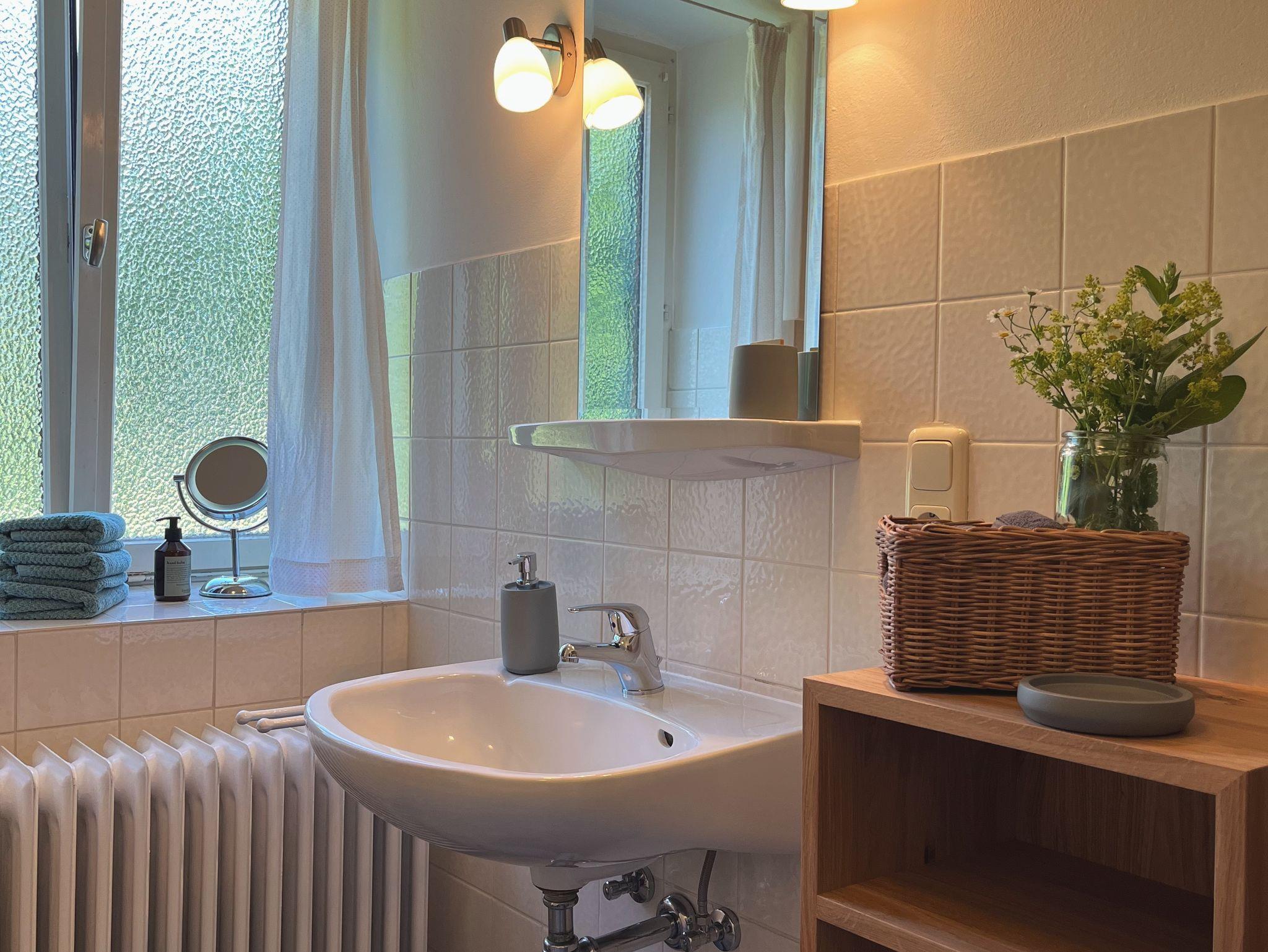 Das helle Badezimmer verfügt über Badewanne, Dusche, WC und Waschbecken, ergänzt durch einen Haartrockner – ideal für entspannte Wohlfühlmomente. Vom überdachten Balkon eröffnet sich ein herrlicher Blick auf die Berge, der zum Innehalten einlädt.