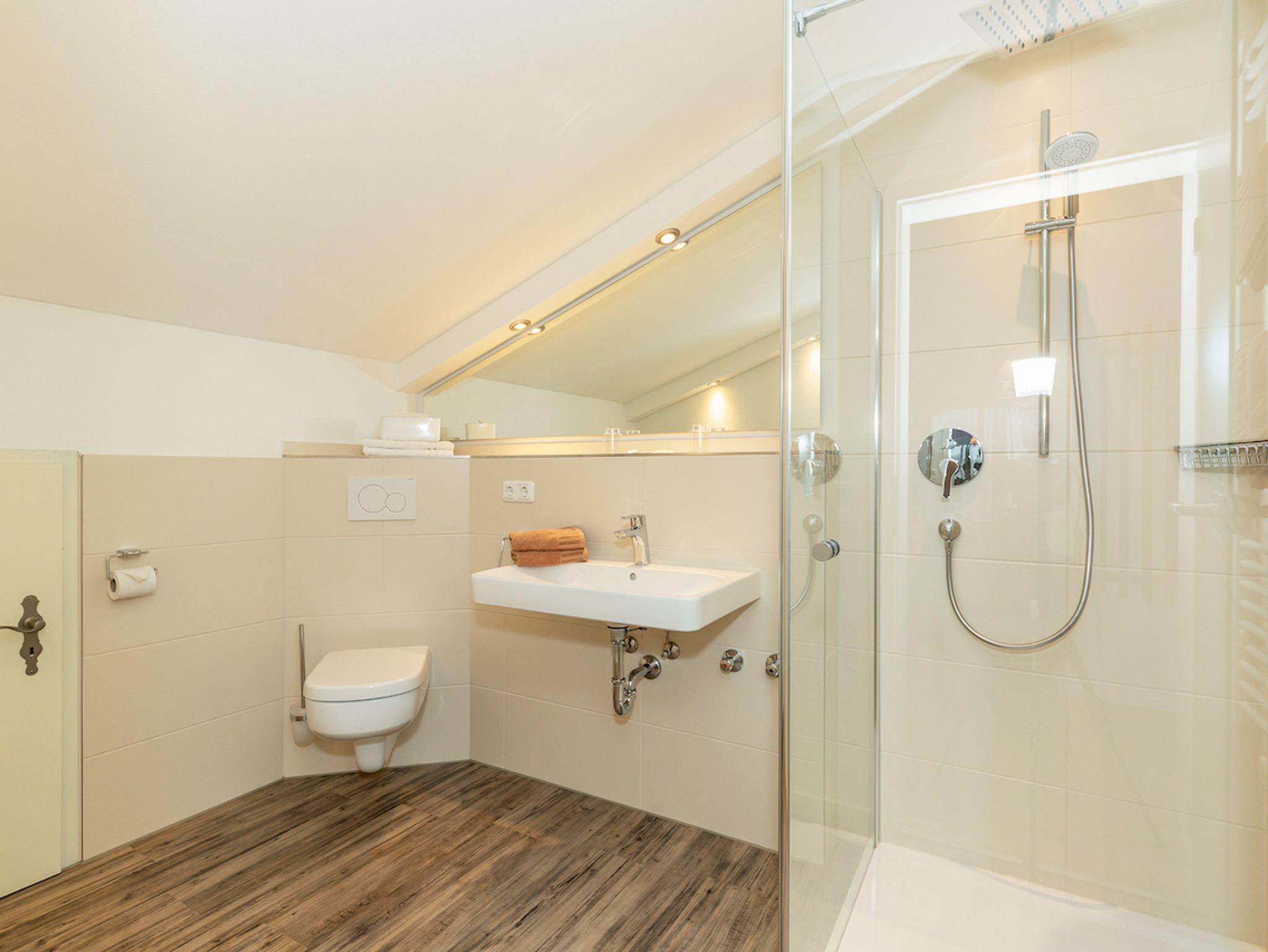 Die großzügige Wohnung verfügt ausserdem über ein seperates Garderobenzimmer & ein drittes Bad mit Dusche | WC | Föhn | Kosmetikspiegel | Kosmetikserie. Sowie einen großen, absolut ruhig gelegenen Balkon mit Sitzgruppe | Sonneliegen und mit traumhaftem Blick auf Wiesen, Wälder und die umliegenden Berge.
