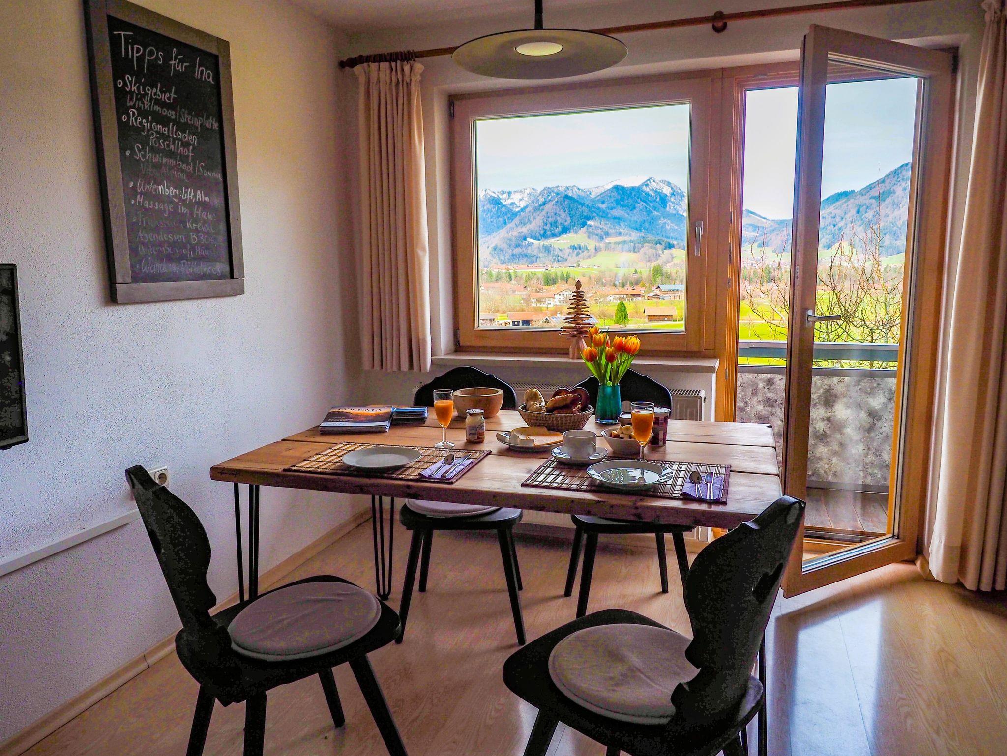 Geniesst die herrliche Aussicht in unserer Wohnung Weitsicht mit 3 Schlafzimmer, 2 Bädern, Wohnküche und Balkon. Die Wohnung ist modern eingerichtet und befindet sich in Alleinlage mit Blick auf das Tal und die Chiemgauer Berge. Die Ferienwohnung Weitsicht ist rollstuhl- und behindertengerecht, nur das 3. Schlafzimmer im DG nicht.