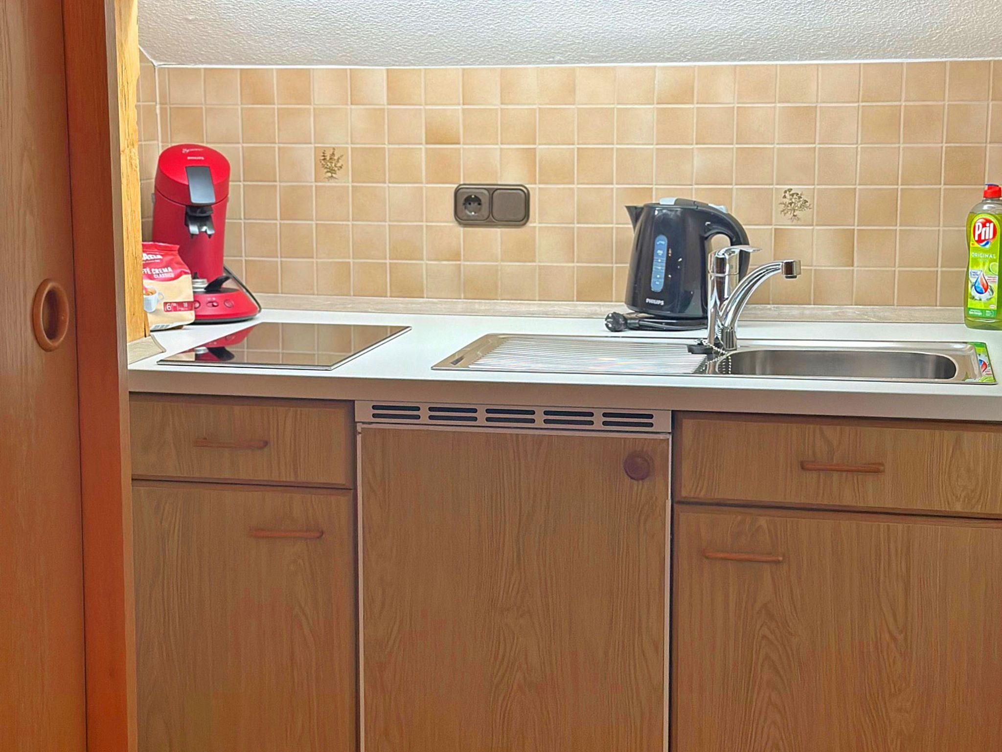 • Kochnische mit 2-Platten-Induktion, Kühlschrank, Wasserkocher, Kaffeemaschine, Toaster