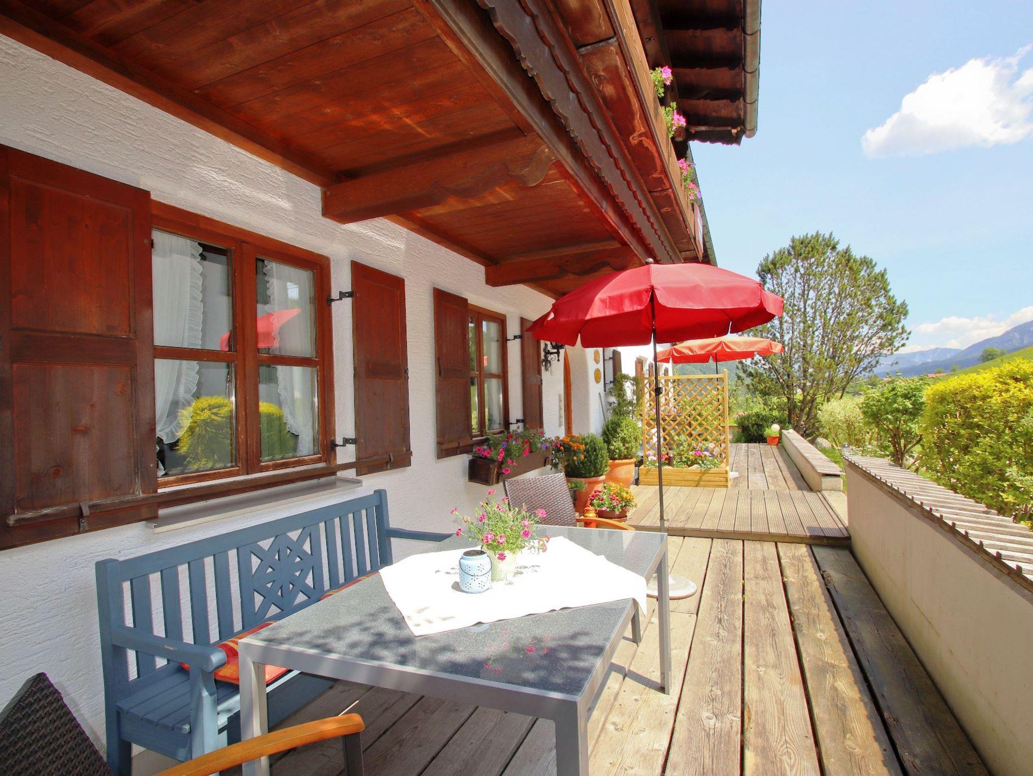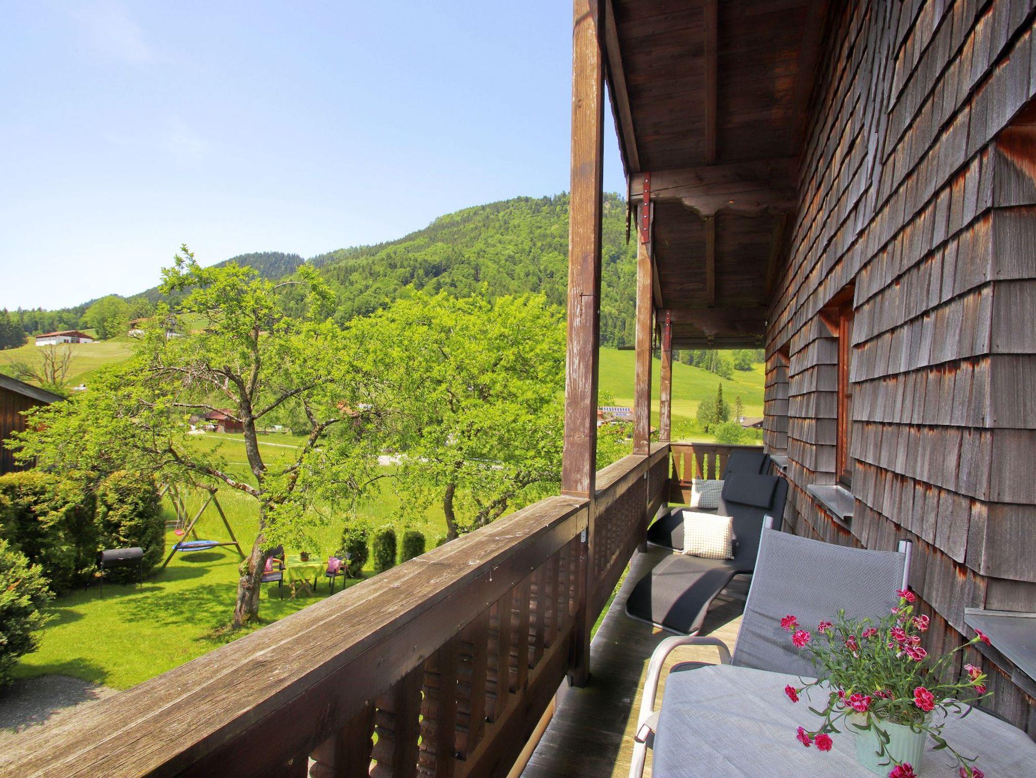 Unsere gemütliche Ferienwohnung liegt in der 1. Etage mit einem großen eigenen Balkon und Blick auf den Rauschberg. Der Balkon ist ausgerichtet Richtung Süd/Westen und die abendliche Sonne lädt für schöne Abendstunden ein.