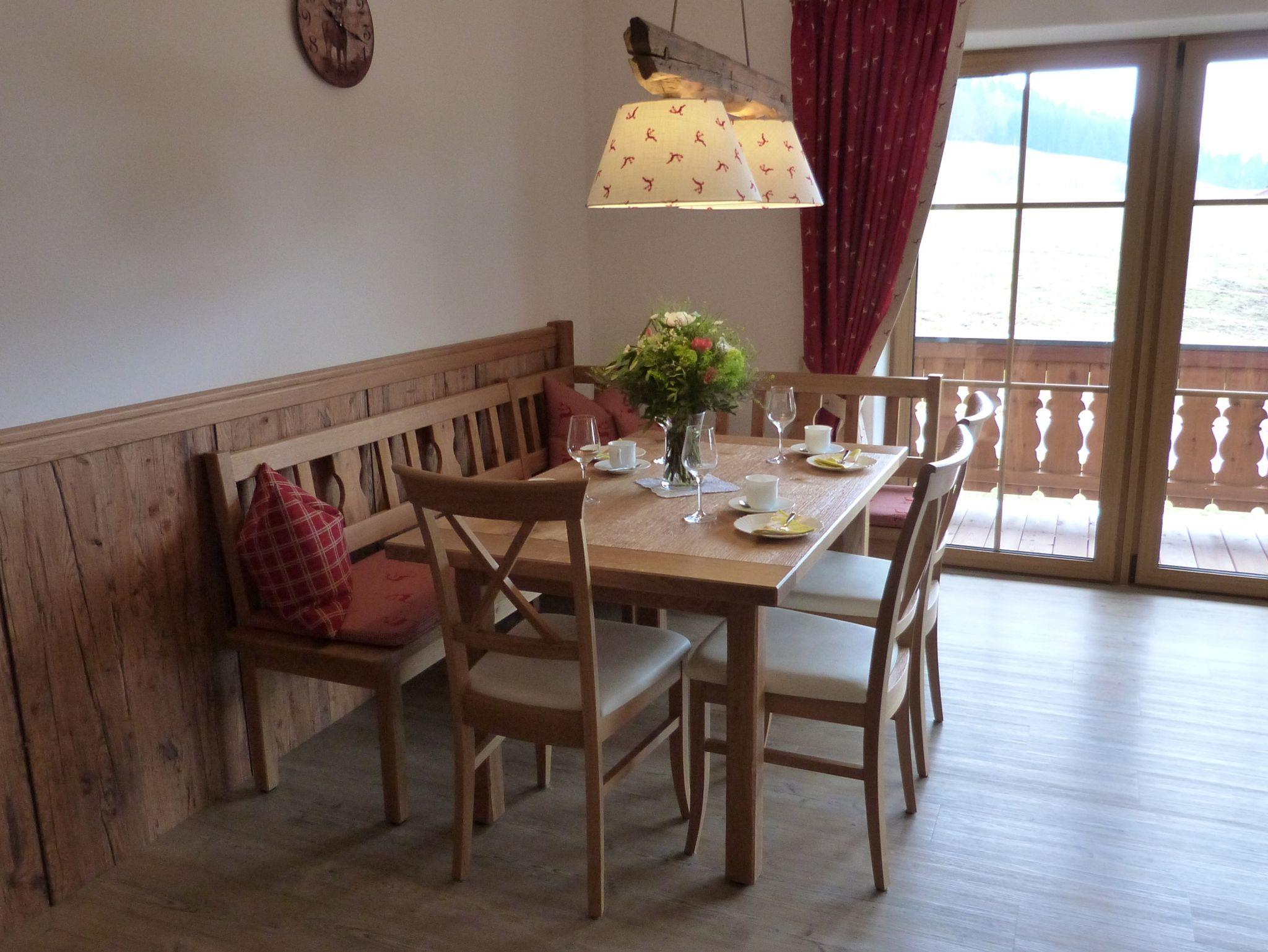 Im Neubau: Fewo Hörndlwand, 5 Sterne für 2-6 Personen, 130 qm Wohnfläche, großzügiger rustikaler Wohnraum, 3 Schlafzimmer, 2 Duschen, WC, stilvoller Essbereich und komplett ausgestattete Küche mit: Mikrowelle, Geschirrspüler, E-Herd, Eierkocher, Wasserkocher und Toaster, Sat - TV, Wlan - Anschluss und Stereoanlage, Balkon mit Sitzgarnitur, Handtücher und Geschirrtücher vorhanden.