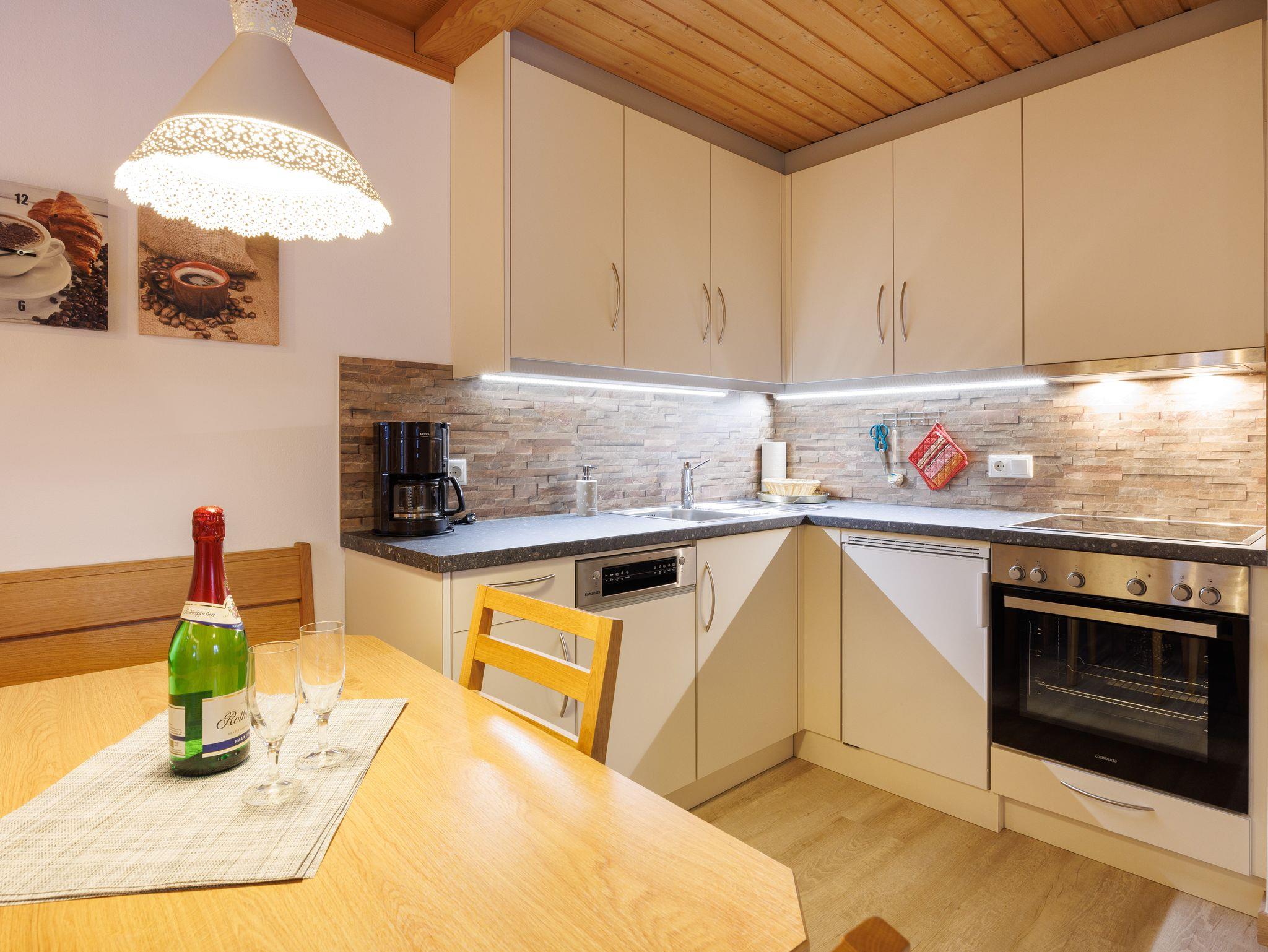 Wohnbereich mit gut ausgestatteter Küche und Essecke,
