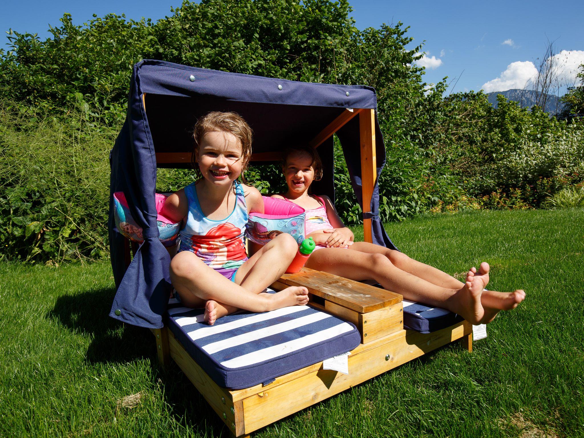 Familien Ferienwohnung mit 90 qm für bis zu 6 Personen im Zuhaus (Hanghaus) 2.OG am Schwimmteich gelegen. Großer Südbalkon. 2 Schlafzimmer mit Doppelbett, sowie ein Kinderschlafkoje mit Etagenbett (90x200 cm), 2 Bäder mit Dusche/WC, 1 extra WC. Große, vollausgestattete Küche mit Geschirrspüler, Backofen, Kühlschrank mit Gefrierfach und den nötigen Kleingeräten. Die Essecke in der Küche ist für 6 Personen geeignet. Extra Wohnzimmer. Nur in einem Schlafzimmer kann auch ein Babyreisebett aufgestellt werden.