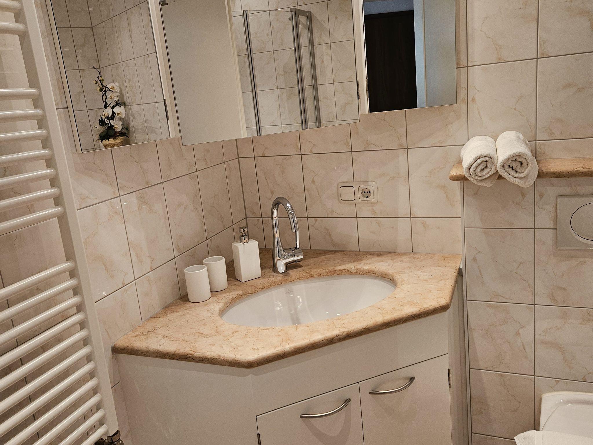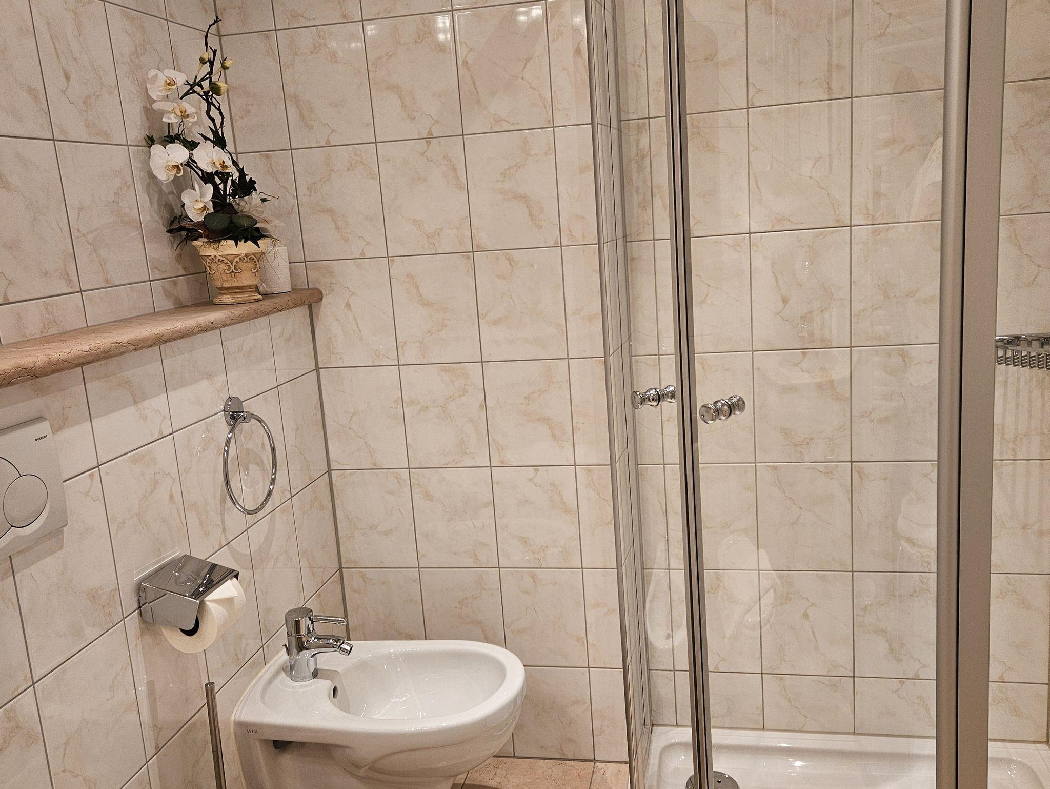 • Vollwertiges Bad mit Dusche, Handtuchtrockner, WC, Spiegelschrank & Föhn