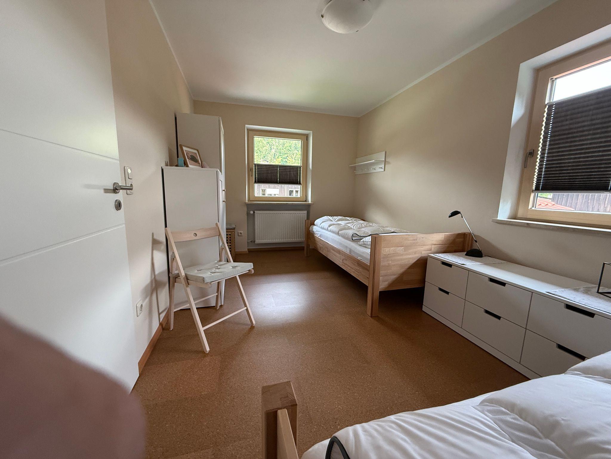 Im Obergeschoss befinden sich die 3 Schlafzimmer und 1 Badezimmer. 2 Schlafzimmer haben ein großes Doppelbett (180 x 200 cm). Das 3. Schlafzimmer verfügt über 2 Einzelbetten (90 x 200 cm), die auch zu einem Doppelbett zusammengeschoben werden können. Das helle Tageslichtbad im Obergeschoss verfügt über eine geräumige Dusche, ein Waschbecken und ein WC. Der überdachte Balkon mit tollem Blick auf die angrenzenden Berge lädt ebenfalls zum Entspannen ein.
