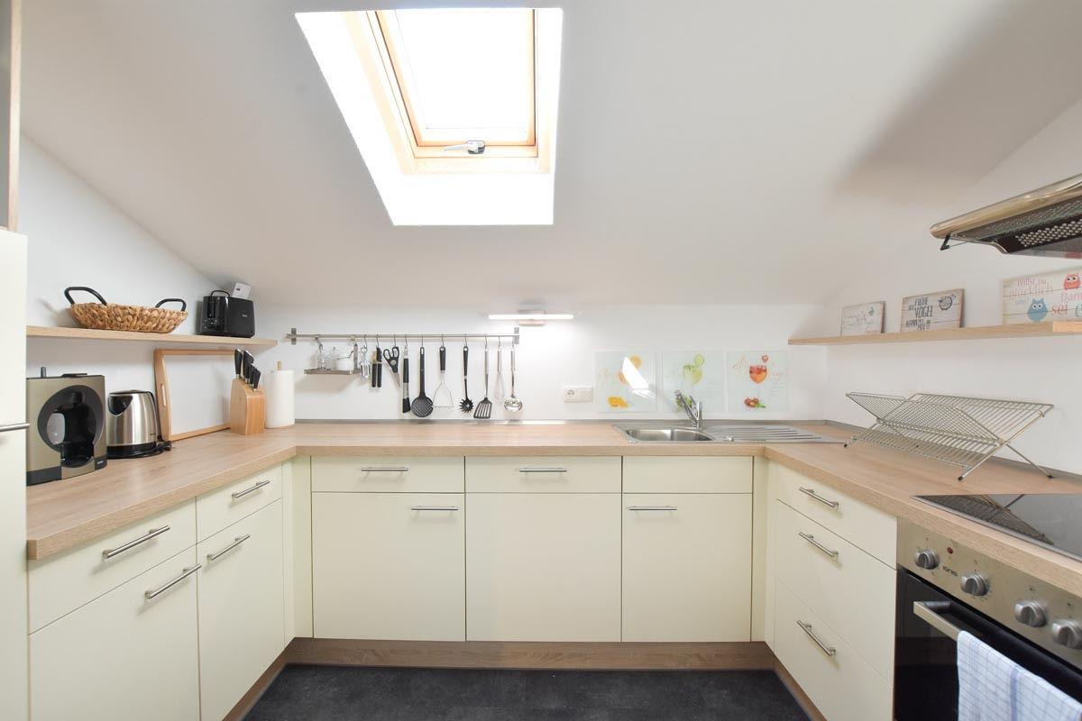 Voll ausgestattete Küche mit Herd, Backofen, Kühlschrank mit Gefrierfach, Mikrowelle, Kaffeemaschine und Nespresso.