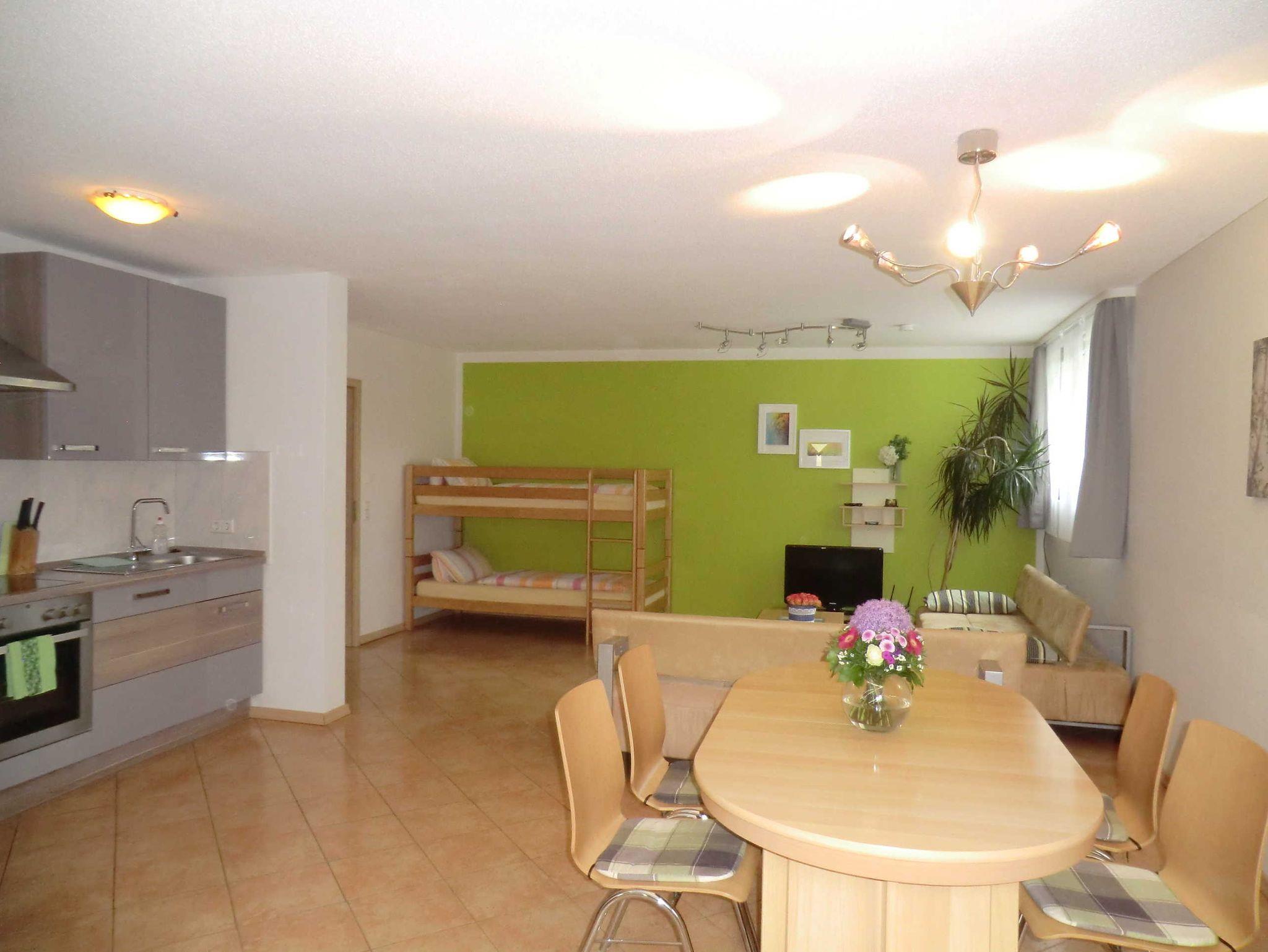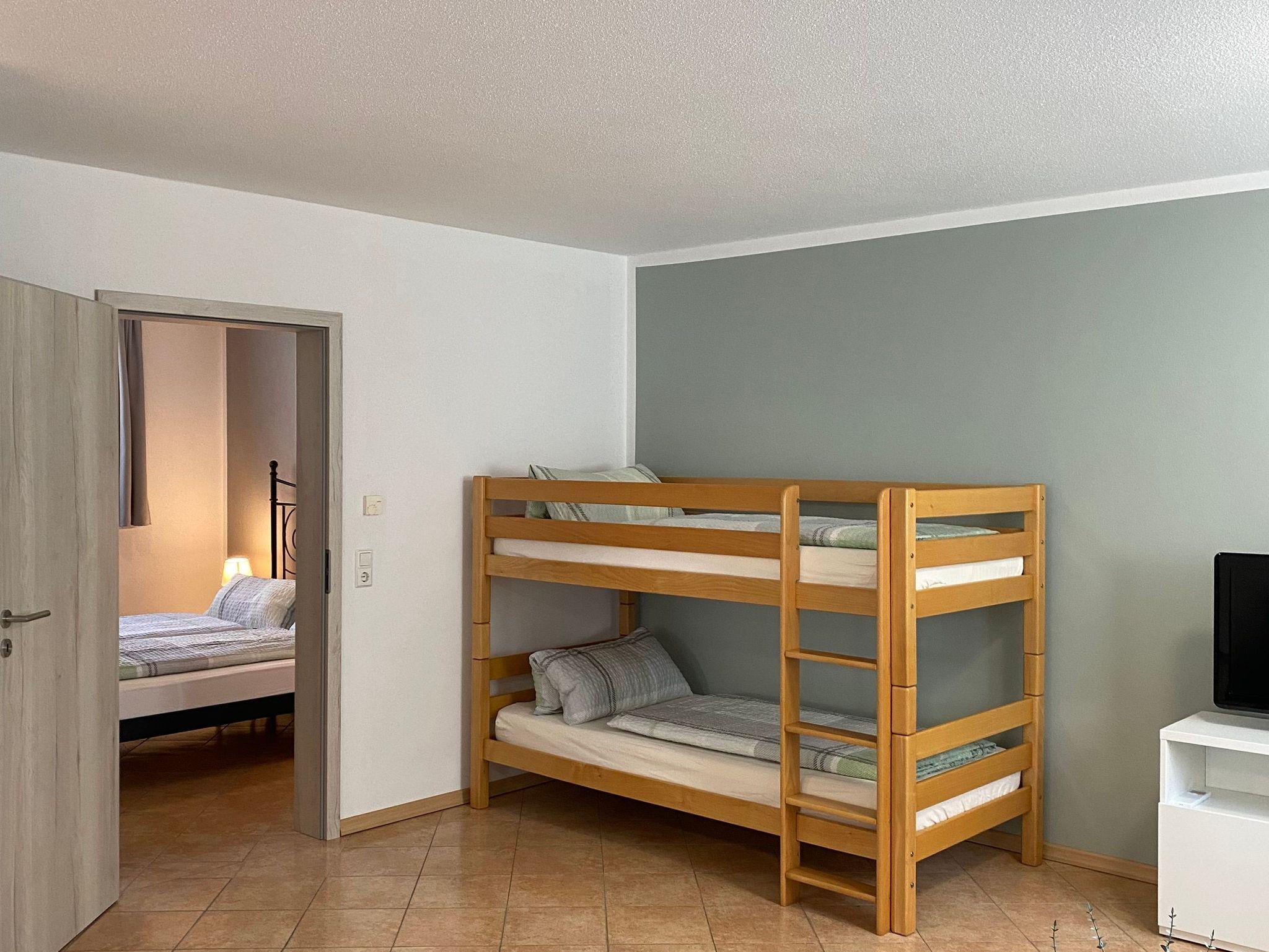 Ferienwohnung für 3-6 Personen, ca. 60 qm, 2 Wohn- und 1 Schlafraum, Küche, WC und Dusche.