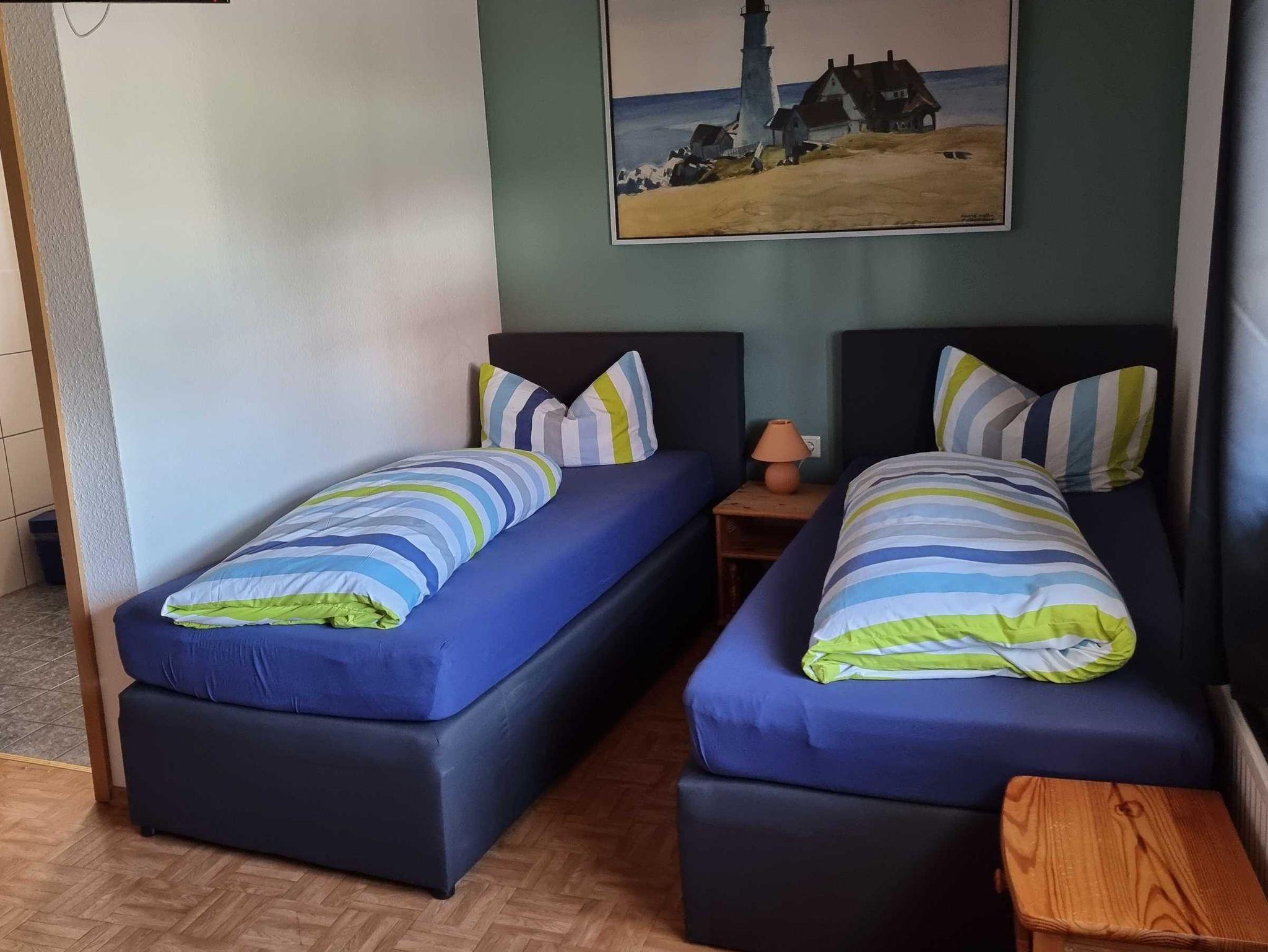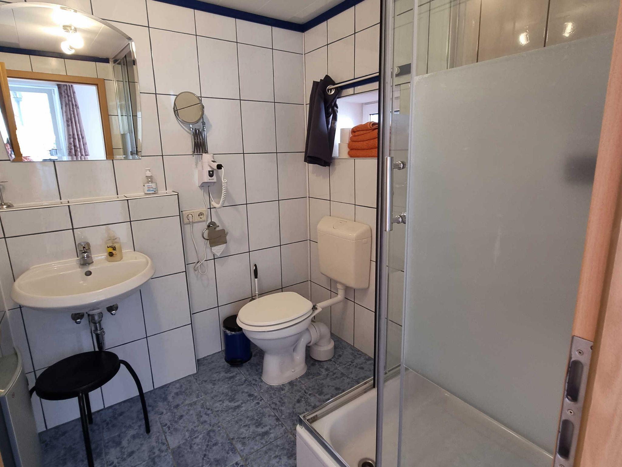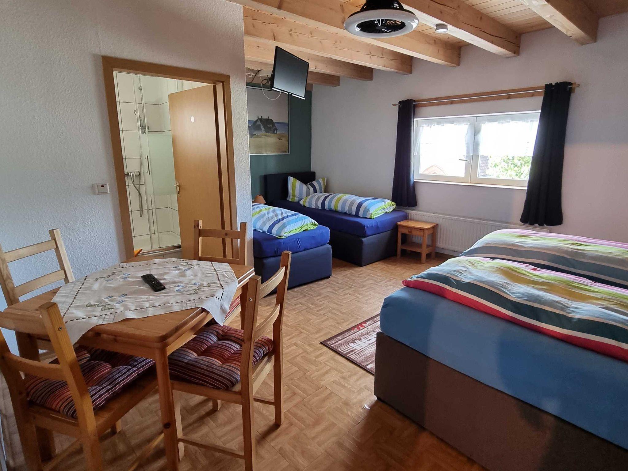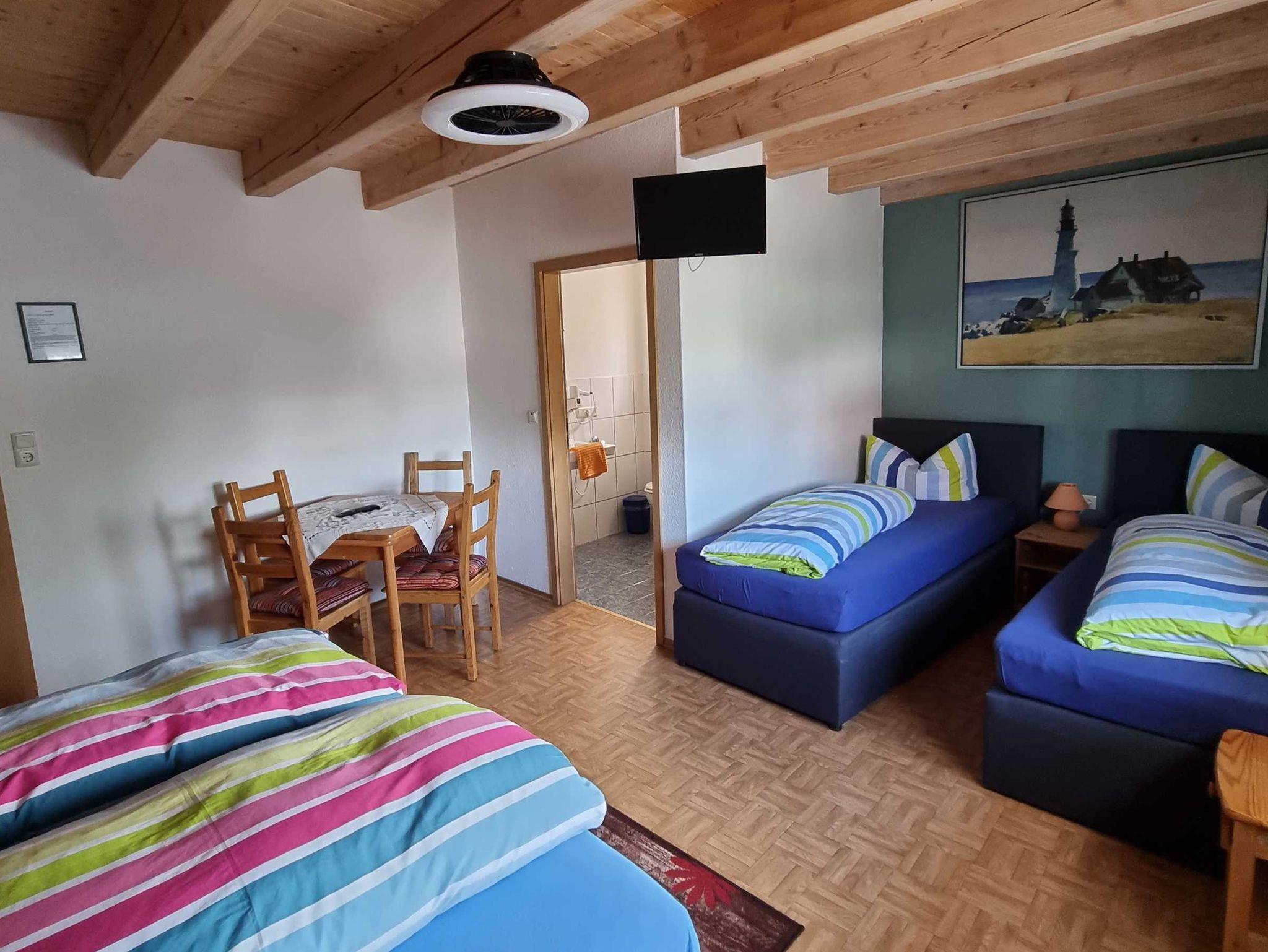 Vierrbettzimmer mit WC und Dusche, Kinder bis 3 Jahre übernachten im Bett der Eltern kostenfrei.