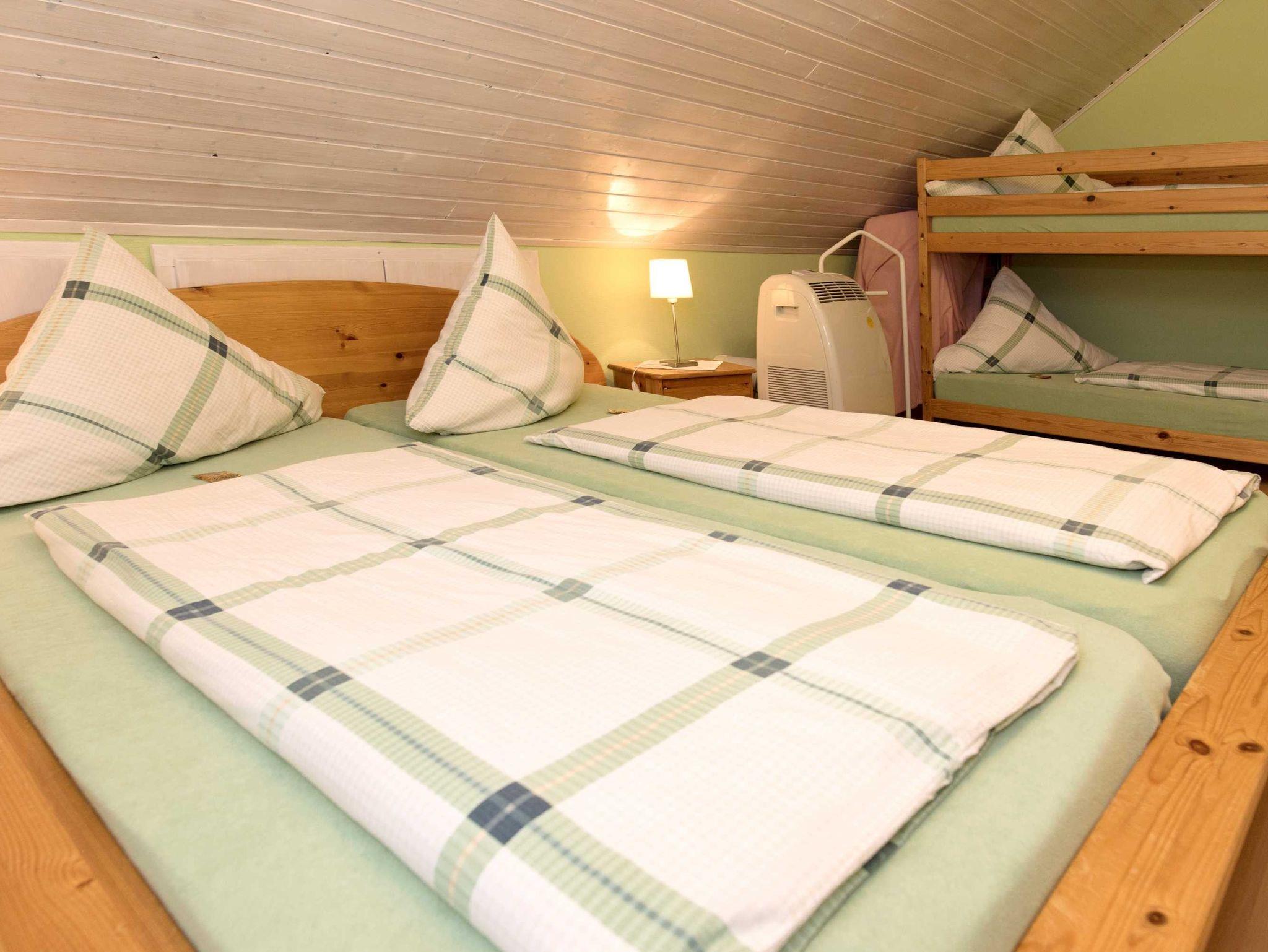 Ferienwohnung mit ca. 60 qm, Balkon, 2 Schlafzimmer (1 Zimmer mit Doppelbett und 1 Zimmer mit Doppelbett und Etagenbett), 1 Wohn-/Schlafzimmer mit Schlafcouch, Küchenzeile und Eßecke, Spülmaschine, Safe. Grillmöglichkeit und Spielplatz am Haus.