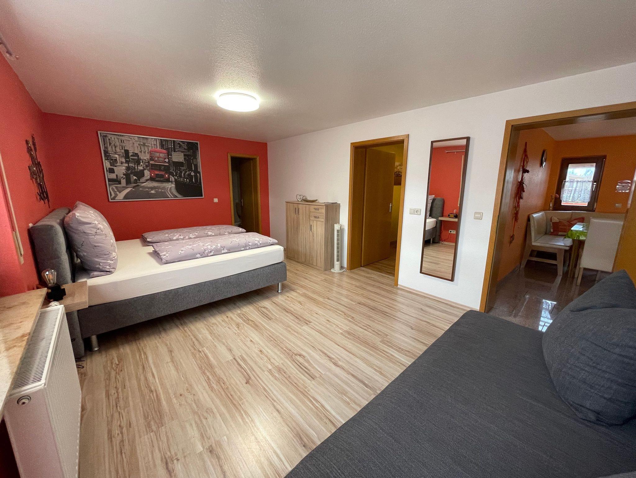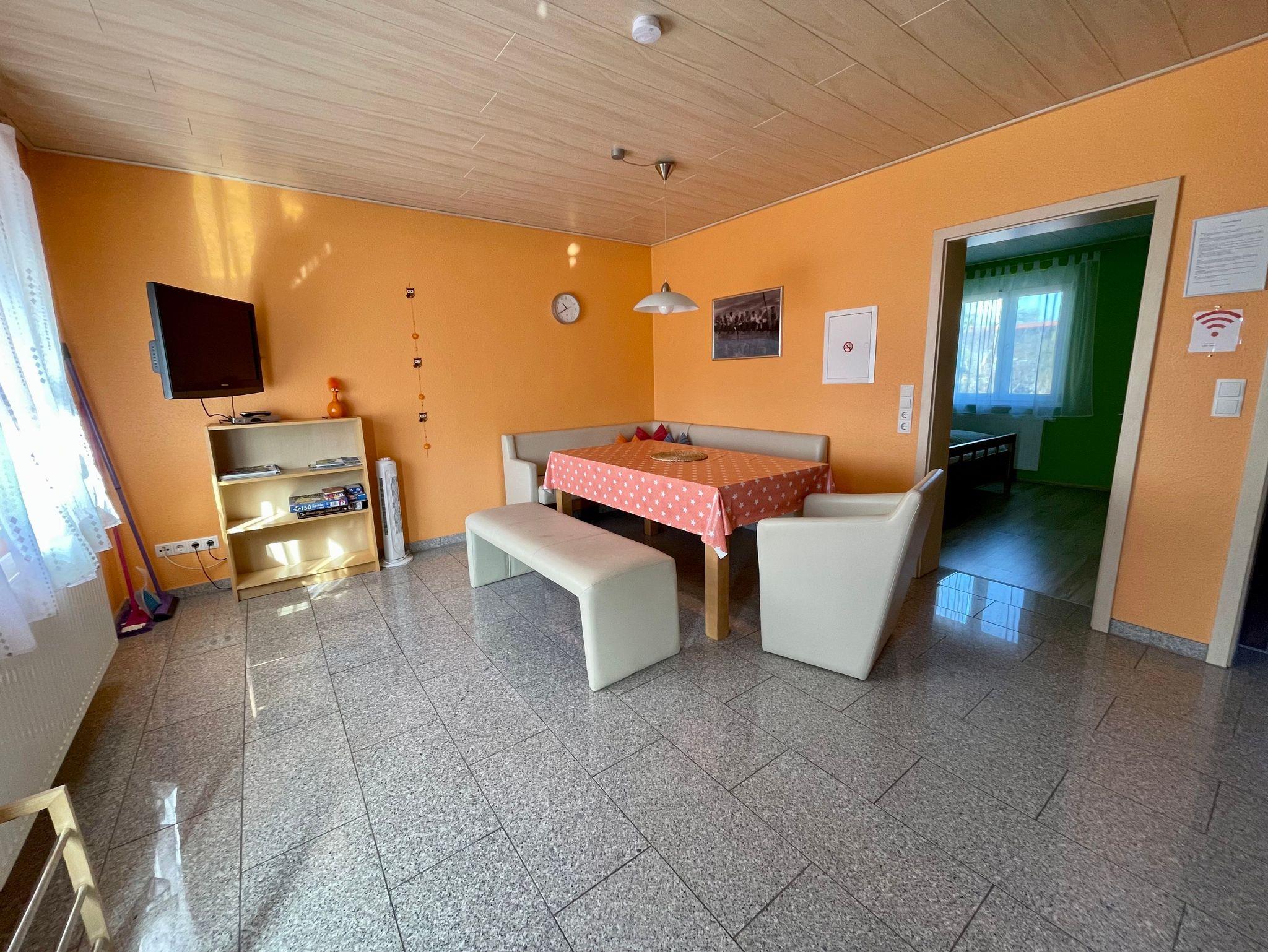 Mehrbettzimmer für bis zu 6 Personen. 1 Schlafzimmer mit Doppelbett und Schlafcouch und 1 Schlafzimmer mit französischem Bett. Vorraum mit Fernseher, Sitzecke und Kühlschrank.