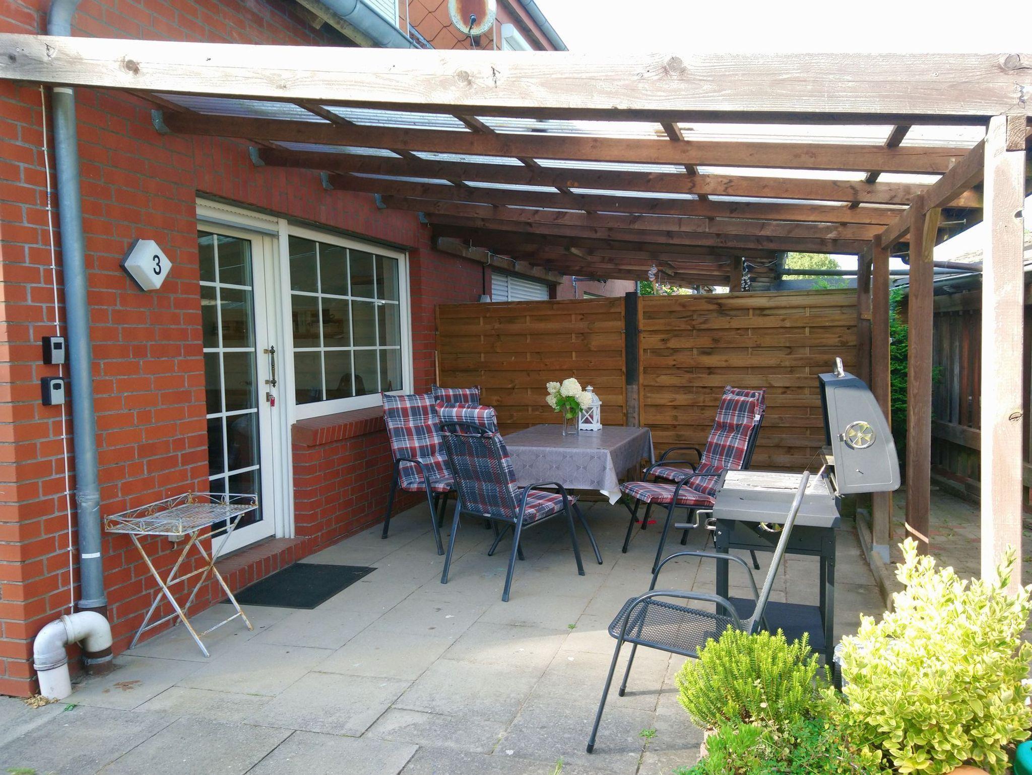 Die Erdgeschosswohnung hat einen eigenen Eingang, einen großen Wohn/Schlafraum, ein Bad mit neuer ebenerdiger Dusche und eine separate Küche. Die zirka 20 m² große überdachte Terrasse mit Gartenmöbeln und Grillmöglichkeit und die Liegewiese laden zum Relaxen ein.