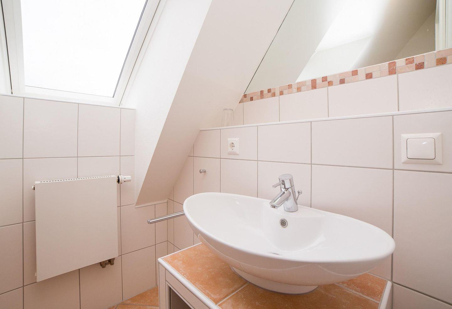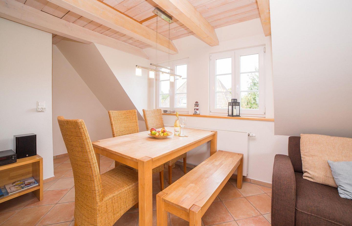 Die Wohnung Achterdeck befindet sich im Obergeschoss in süd-östlicher Ausrichtung und ist für bis zu vier Personen geeignet. Zusätzlich kann noch ein Kleinkind in einem Babybett schlafen. Die komplette Wohnung verfügt über 55 m² und erstreckt sich über 2 Etagen. Über eine Treppe gelangen Sie in ein schönes Wohnzimmer mit einem französischen Balkon. Die geräumige und komplett ausgestattete Küchenzeile ist in den Wohnbereich integriert und lässt mit Geschirrspüler, Backofen, Ceranfeld und Mikrowelle keine Wünsche offen. Auf der gleichen Ebene befinden sich ein Duschbad mit Fußbodenheizung und Handtuchheizkörper sowie ein Schlafzimmer mit einem Doppelbett. Im Spitzboden finden Sie ein weiteres Schlafzimmer mit einem Doppelbett sowie ein WC. In der Wohnung befinden sich ein Fernseher, ein Telefon, eine Stereoanlage mit DVD-Player sowie ein Internet-Anschluss. Im Garten steht eine Terrasse mit Gartenmöbeln zur Verfügung. Auf Anfrage werden Babybett und Hochstuhl zugestellt.