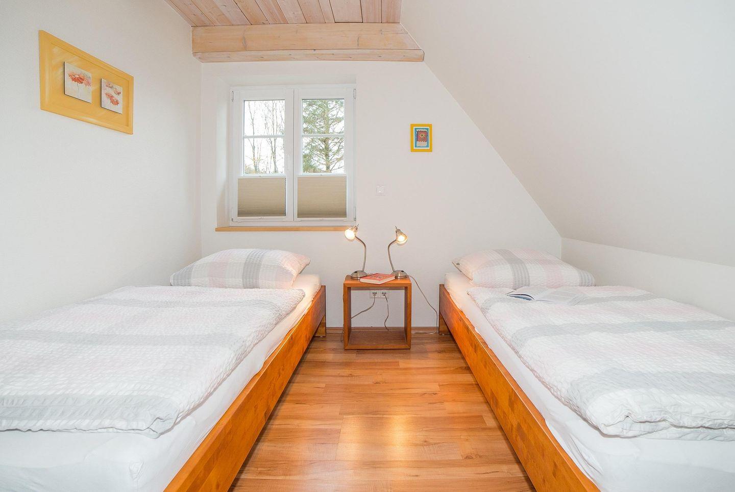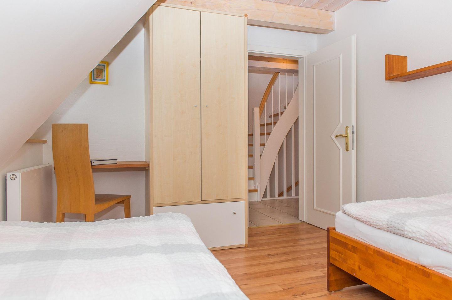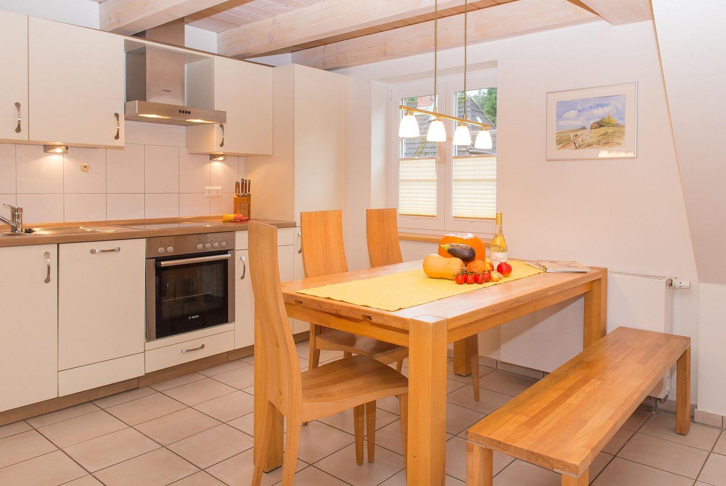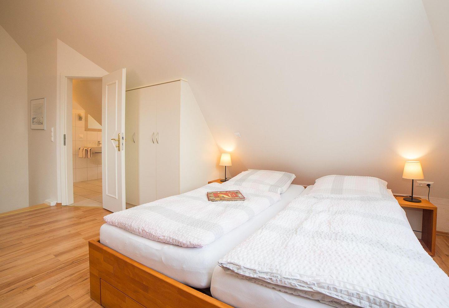 Die Wohnung Sonnendeck befindet sich im Obergeschoss in süd-westlicher Ausrichtung und ist für bis zu vier bis fünf Personen geeignet. Die Wohnung verfügt über 70 m² und erstreckt sich über zwei Etagen. Über eine Treppe gelangen Sie in ein großzügiges Wohnzimmer mit einem französischen Balkon. Die geräumige und komplett ausgestattete Küche ist in den Wohnbereich integriert und lässt mit Geschirrspüler, Backofen, Ceranfeld und Mikrowelle keine Wünsche offen. Auf der gleichen Ebene befinden sich ein Duschbad mit Fußbodenheizung sowie ein Schlafzimmer mit zwei einzelnen Betten. Das zweite Schlafzimmer im Spitzboden enthält ein Doppelbett und eine Einzelschlafmöglichkeit. Auf diesem Stockwerk ist ein weiteres Bad mit Badewanne und Fußbodenheizung vorhanden. In der Wohnung befinden sich ein Fernseher, ein Telefon, eine Stereoanlage mit DVD-Player sowie ein Internet-Anschluss. Im großen Garten steht eine Terrasse mit Gartenmöbeln zur Verfügung. Auf Anfrage werden Babybett und Hochstuhl zugestellt.