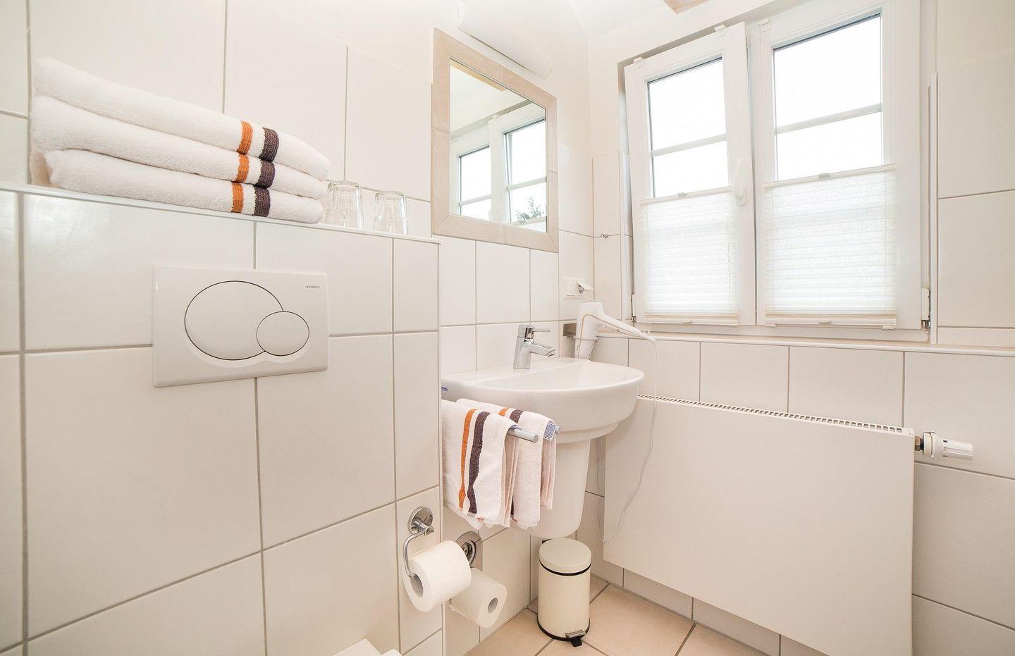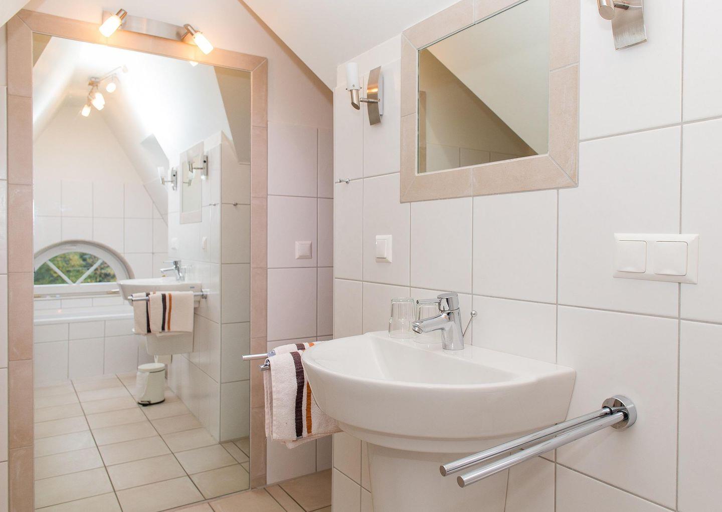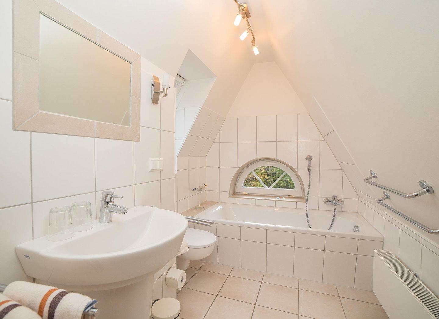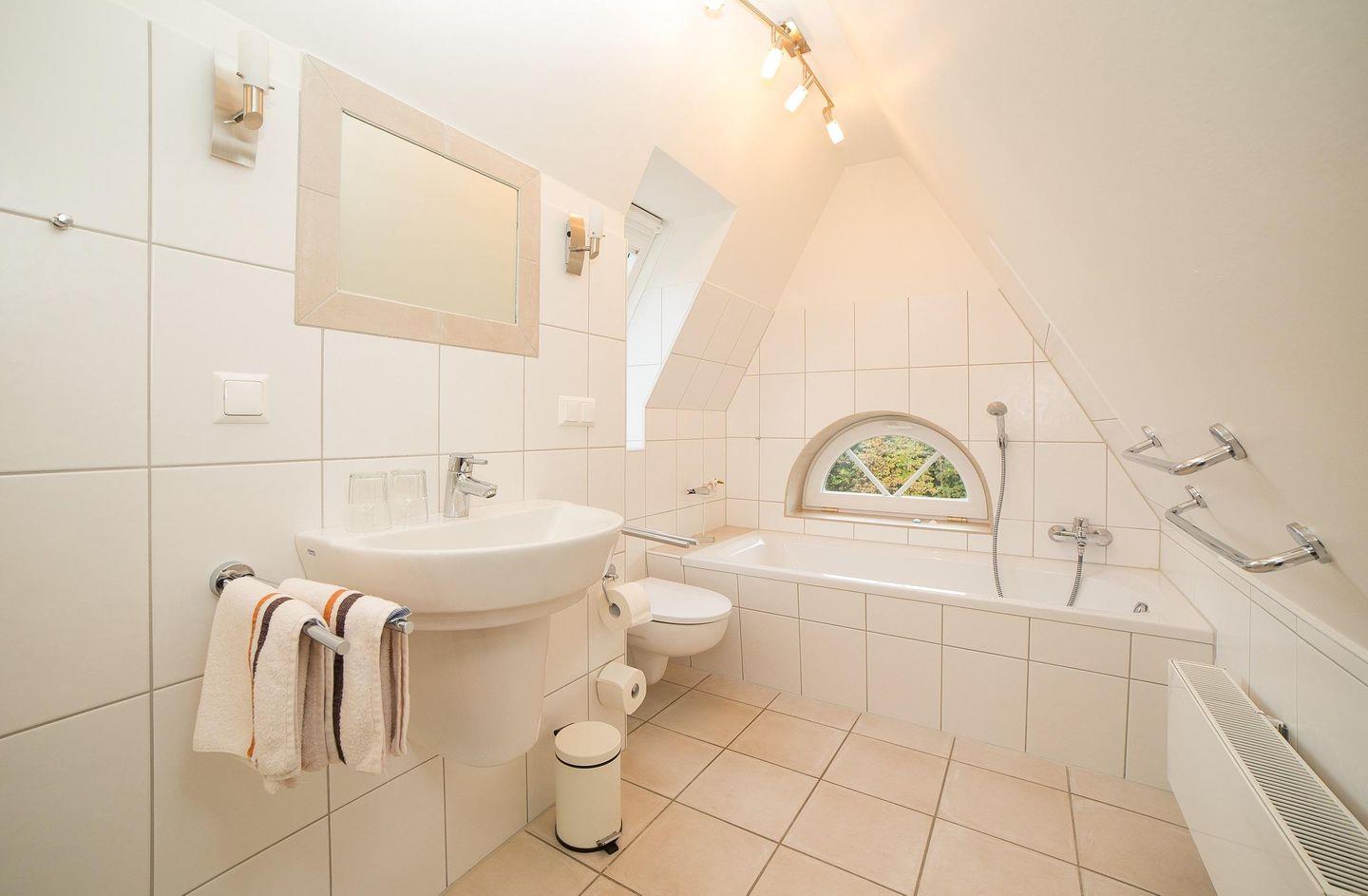 Die Wohnung Sonnendeck befindet sich im Obergeschoss in süd-westlicher Ausrichtung und ist für bis zu vier bis fünf Personen geeignet. Die Wohnung verfügt über 70 m² und erstreckt sich über zwei Etagen. Über eine Treppe gelangen Sie in ein großzügiges Wohnzimmer mit einem französischen Balkon. Die geräumige und komplett ausgestattete Küche ist in den Wohnbereich integriert und lässt mit Geschirrspüler, Backofen, Ceranfeld und Mikrowelle keine Wünsche offen. Auf der gleichen Ebene befinden sich ein Duschbad mit Fußbodenheizung sowie ein Schlafzimmer mit zwei einzelnen Betten. Das zweite Schlafzimmer im Spitzboden enthält ein Doppelbett und eine Einzelschlafmöglichkeit. Auf diesem Stockwerk ist ein weiteres Bad mit Badewanne und Fußbodenheizung vorhanden. In der Wohnung befinden sich ein Fernseher, ein Telefon, eine Stereoanlage mit DVD-Player sowie ein Internet-Anschluss. Im großen Garten steht eine Terrasse mit Gartenmöbeln zur Verfügung. Auf Anfrage werden Babybett und Hochstuhl zugestellt.