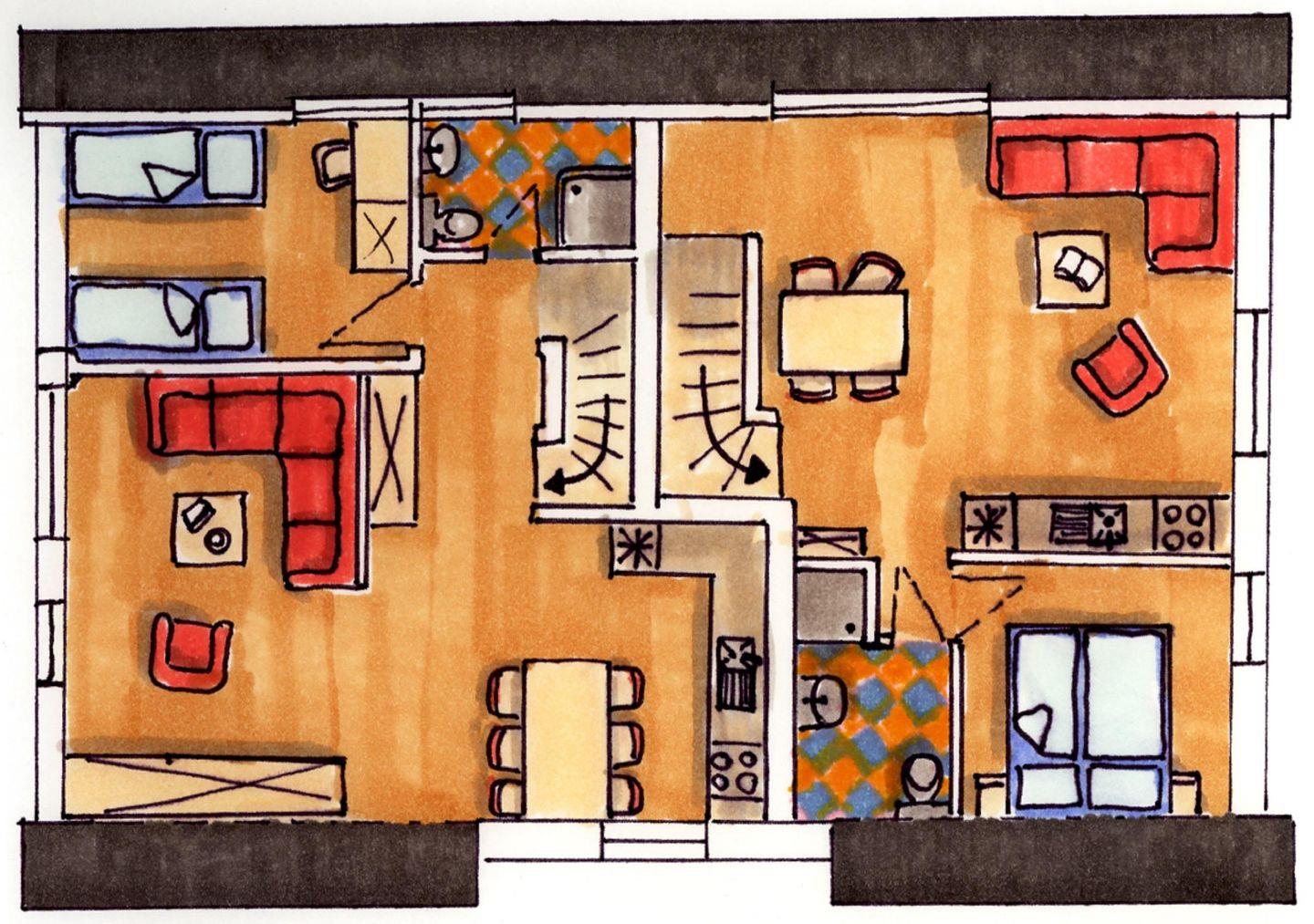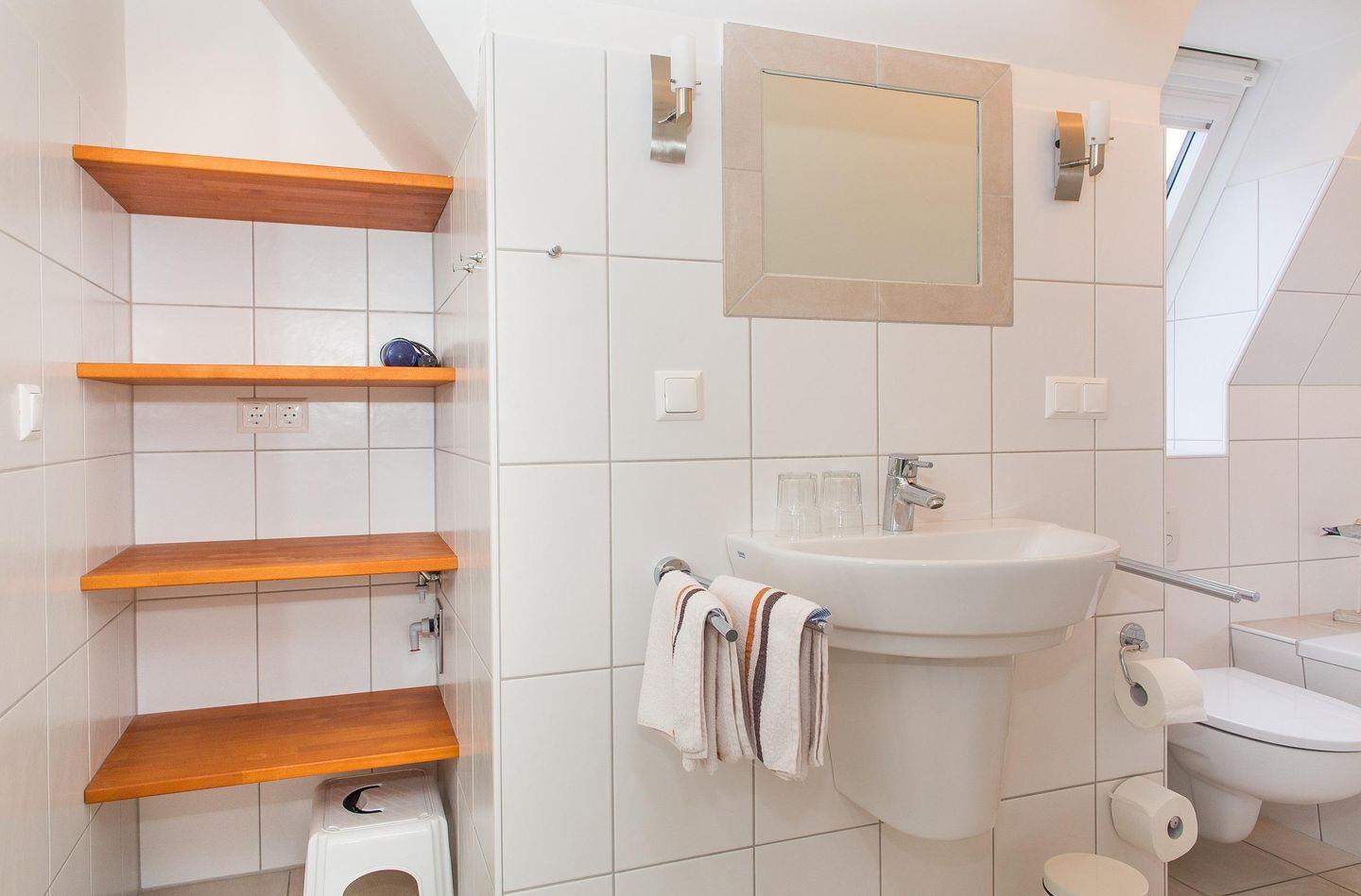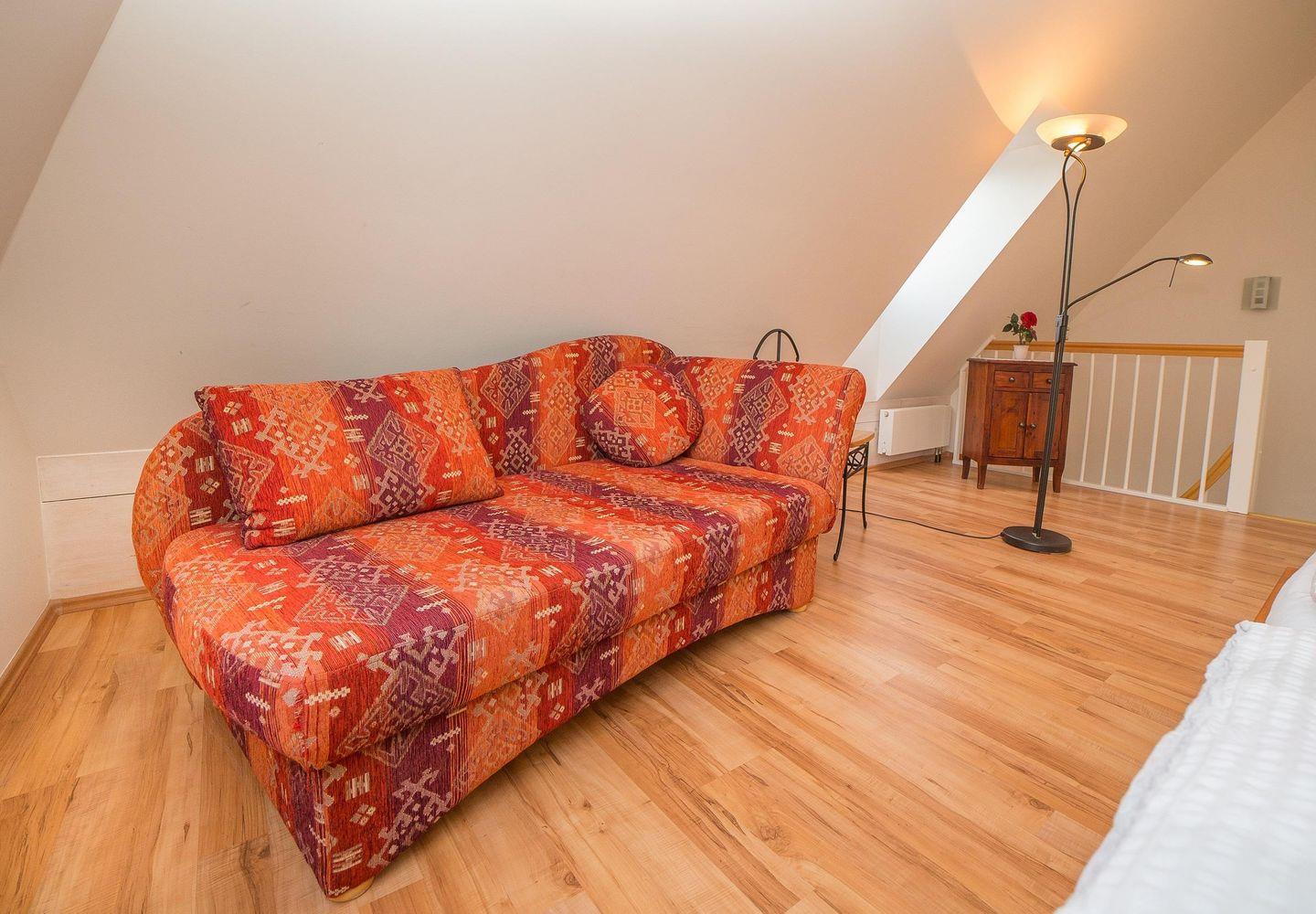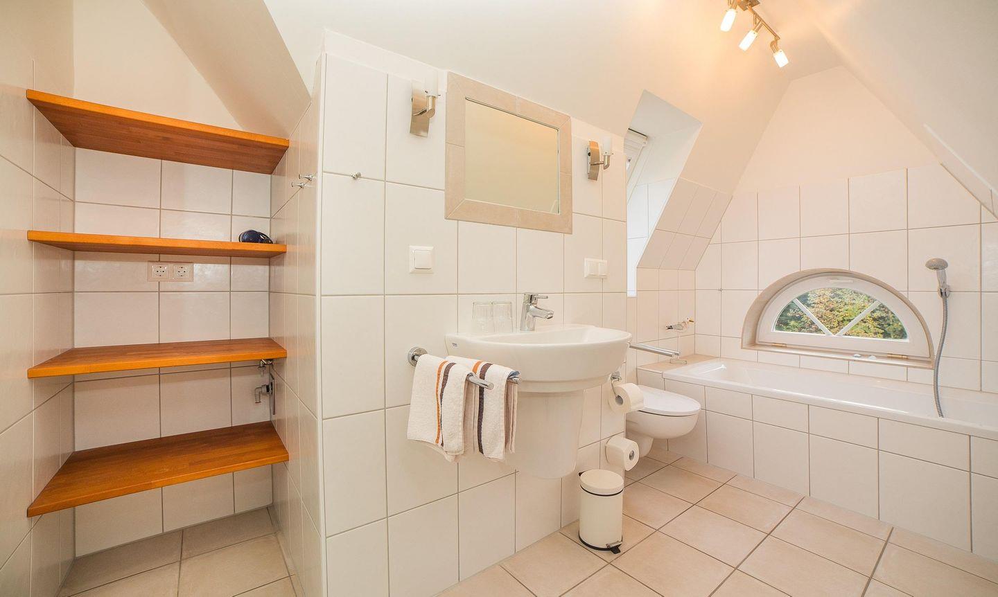 Die Wohnung Sonnendeck befindet sich im Obergeschoss in süd-westlicher Ausrichtung und ist für bis zu vier bis fünf Personen geeignet. Die Wohnung verfügt über 70 m² und erstreckt sich über zwei Etagen. Über eine Treppe gelangen Sie in ein großzügiges Wohnzimmer mit einem französischen Balkon. Die geräumige und komplett ausgestattete Küche ist in den Wohnbereich integriert und lässt mit Geschirrspüler, Backofen, Ceranfeld und Mikrowelle keine Wünsche offen. Auf der gleichen Ebene befinden sich ein Duschbad mit Fußbodenheizung sowie ein Schlafzimmer mit zwei einzelnen Betten. Das zweite Schlafzimmer im Spitzboden enthält ein Doppelbett und eine Einzelschlafmöglichkeit. Auf diesem Stockwerk ist ein weiteres Bad mit Badewanne und Fußbodenheizung vorhanden. In der Wohnung befinden sich ein Fernseher, ein Telefon, eine Stereoanlage mit DVD-Player sowie ein Internet-Anschluss. Im großen Garten steht eine Terrasse mit Gartenmöbeln zur Verfügung. Auf Anfrage werden Babybett und Hochstuhl zugestellt.