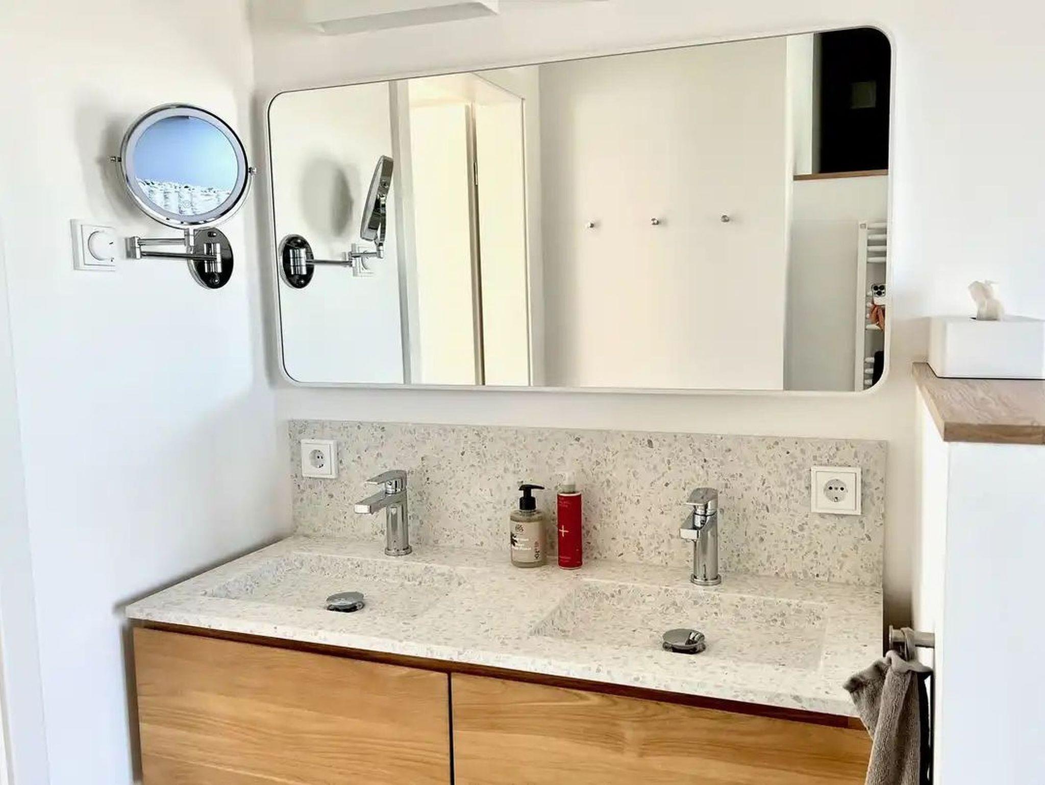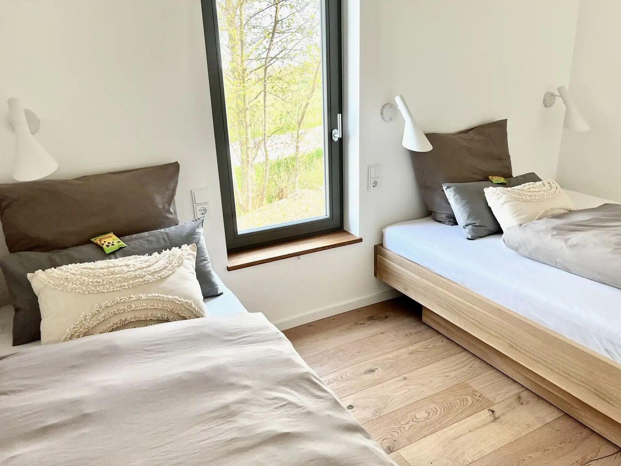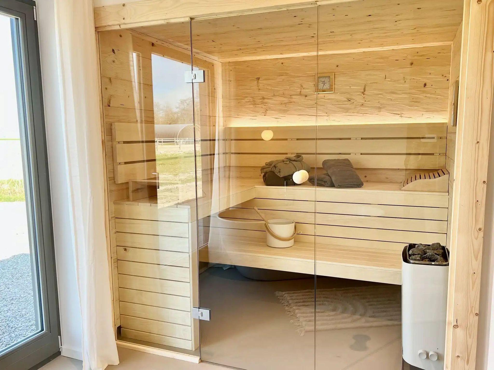 Moderne Architektur und Design trifft auf Natur Dieses exklusive Designhaus, nur 50 Meter vom Hof entfernt, wird Ostern 2025 fertiggestellt. Auf 100 m² Wohnfläche kombiniert es Komfort mit einem hellen, minimalistischen skandinavischen Wohnstil, der Leichtigkeit und Frische entstehen lässt. Zwei Schlafzimmer für 4-5 Personen, große Fenster mit Blick in die Natur und überdachte Terrassen schaffen einen idealen Rückzugsort für Familien und Freunde. Der großzügige Wohn- und Essbereich mit Kamin und die voll ausgestattete Küche mit Weinkühlschrank laden zum Genießen ein. Ein Wellnessbad mit freistehender Badewanne, Panoramablick und Sauna sowie ein Außenbereich mit Hot Tub und Außendusche runden das Wohlfühlerlebnis ab. Ein Ort, der Ruhe, Weite und Komfort vereint – Architektur zum Wohlfühlen!