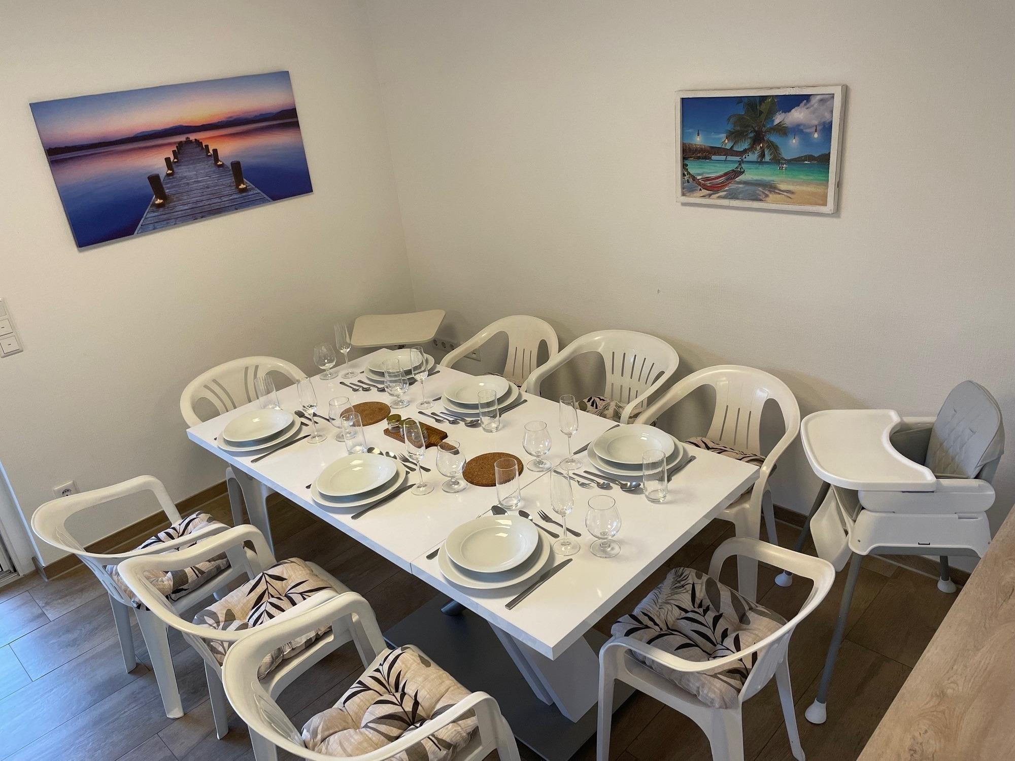 Wohnungsgröße: circa 70qm, 1 Schlafzimmer mit Doppelbett und geräumigem Kleiderschrank und Stellfläche für Ein-Personen-Zustellbett, Wohn-Esszimmer-Küche mit Einbauküche einer Eckbank mit 2 dazu passenden Stühlen und einem Ausziehtisch und in der Küche die wichtigsten Koch-Utensilien, Geschirr, Gläser und Besteck. WLAN & TV-Gerät. Couch-Schlaflandschaft für 2-3 Personen, Bad/WC/Dusche ebenerdig & barrierefrei