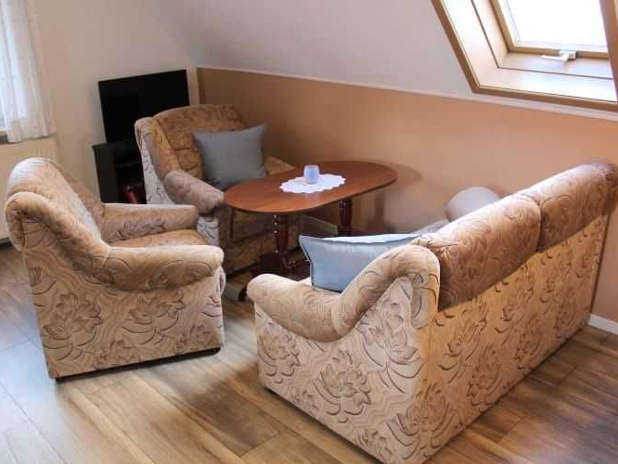 - 1 Wohnzimmer mit TV und HiFi + Aufbettung auf der Schlafcouch