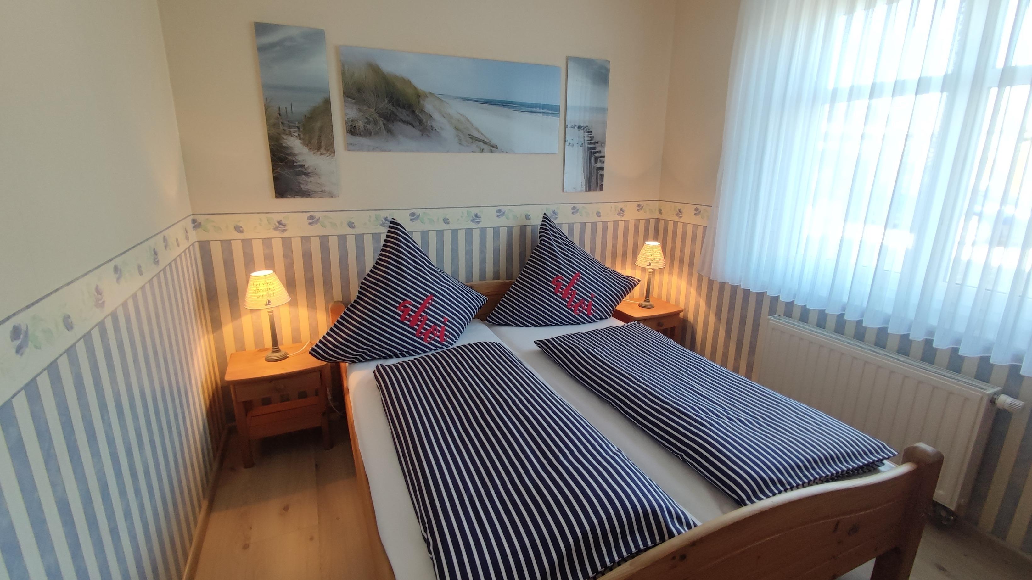 Für einen erholsamen Schlaf stehen Ihnen unsere 2 Schlafzimmer, die mit Vollholzmöbeln eingerichtet sind, zur Verfügung. In beiden Schlafzimmern (1 x ebenerdig und 1 x im Dachgeschoss) stehen Ehebetten mit Nachtschränken und jeweils einem Kleiderschrank. Die Matratzen, die frische Luft und die himmlische Ruhe machen aus unseren Gästen richtige „Langschläfer“. So soll Urlaub sein! In dem großen Schlafzimmer lässt sich mühelos ein großes Kinderbett mit aufstellen.