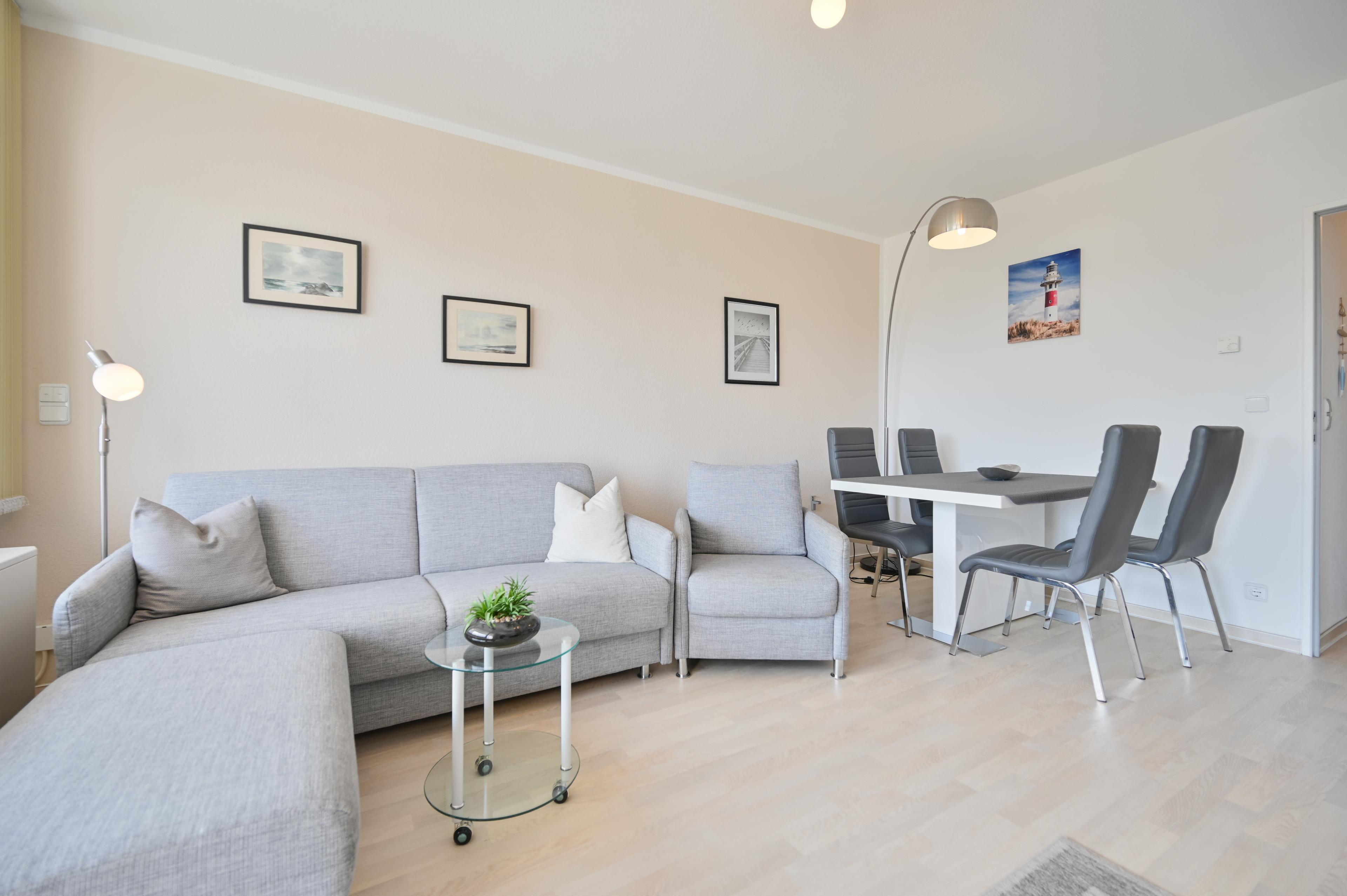 Im geschmackvoll eingerichteten Wohn-/Essbereich befindet sich ein großer Esstisch, der auch gut für gemütliche Spieleabende geeignet ist sowie eine bequeme Schlafcouch (1,40 x 2,00 m). Außerdem gibt es eine Stereoanlage und einen Flachbildschirmfernseher mit Sat-Empfang.