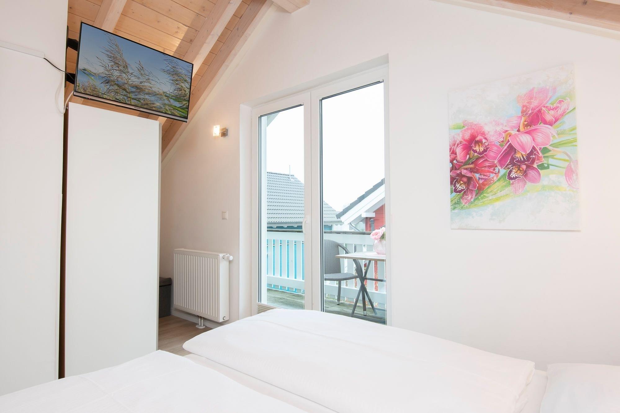 Schlafzimmer 1: Doppelbett (2x 80x200 cm), TV, Kleiderschrank, Lichtschutzplissees