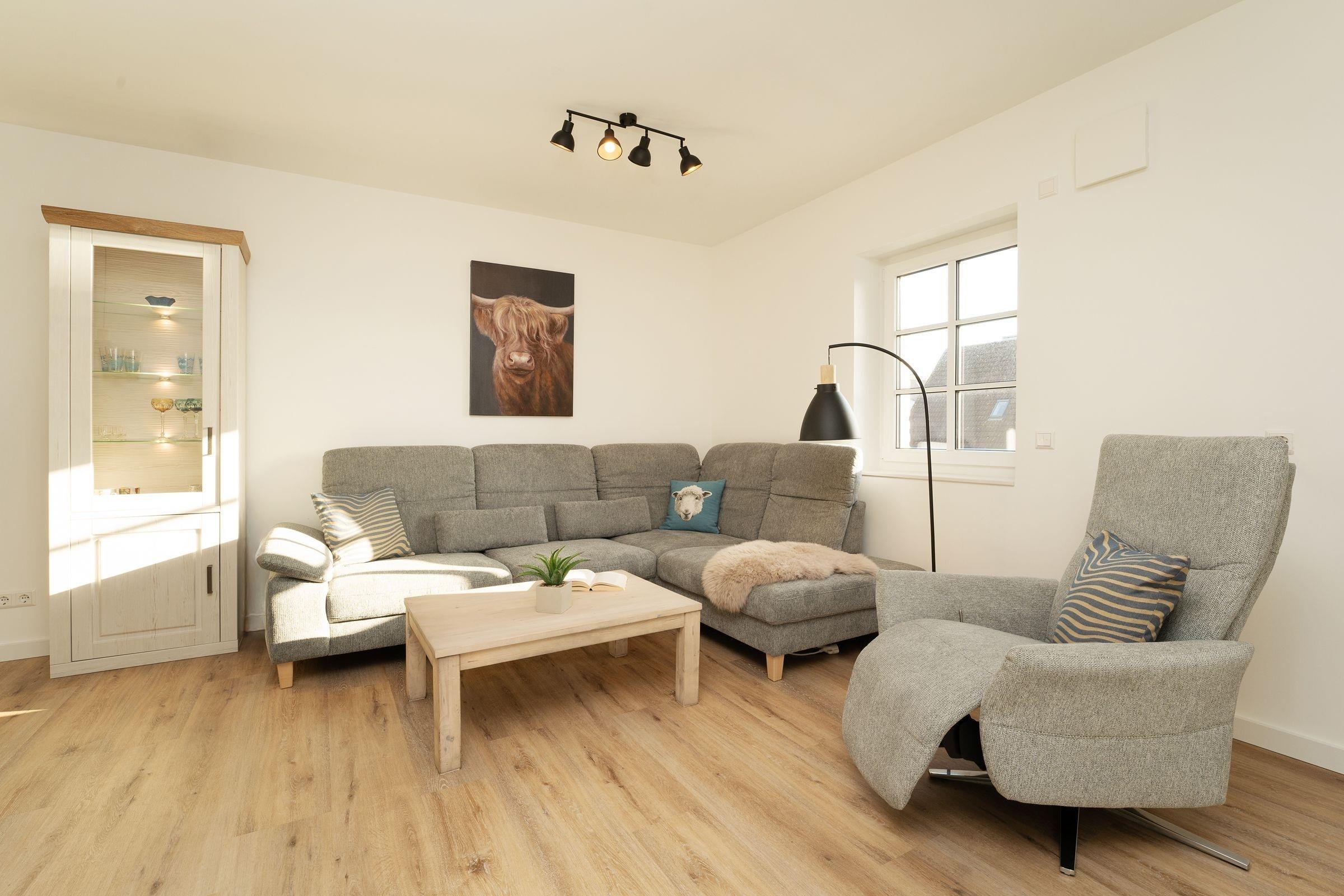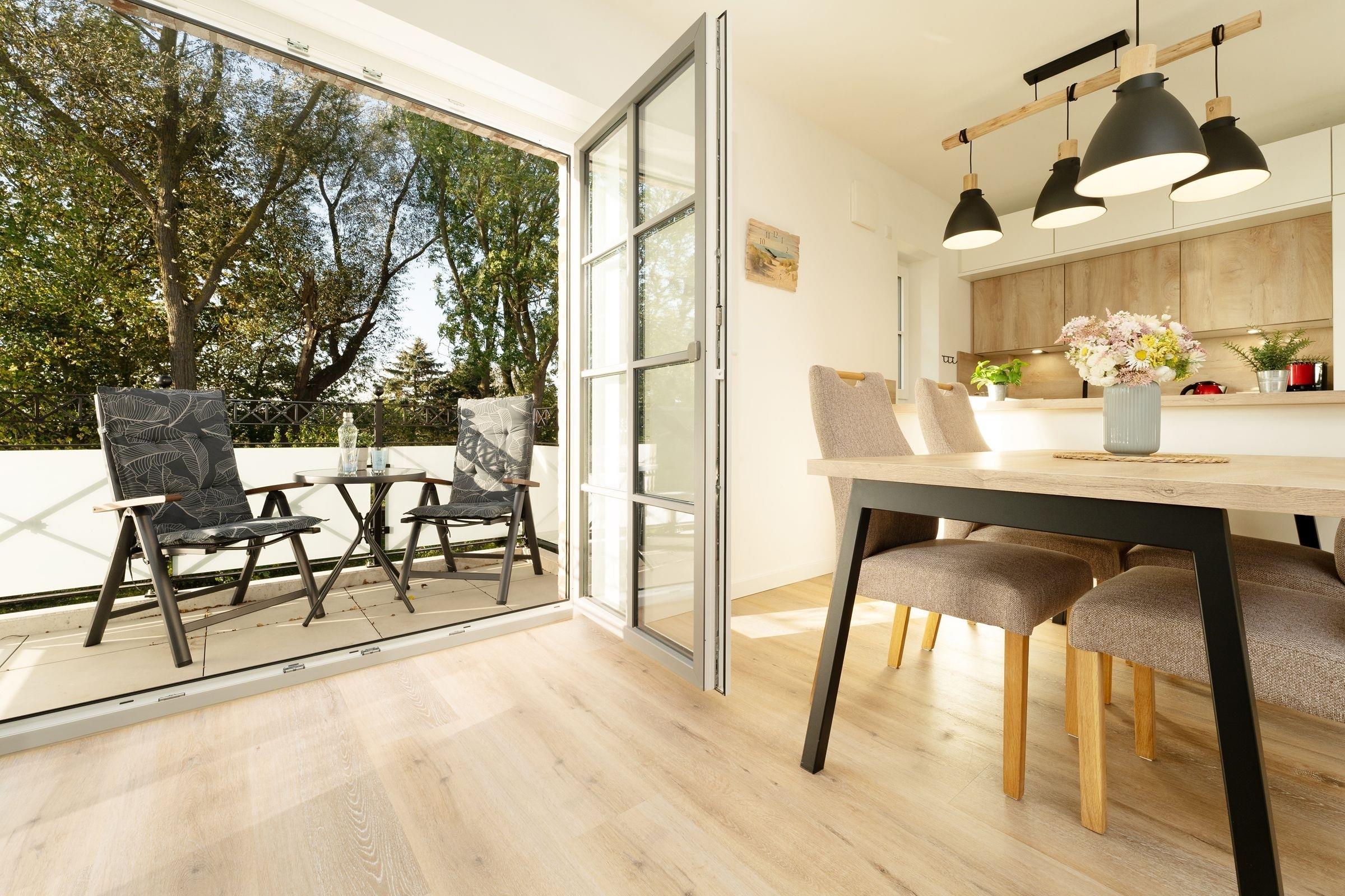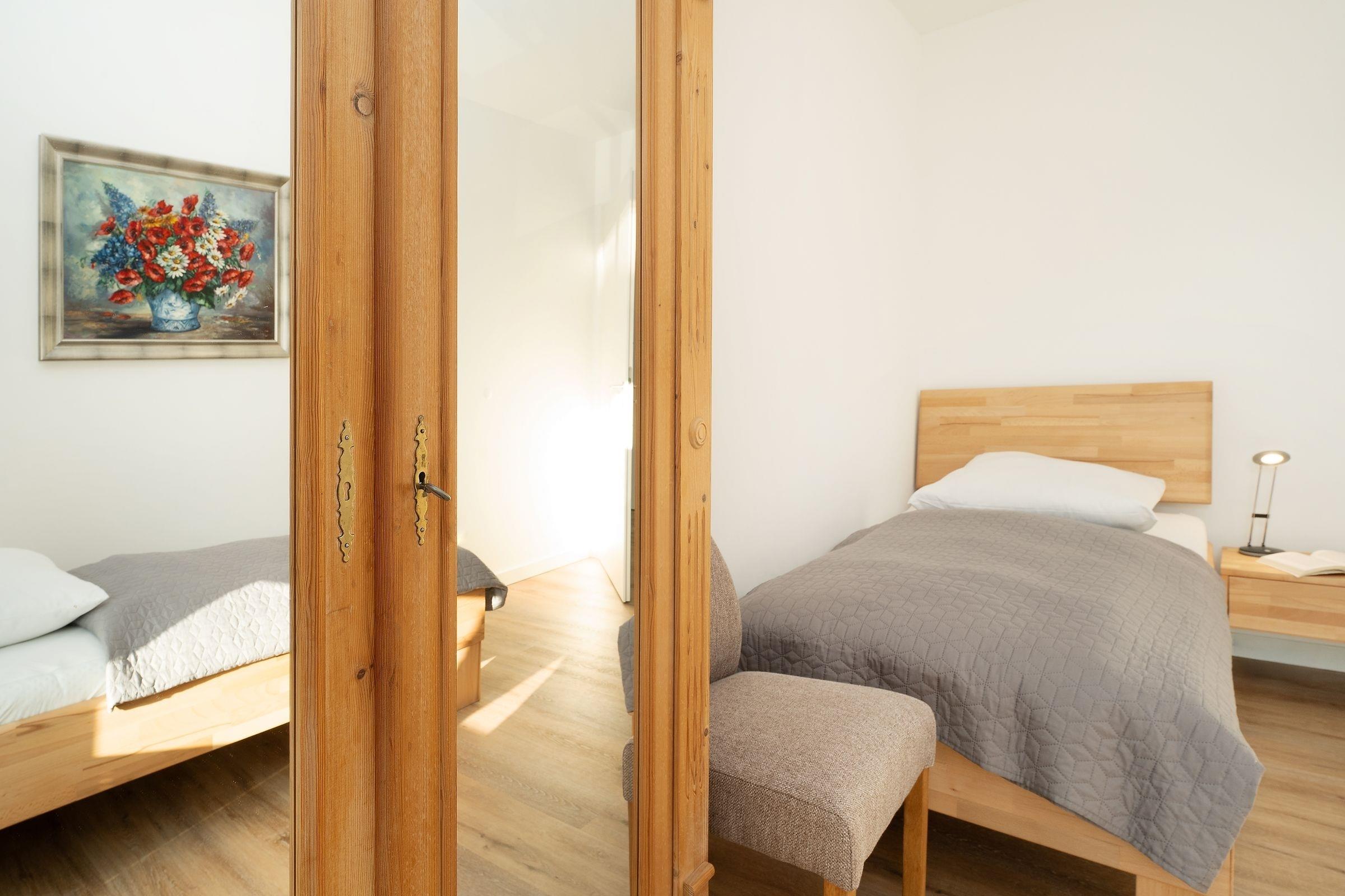 Herzlich willkommen! Ihr stilvolles Zuhause auf Zeit verwöhnt Sie mit einer edlen und gleichzeitig gemütlichen Einrichtung. Machen Sie es sich vor dem TV bequem oder genießen Sie die Sonnenstrahlen auf dem möblierten Südbalkon. Die gute Seeluft macht natürlich hungrig. Die offene, moderne Küche mit Induktionsherd, Mikrowelle und Spülmaschine bietet Ihnen viele Extras, die Sie begeistern werden. Für die Nacht stehen Ihnen ein Schlafzimmer mit einem Doppelbett (2x 90x200 cm) sowie ein Schlafzimmer mit zwei Einzelbetten (je 100x200 cm) zur Verfügung. Verdunkelt wird jeweils mit Außenrollläden. Das tageslichthelle Bad mit bodengleicher Dusche, Handtuchwärmer und Fußbodenheizung lässt keine Wünsche offen, um gut in den neuen Urlaubstag zu starten.
