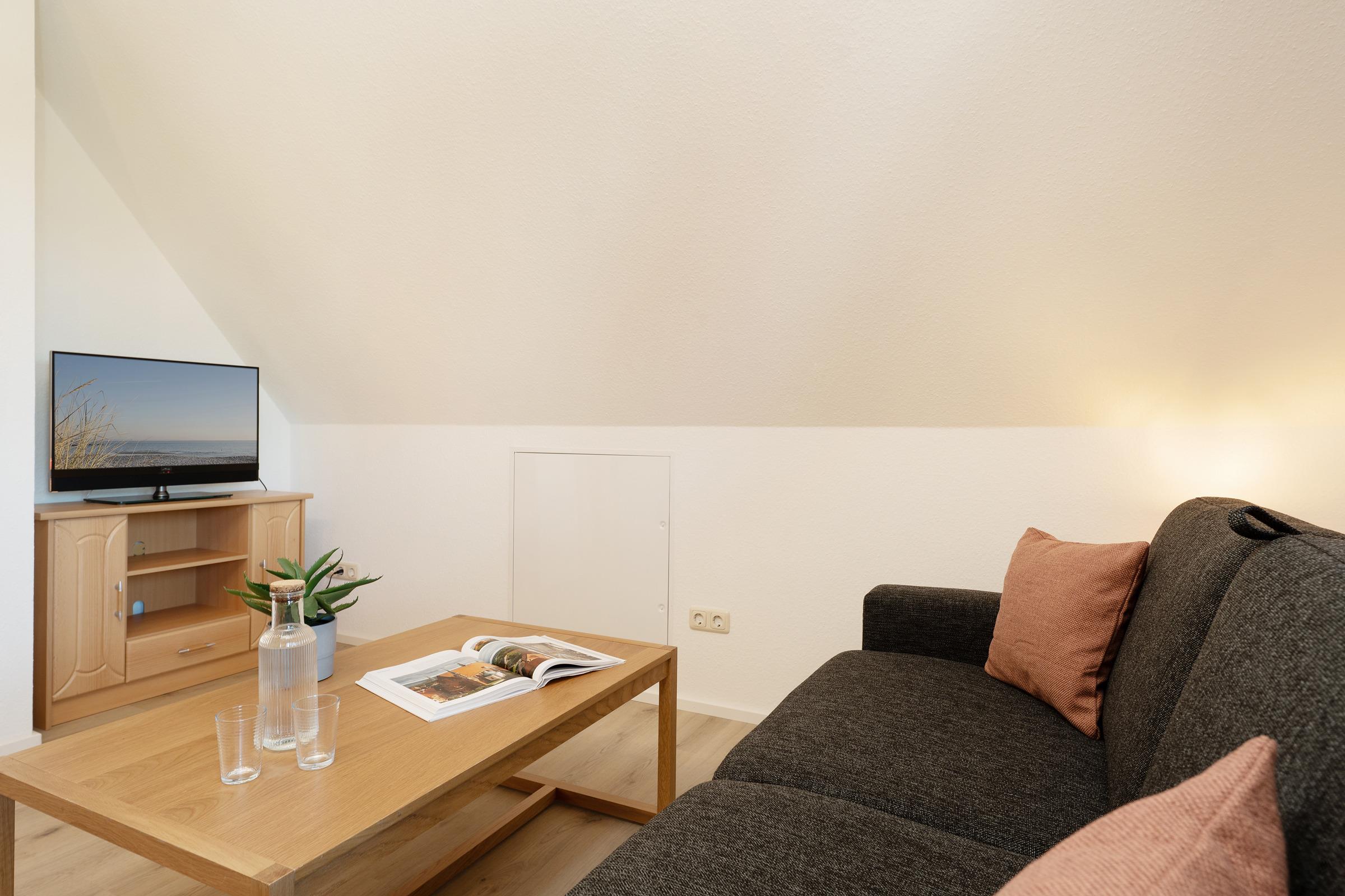 Schlafzimmer 3 (OG): 1 Schlafsofa (ca. 140x200 cm), Kleiderschrank, TV, Verdunkelung: Rollo, Platz für ein Babybett vorhanden