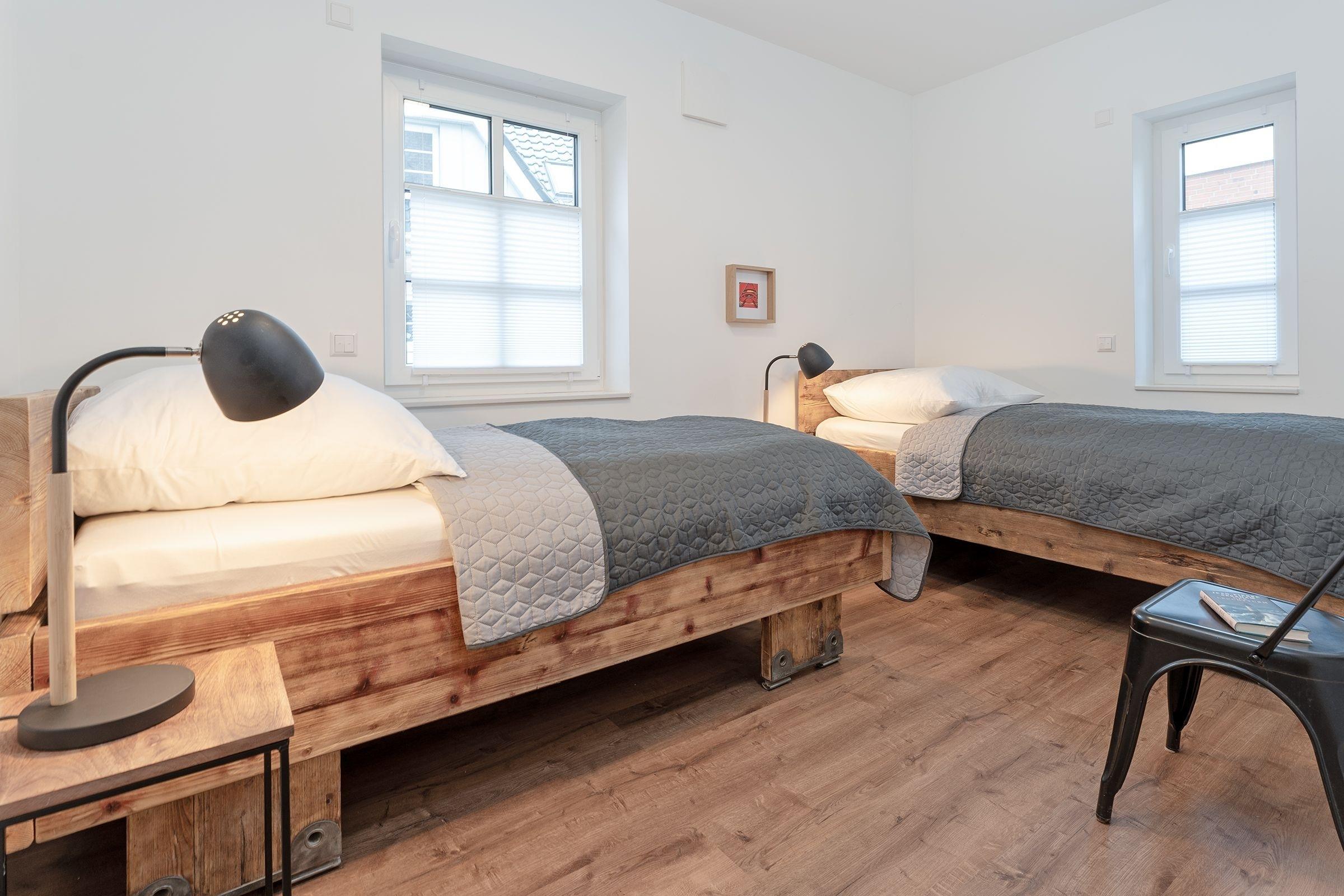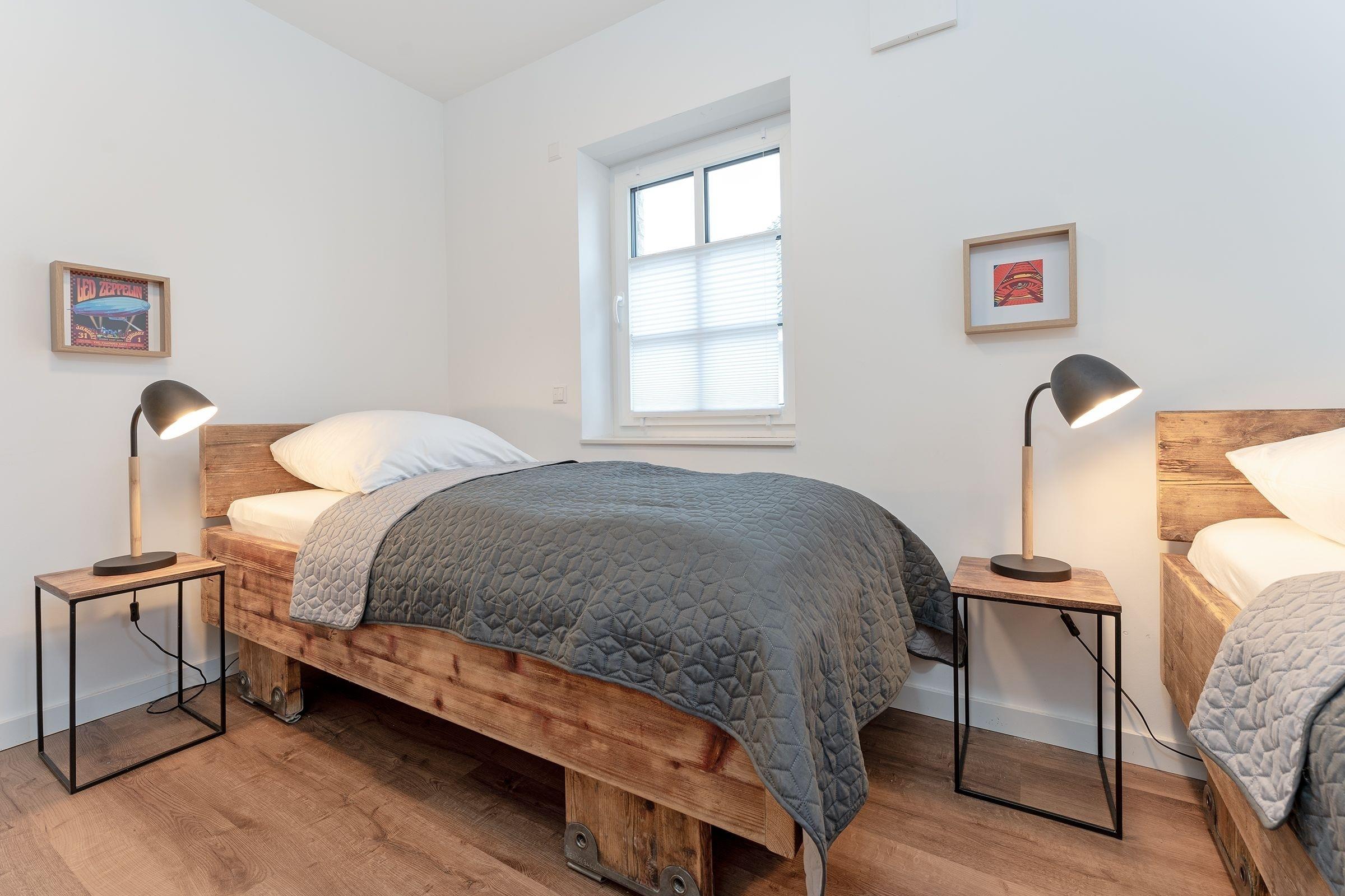 Schlafzimmer 2: 2 Einzelbetten (je 90x200 cm), Kleiderschrank, Verdunkelung: Rollo, kein Platz für Babybett vorhanden