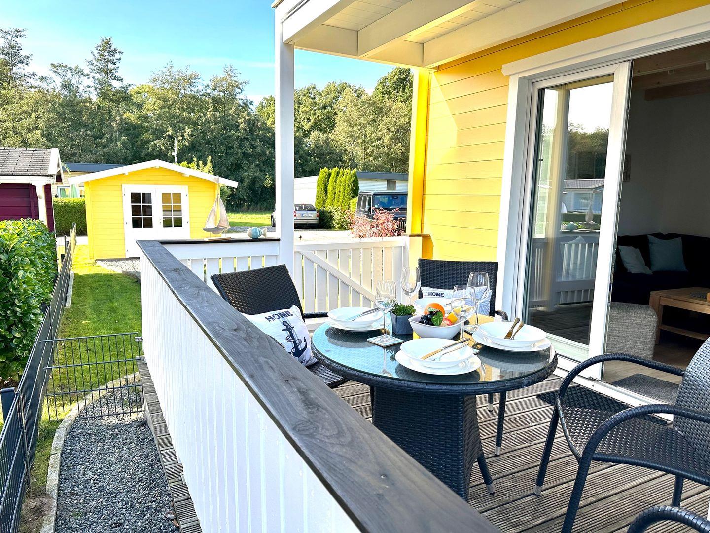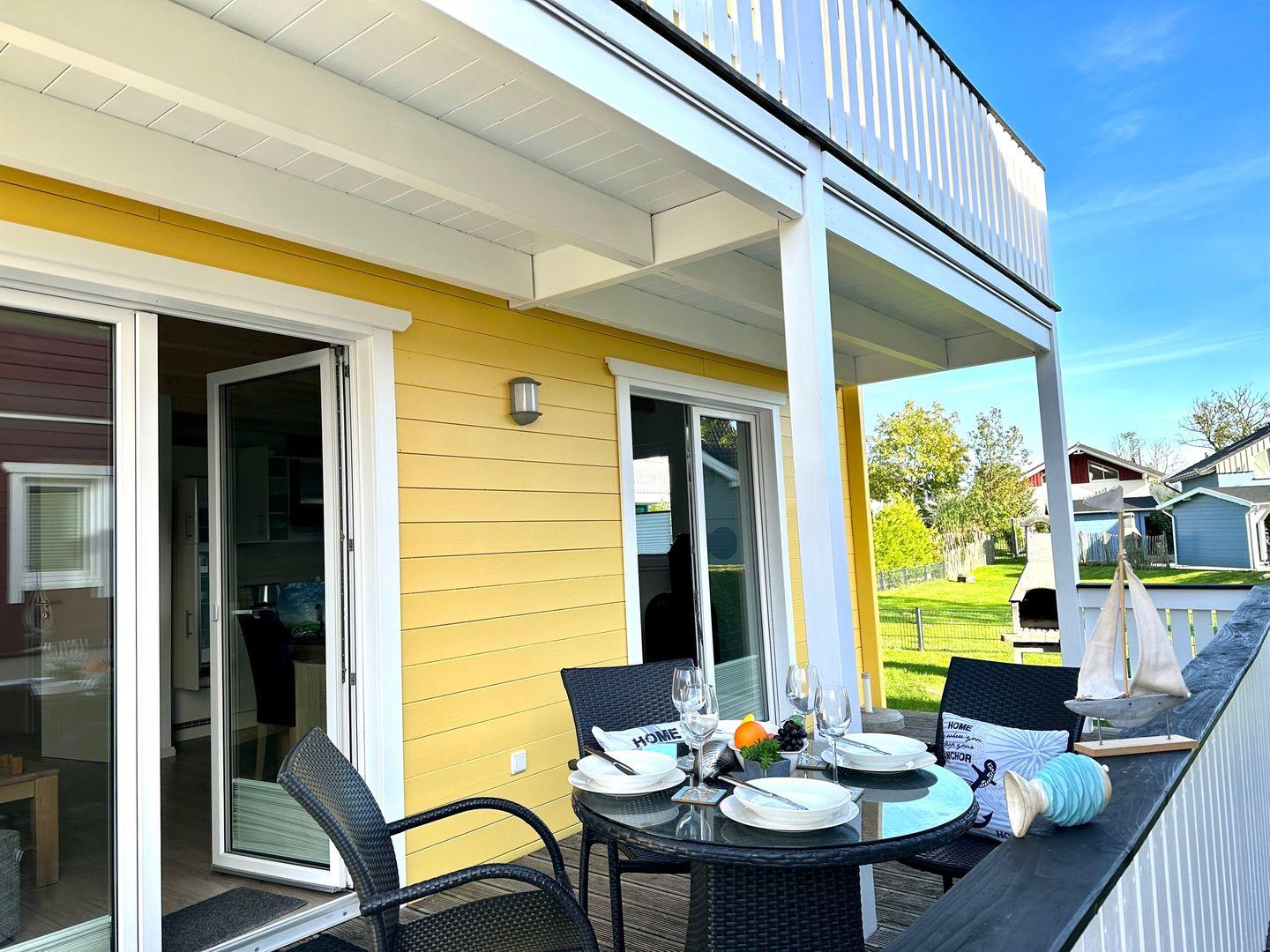 Die Sonne und die schöne Ostseeluft können Sie gleich doppelt genießen: vom gemütlichen Wohnbereich mit Sofaecke aus gelangen Sie auf die hübsche Terrasse zur Südseite, der Garten ist eingezäunt, ein Grillplatz bietet tolle Möglichkeiten für sommerliche Barbecues. Die im Wohnraum integrierte Küchenzeile mit gemütlichem Essplatz bietet stilvolle Gemütlichkeit und genügend Platz für gesellige Runden. Ein großer Flachbildfernseher und ein DVD-Player bieten auch an Regentagen für reichlich Komfort und ein prasselndes Feuer im Kaminofen sorgt für Behaglichkeit.