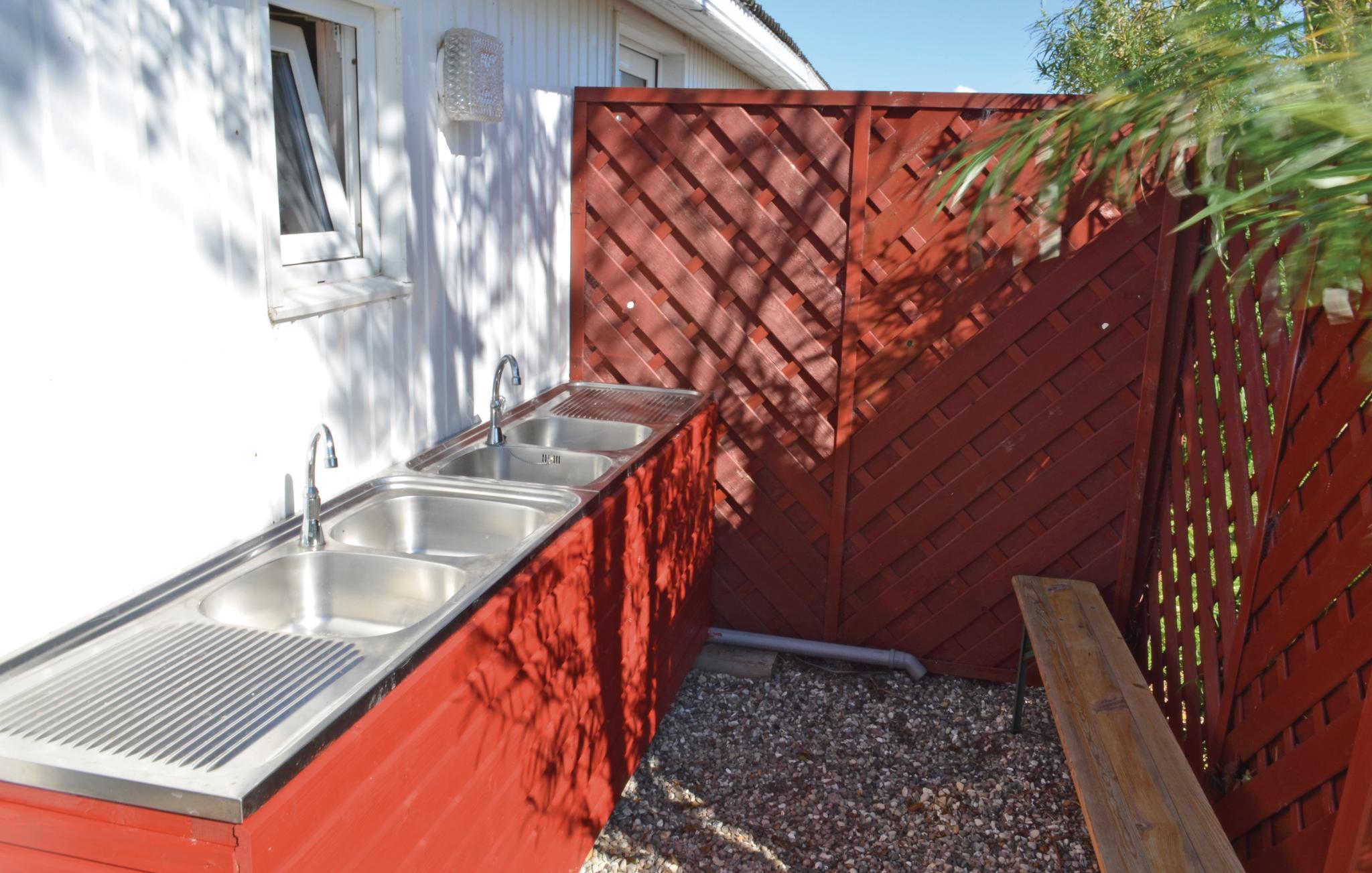 Husets møblerede og delvist overdækkede terrasse vender mod syd. Bag huset er der også havemøbler, grill og et havehus til cykler og fiskeudstyr, for der er meget gode fiskemuligheder på Süssauer Strand.