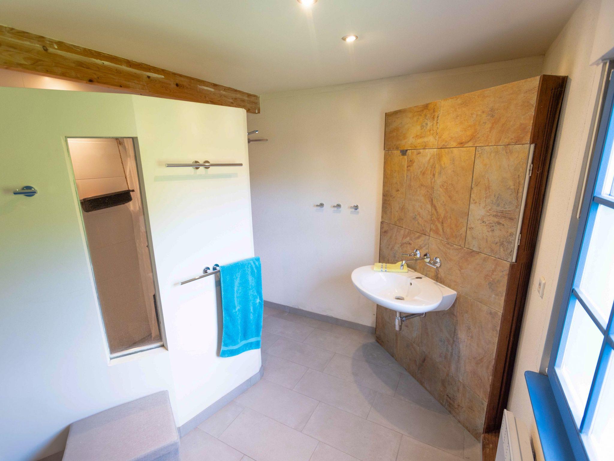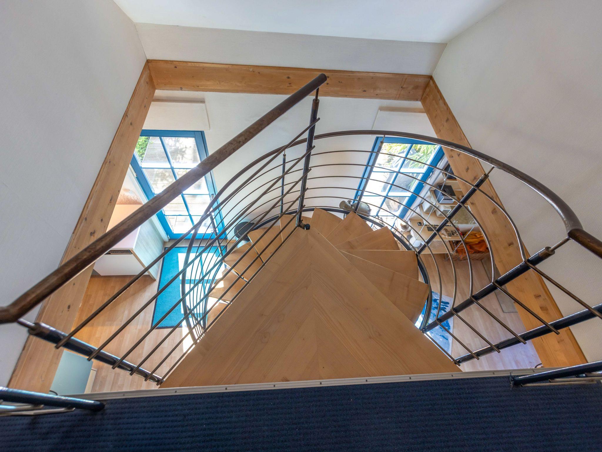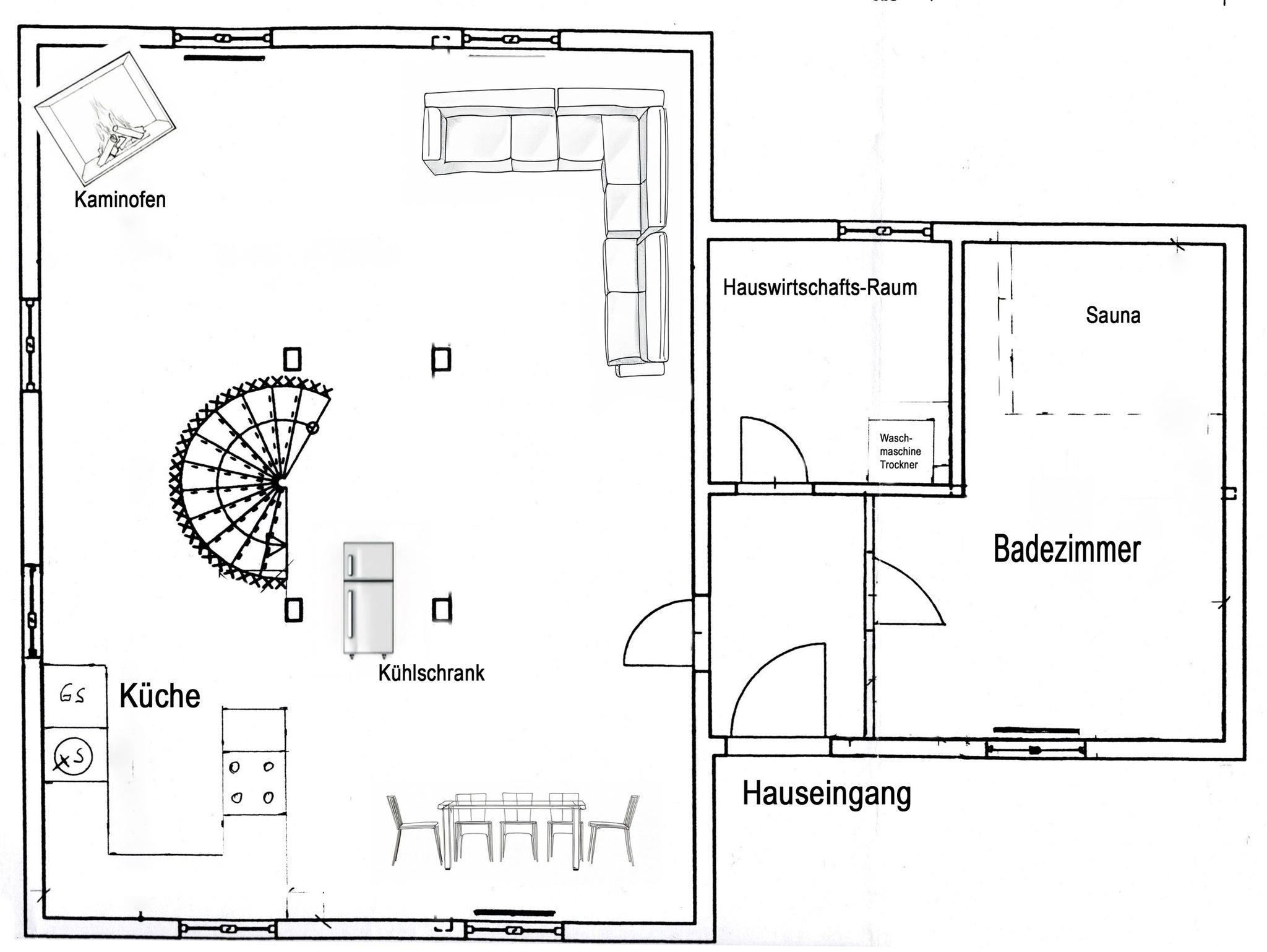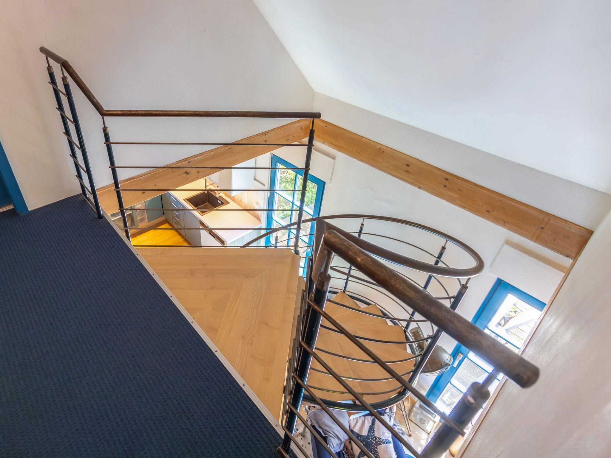 Das Bad im Erdgeschoss verfügt über eine ebenerdige Dusche, WC, Waschbecken, Fußbodenheizung und eine kleine Sauna, ideal zum Entspannen nach einem Ausflug. Eine bequeme Wendeltreppe führt ins Obergeschoss, wo drei individuell gestaltete Schlafzimmer und ein zusätzliches Gäste-WC auf dich warten.
