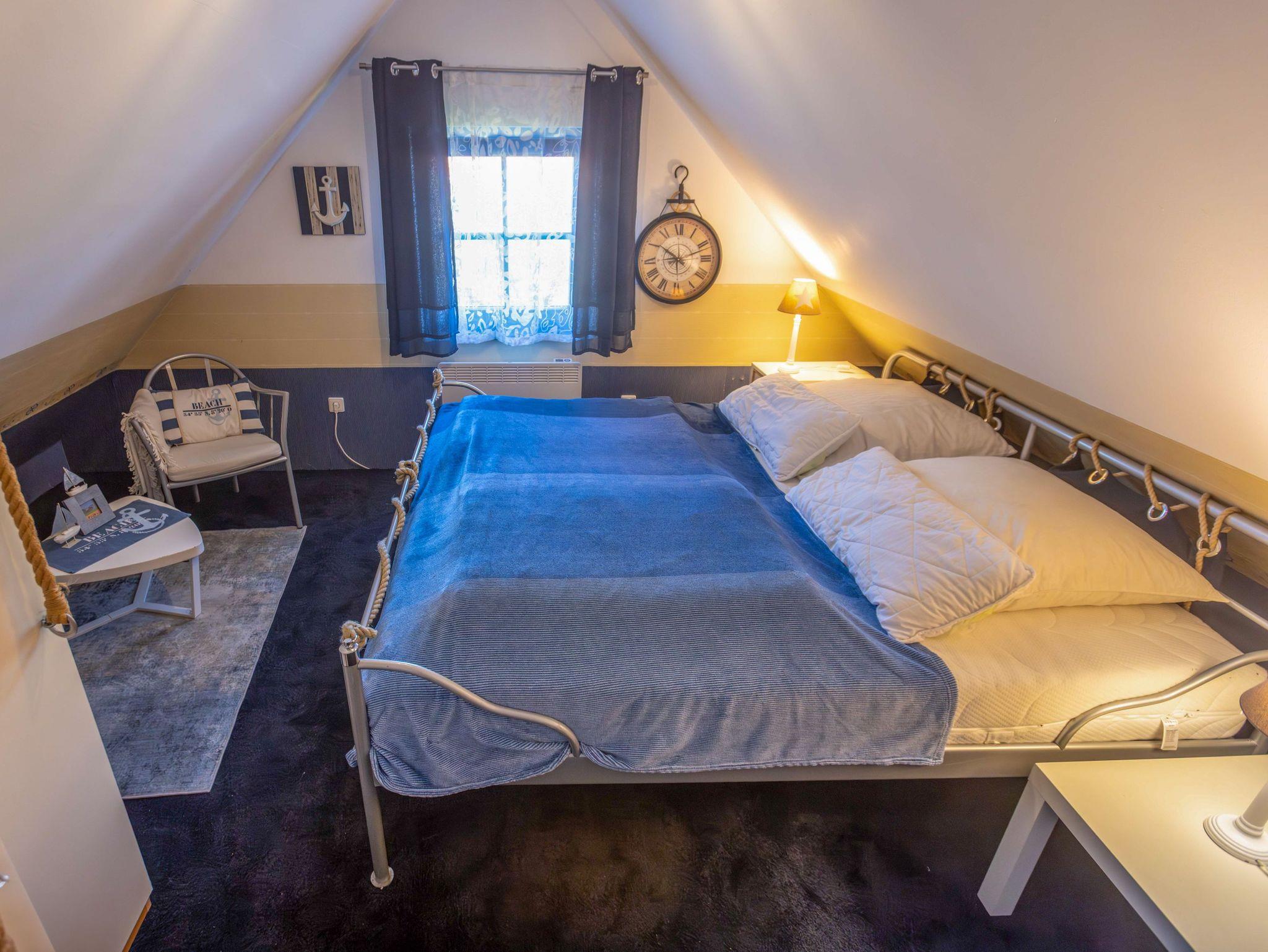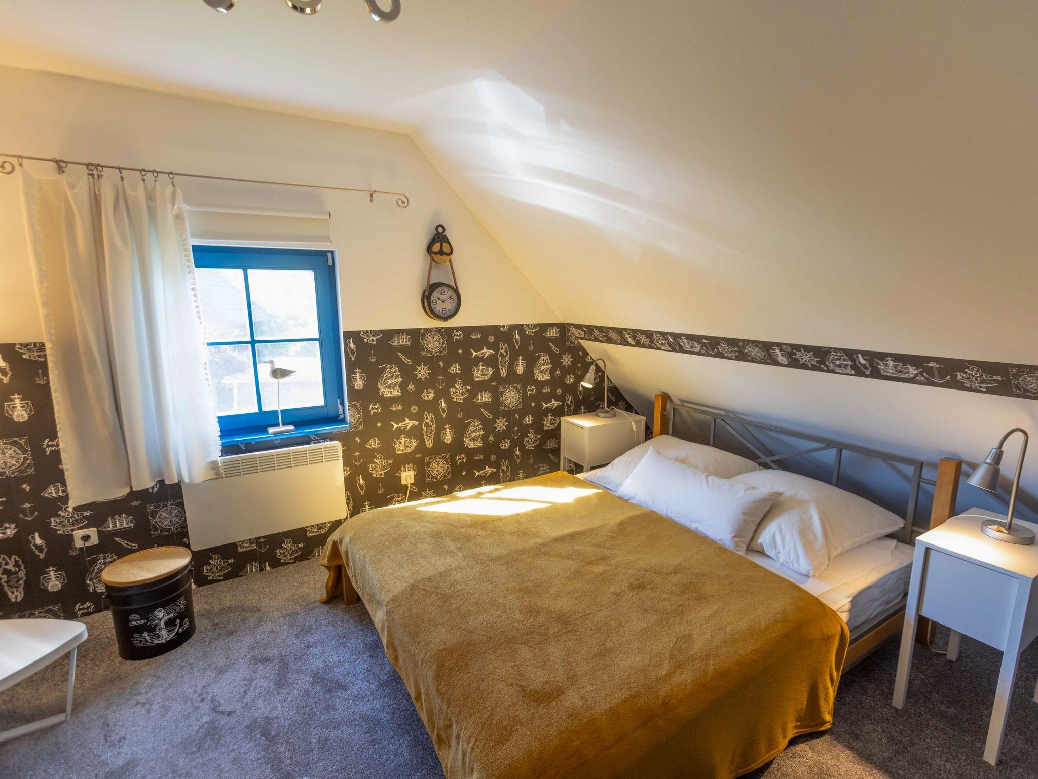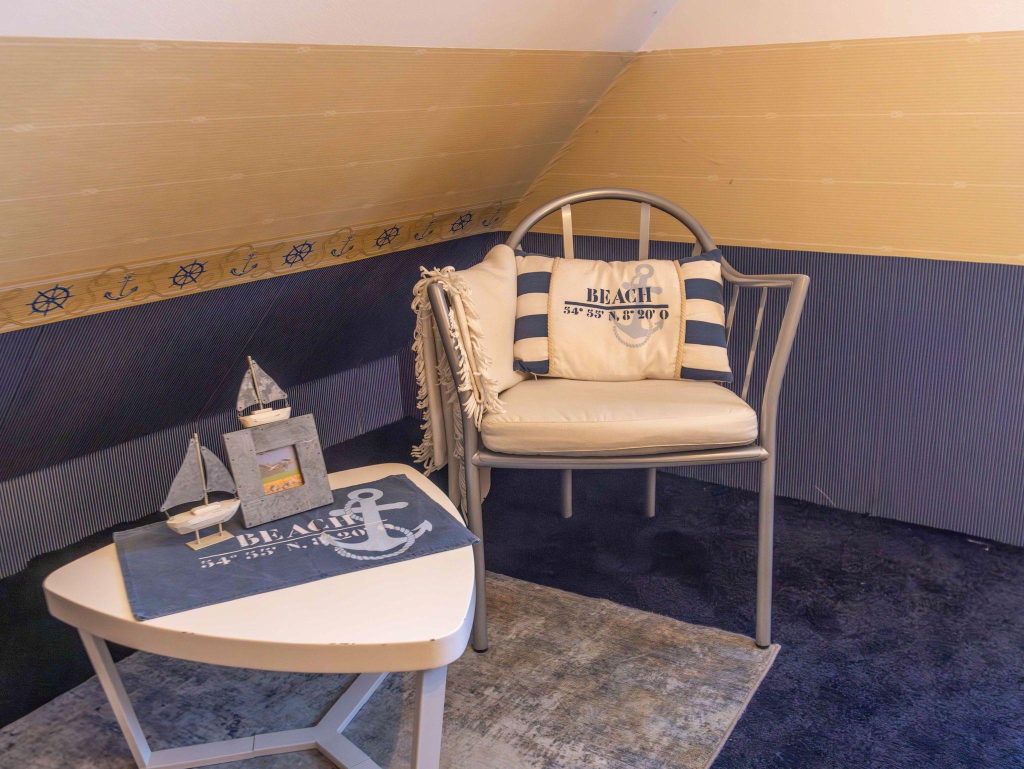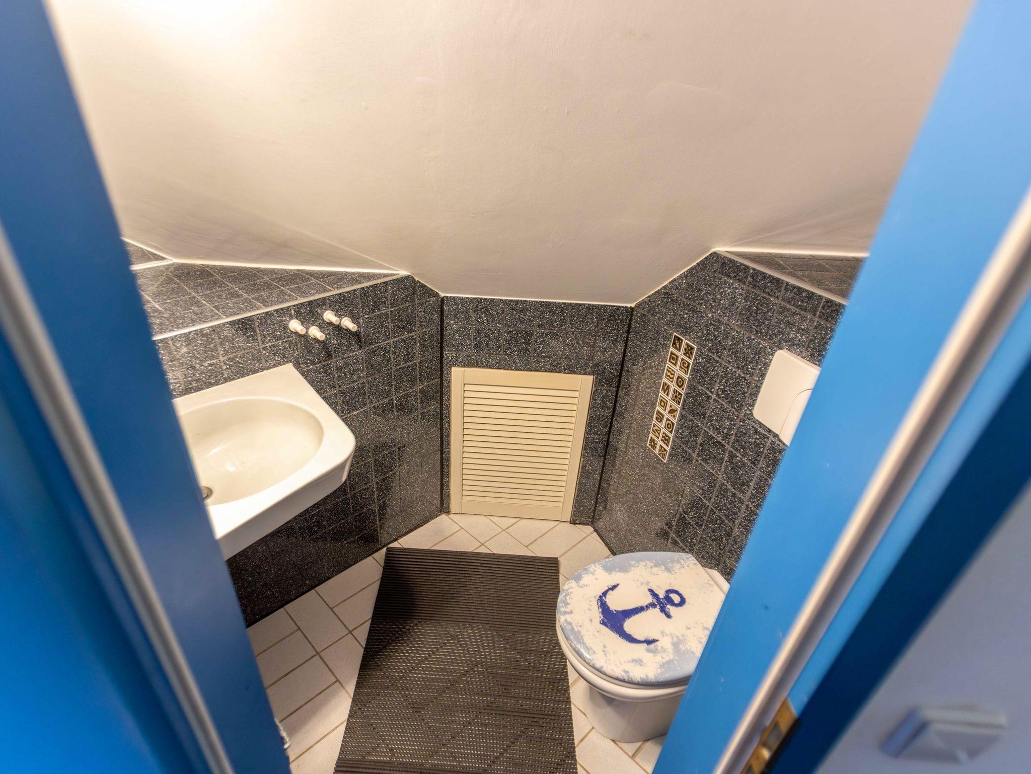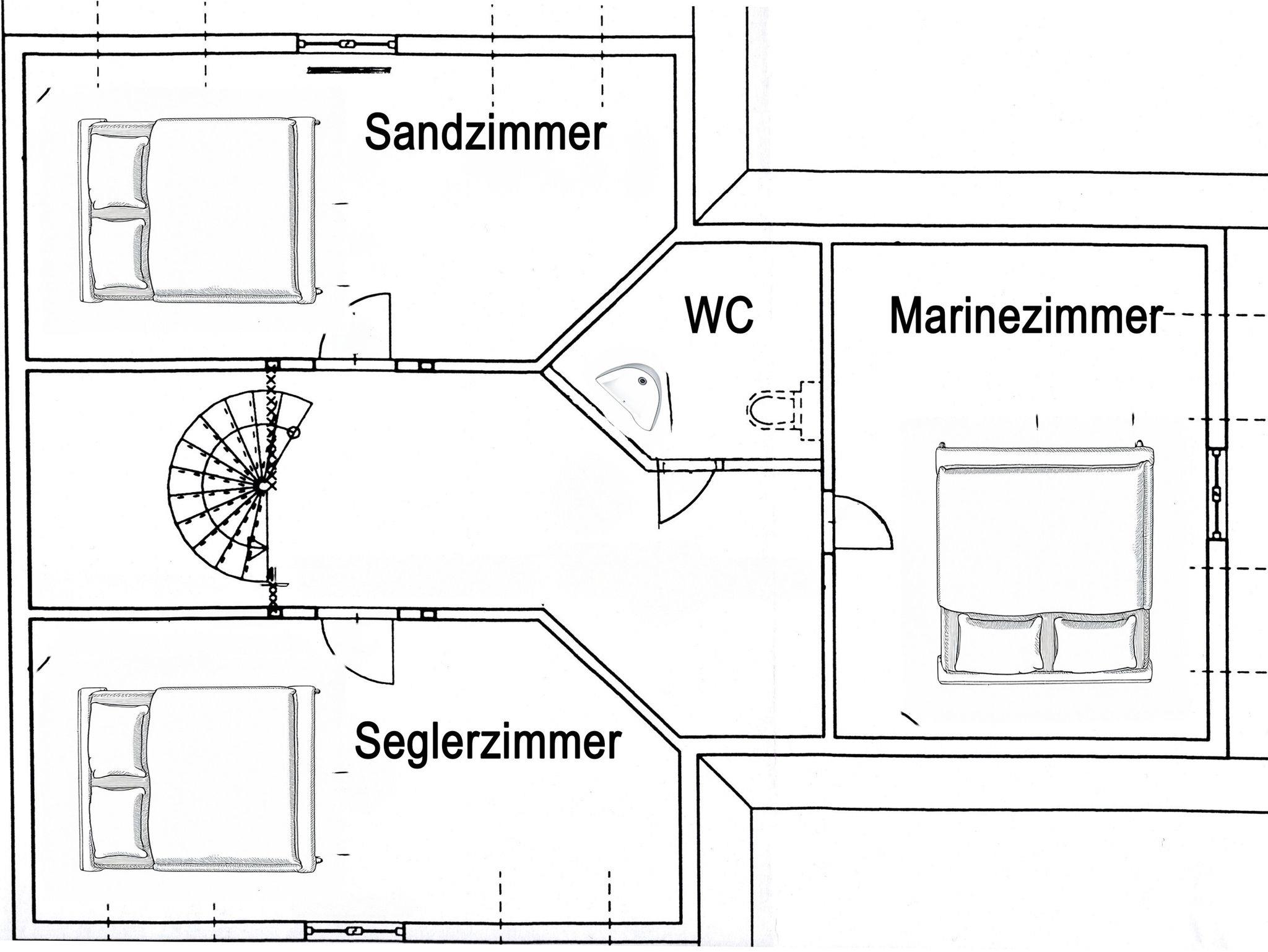 Ebenfalls im Erdgeschoss liegt das moderne Badezimmer mit ebenerdiger Dusche, WC, Waschbecken, Fußbodenheizung und einer kleinen Sauna. Ein Hauswirtschaftsraum ergänzt das Raumangebot mit Waschmaschine, Trockner und vielen nützlichen Dingen wie Wäscheklammern, Verlängerungskabel, Bügelbrett oder sogar einem Boule-Spiel. Über eine bequeme Wendeltreppe gelangst du in das Obergeschoss, wo dich drei individuell gestaltete Schlafzimmer und ein separates Gäste-WC erwarten. Das Sandzimmer ist mit einem Doppelbett (160x200, getrennte Matratzen) und einem zusätzlichen Schlafsofa (80x200) ausgestattet. Im Segelzimmer findest du ein Doppelbett (160x200, durchgehende Matratze) sowie ein weiteres Schlafsofa (80x200). Das Marinezimmer am Ende des Flurs ist etwas kompakter, aber liebevoll eingerichtet, mit einem Doppelbett (180x200, getrennte Matratzen).
