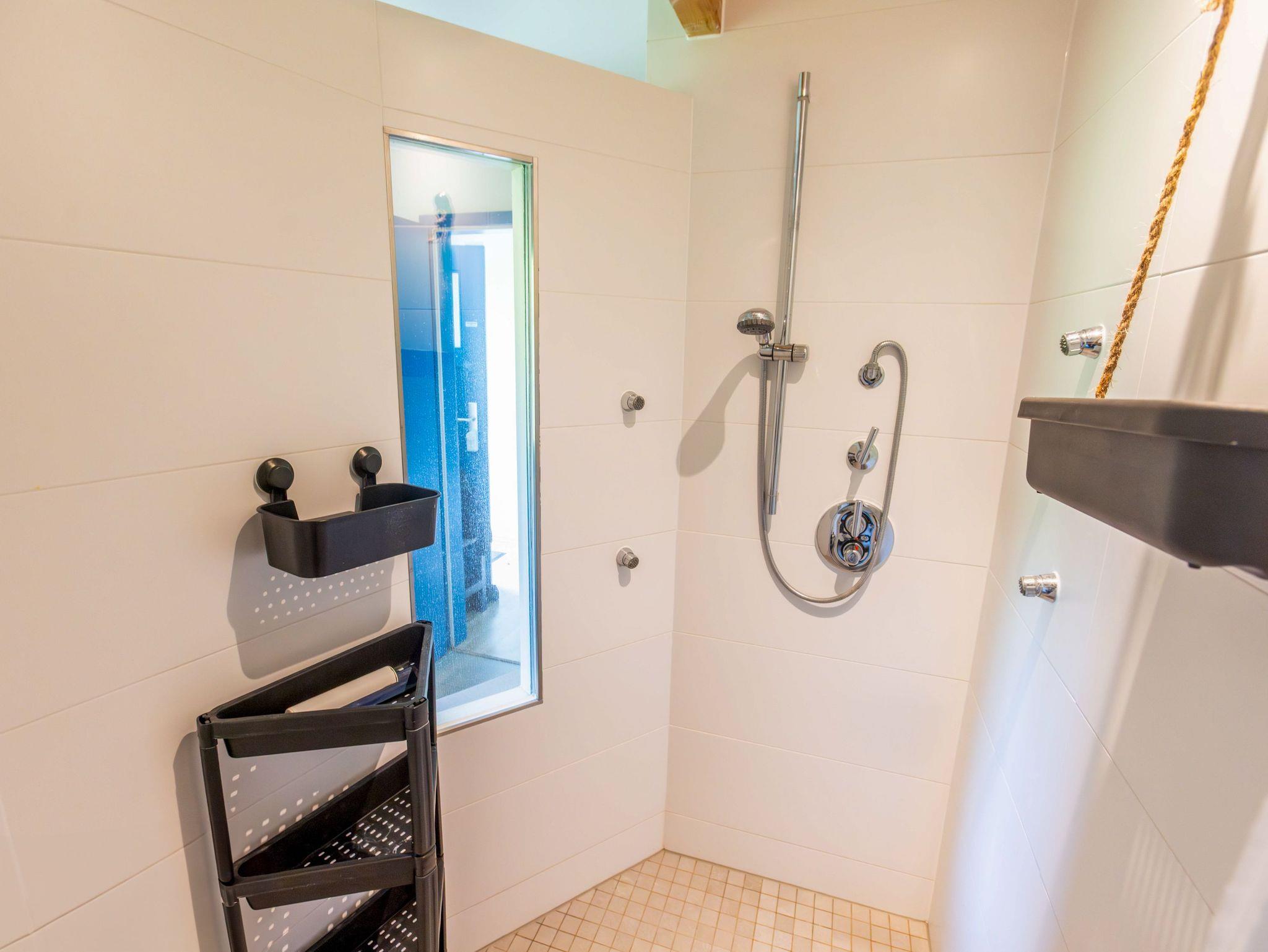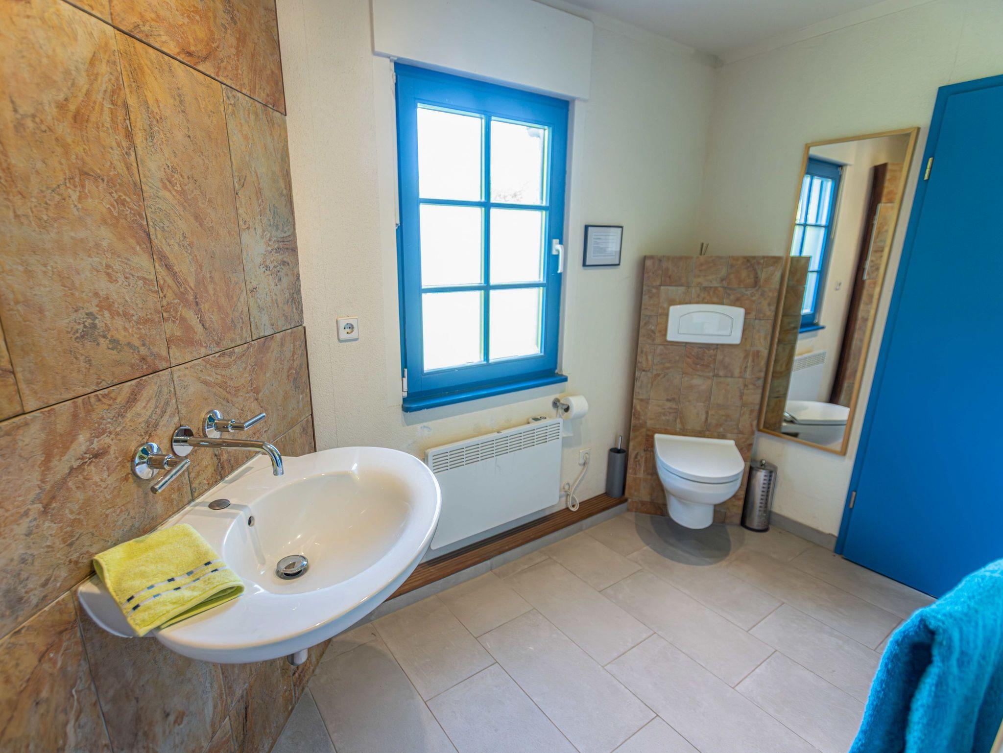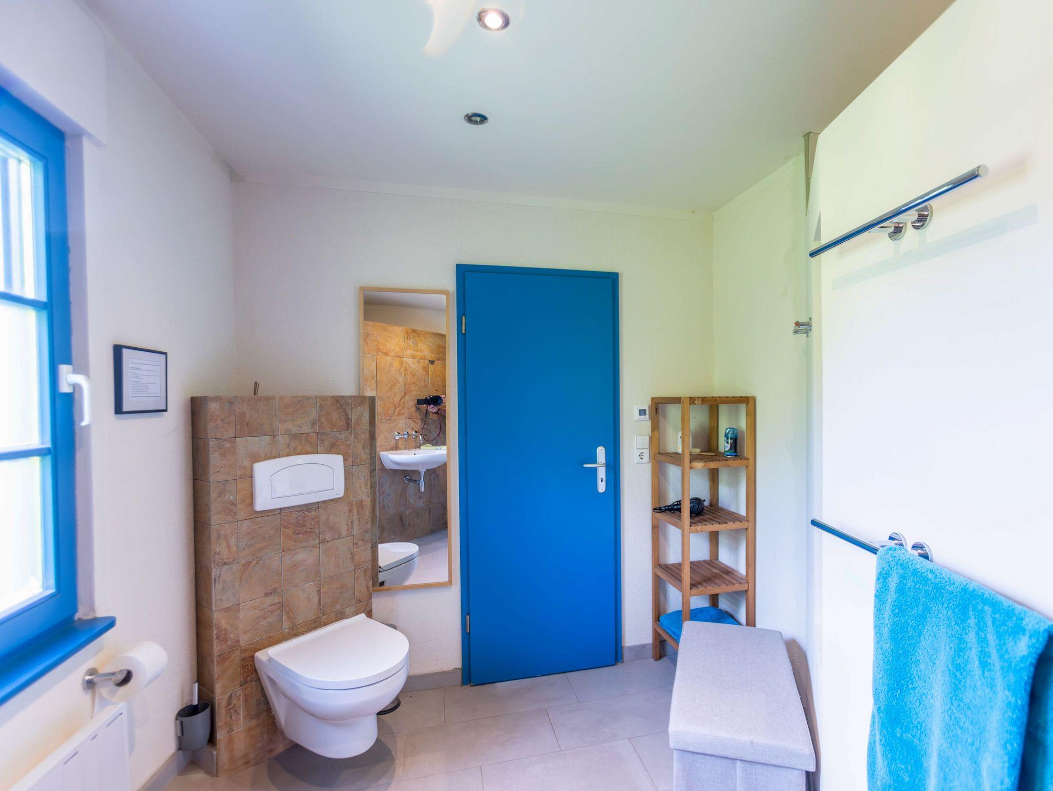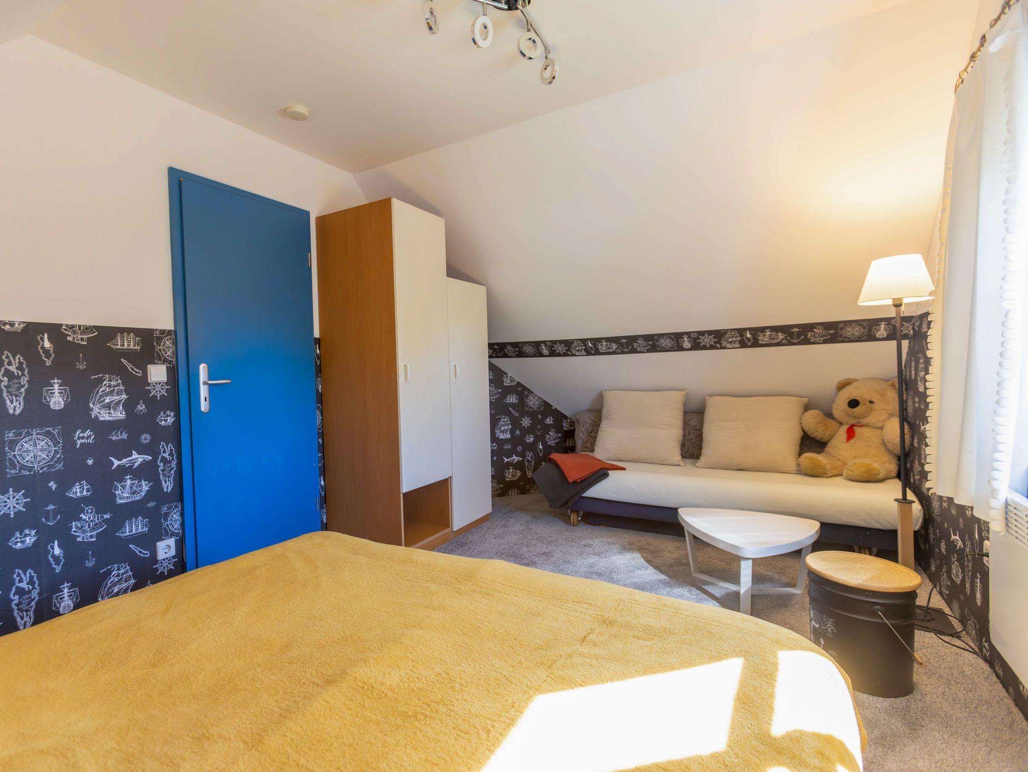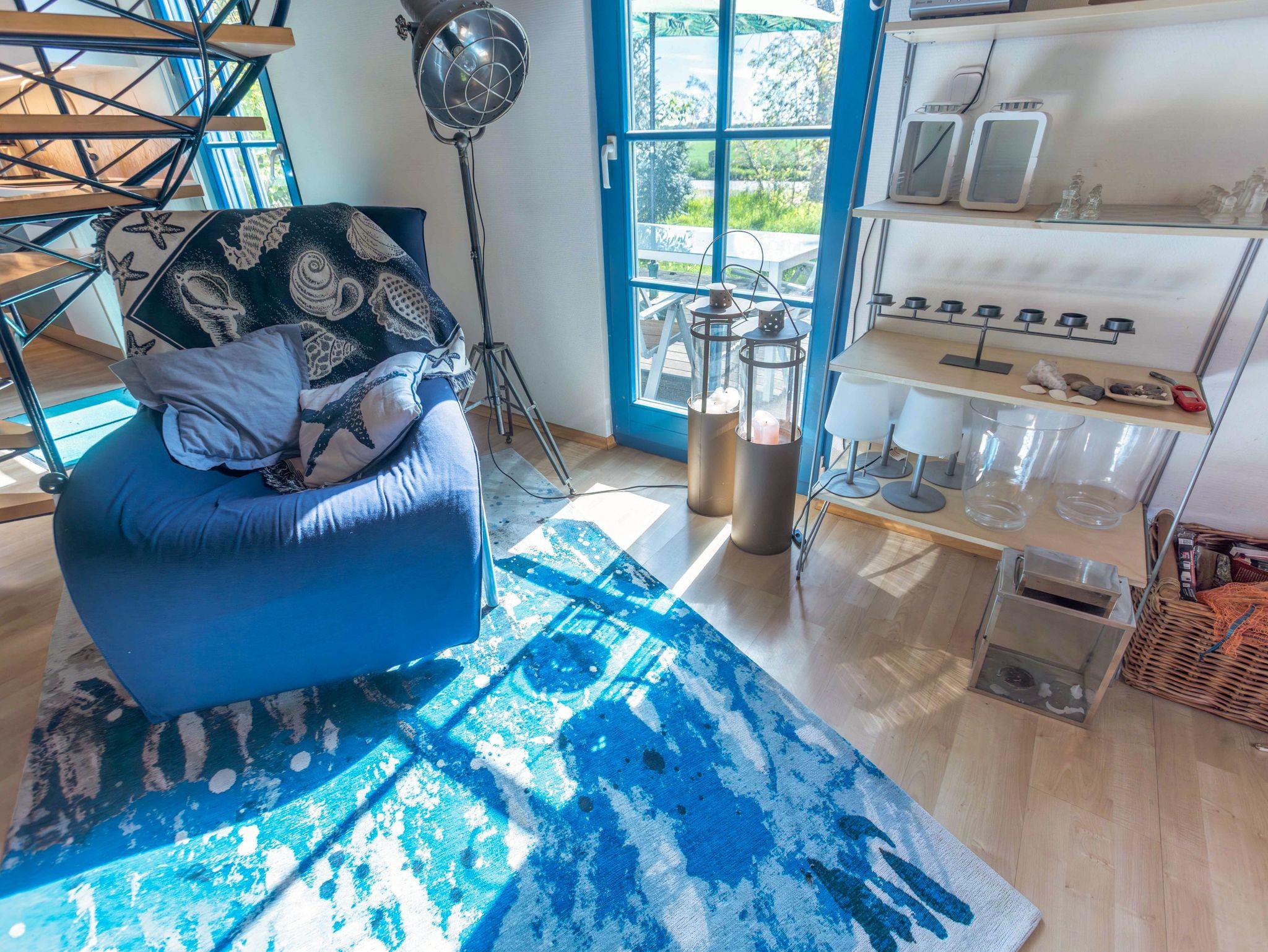 Ebenfalls im Erdgeschoss liegt das moderne Badezimmer mit ebenerdiger Dusche, WC, Waschbecken, Fußbodenheizung und einer kleinen Sauna. Ein Hauswirtschaftsraum ergänzt das Raumangebot mit Waschmaschine, Trockner und vielen nützlichen Dingen wie Wäscheklammern, Verlängerungskabel, Bügelbrett oder sogar einem Boule-Spiel. Über eine bequeme Wendeltreppe gelangst du in das Obergeschoss, wo dich drei individuell gestaltete Schlafzimmer und ein separates Gäste-WC erwarten. Das Sandzimmer ist mit einem Doppelbett (160x200, getrennte Matratzen) und einem zusätzlichen Schlafsofa (80x200) ausgestattet. Im Segelzimmer findest du ein Doppelbett (160x200, durchgehende Matratze) sowie ein weiteres Schlafsofa (80x200). Das Marinezimmer am Ende des Flurs ist etwas kompakter, aber liebevoll eingerichtet, mit einem Doppelbett (180x200, getrennte Matratzen).