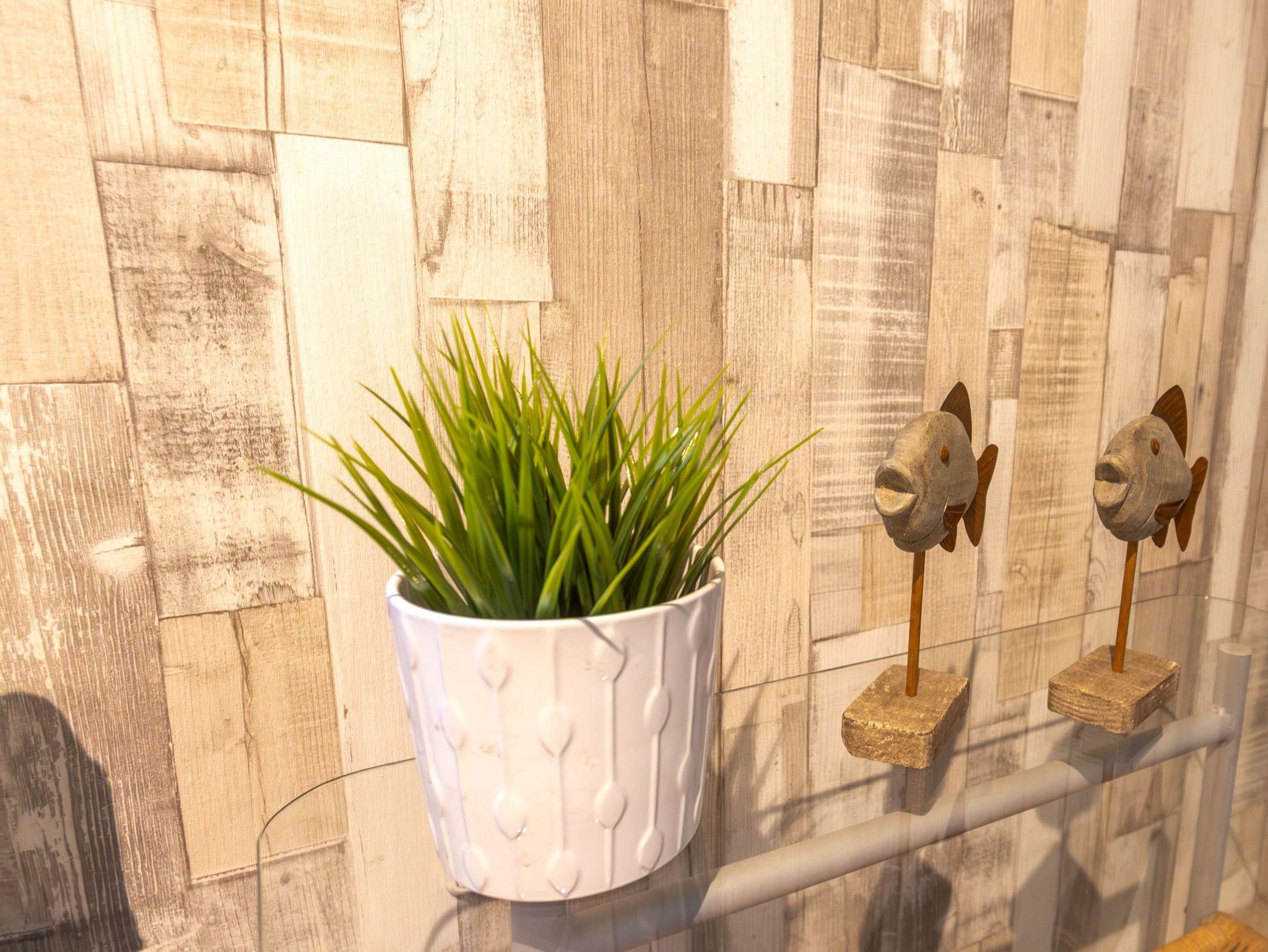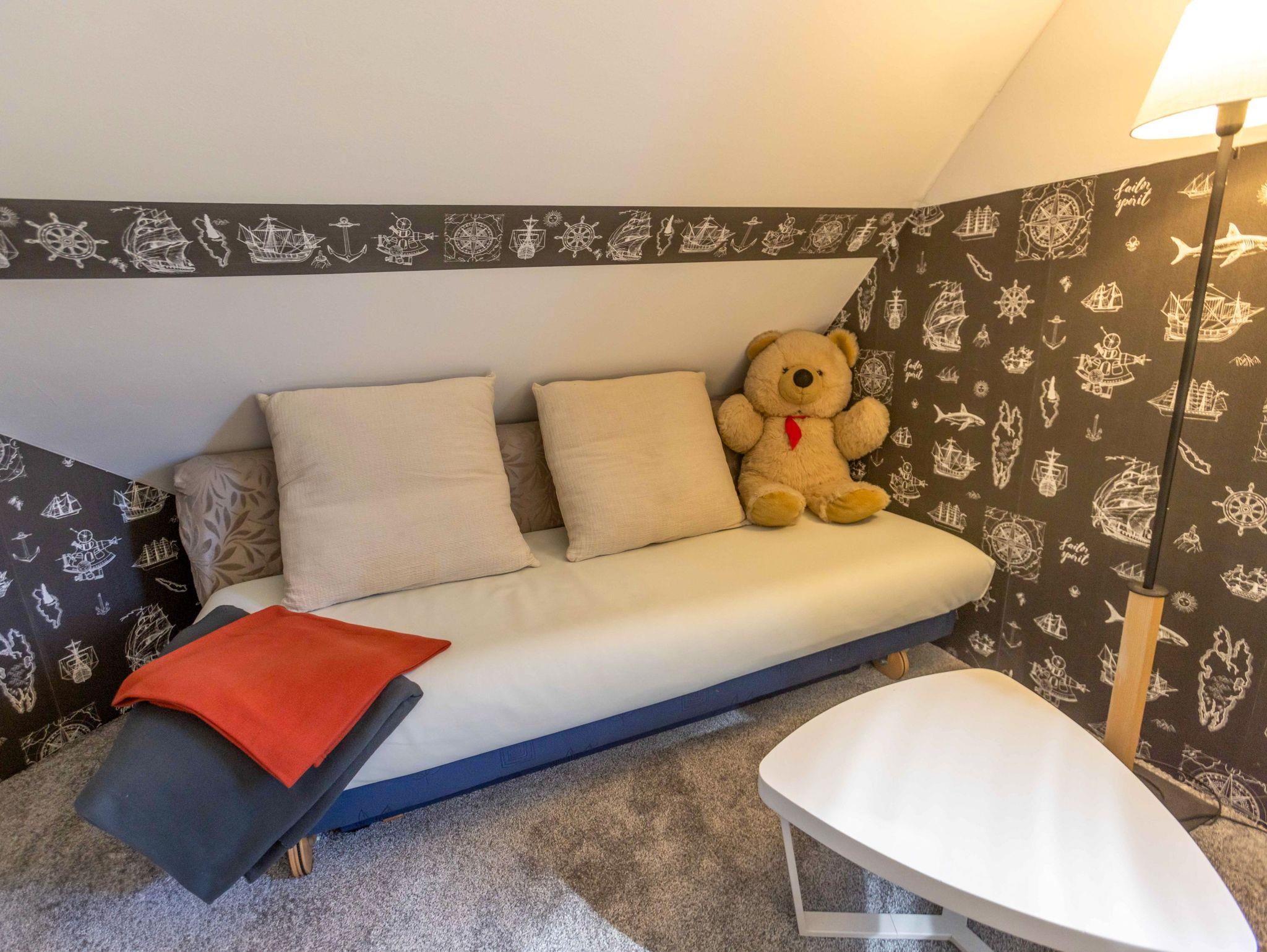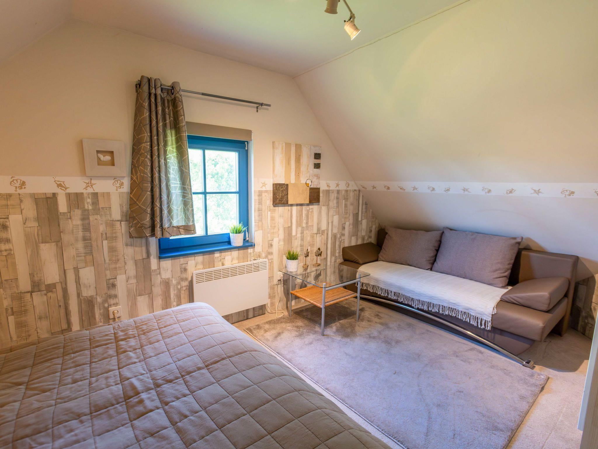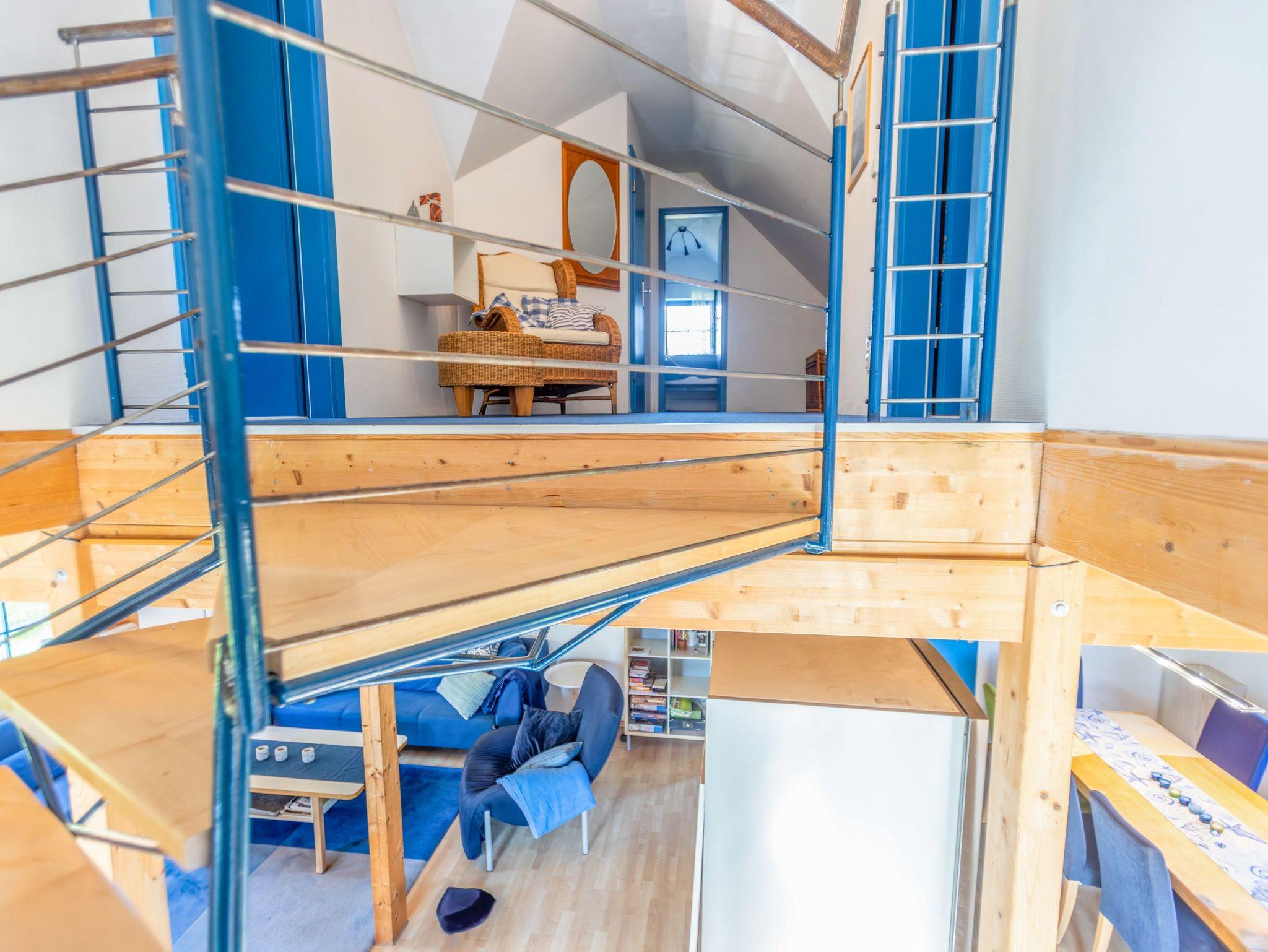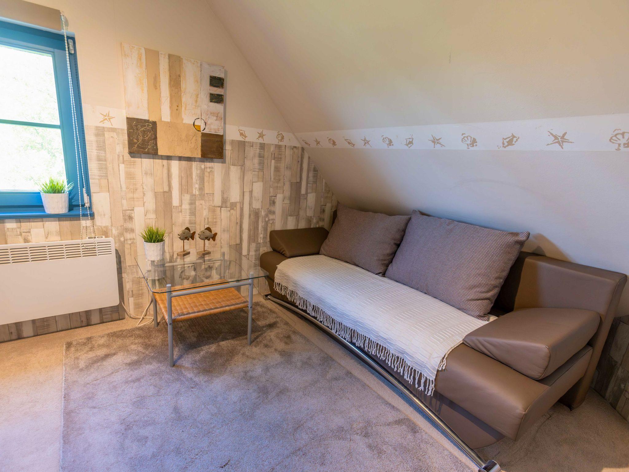 Ebenfalls im Erdgeschoss liegt das moderne Badezimmer mit ebenerdiger Dusche, WC, Waschbecken, Fußbodenheizung und einer kleinen Sauna. Ein Hauswirtschaftsraum ergänzt das Raumangebot mit Waschmaschine, Trockner und vielen nützlichen Dingen wie Wäscheklammern, Verlängerungskabel, Bügelbrett oder sogar einem Boule-Spiel. Über eine bequeme Wendeltreppe gelangst du in das Obergeschoss, wo dich drei individuell gestaltete Schlafzimmer und ein separates Gäste-WC erwarten. Das Sandzimmer ist mit einem Doppelbett (160x200, getrennte Matratzen) und einem zusätzlichen Schlafsofa (80x200) ausgestattet. Im Segelzimmer findest du ein Doppelbett (160x200, durchgehende Matratze) sowie ein weiteres Schlafsofa (80x200). Das Marinezimmer am Ende des Flurs ist etwas kompakter, aber liebevoll eingerichtet, mit einem Doppelbett (180x200, getrennte Matratzen).