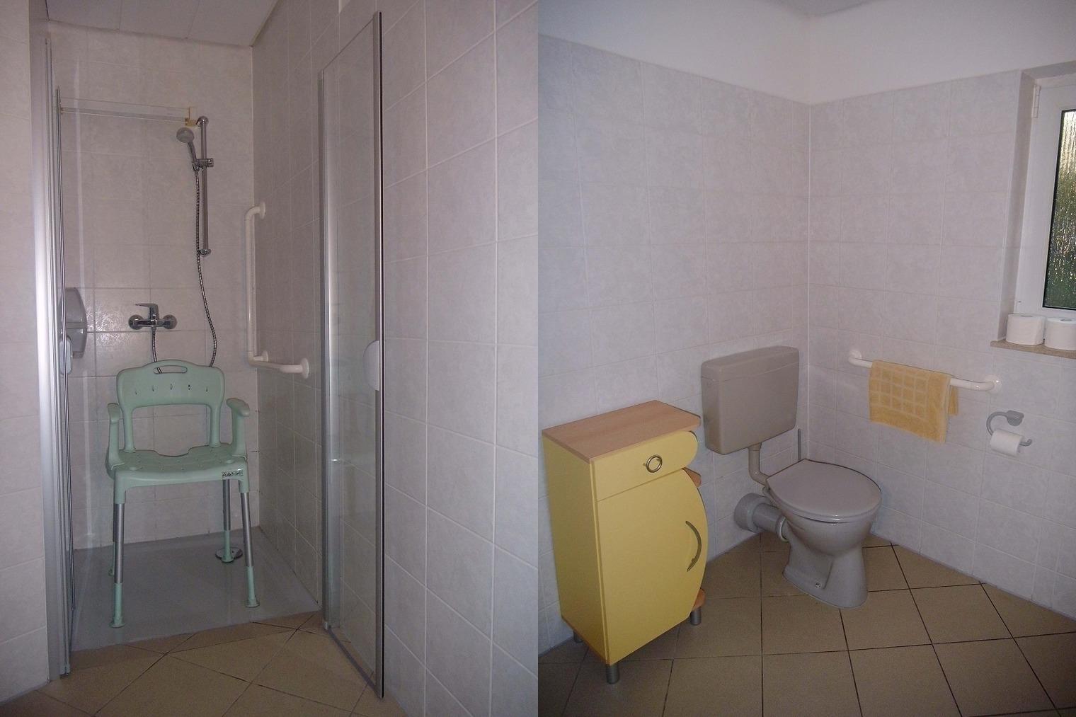 Im Bad wurde versucht die Bedürfnisse von Rollstuhlfahren zu berücksichtigen. Das Badezimmer besteht aus einer ebenerdigen Dusche (0, 90 x 0, 90 m) mit Duschhocker und Haltegriffen, Toilette und Waschbecken