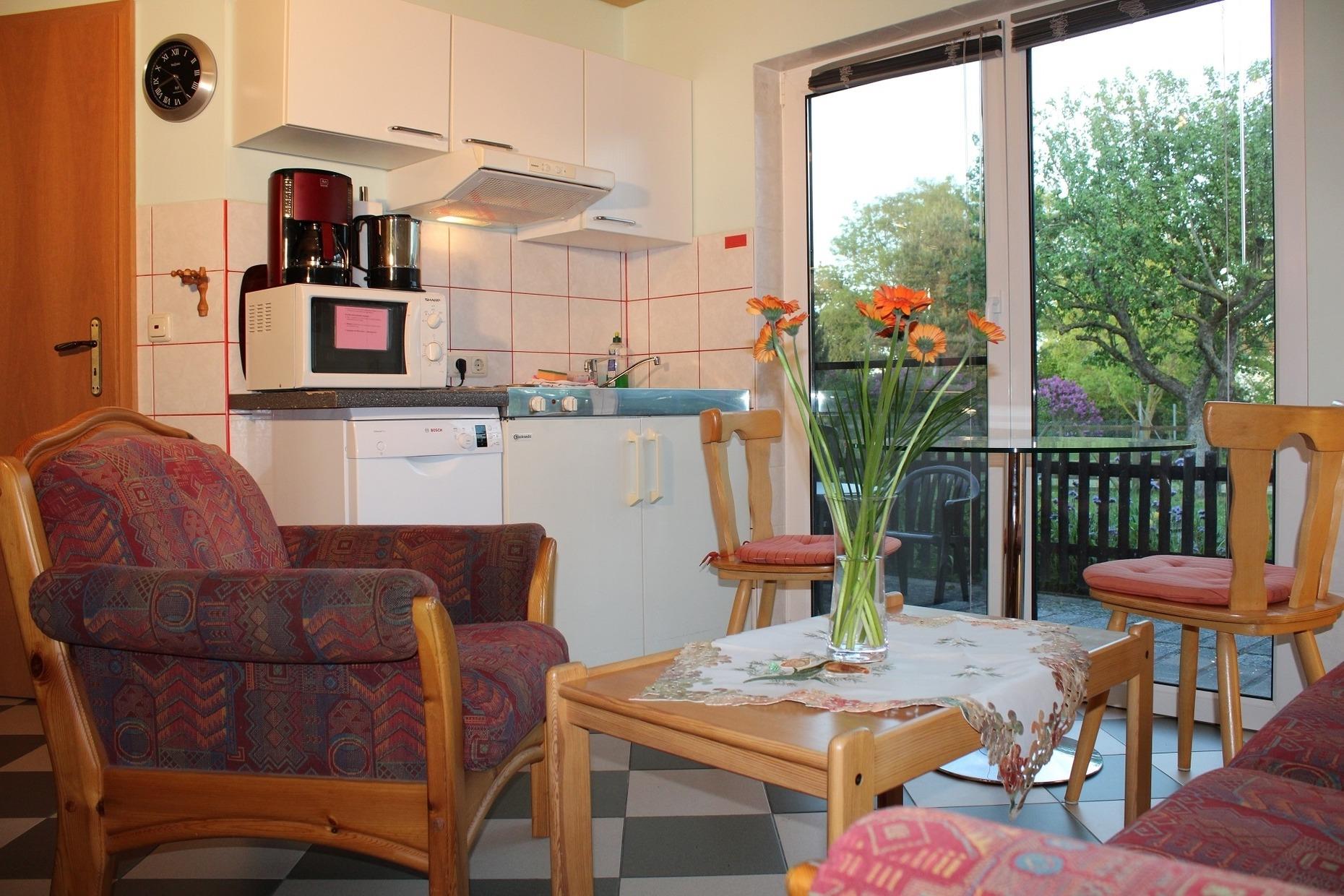 Die Erdgeschosswohnung orange ist behinderten- bzw. rollstuhlfahrerfreundlich eingerichtet. Sie besteht aus einem Wohn- und Küchenbereich mit einer Schlafcouch (Liegefläche ca. 1, 40 x 1, 90 m). Hier findet die Aufbettung für maximal 2 Personen statt. Eingeklappt bietet die Couch Platz für 2 Personen. Für eine 3. Person steht ein Sessel bereit. Diese Ferienwohnung ist für Allergiker geeignet. Bitte haben Sie Verständnis, dass Ihr 4-beiniger Begleiter nicht mit hinein darf. Der Ausgang zum Garten führt über die Terrasse mit Gartenmöbeln, Sonnenliegen und Sonnenschirm.