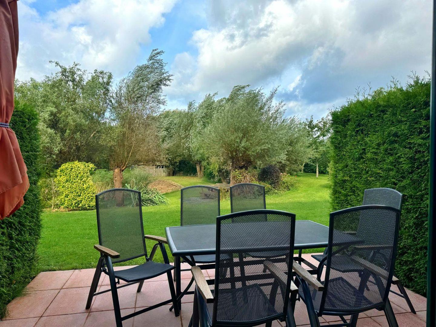 Zu jedem Reihenhaus gehört eine separate ca. 14 qm große Terrasse mit Blick in den Garten und auf den Bodden, mit seitlichen hohen Hecken und Gartenmöbeln.