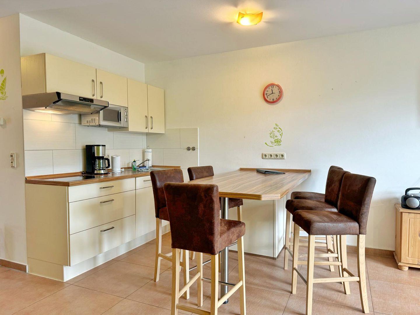 Die 3-Zimmer-Wohnung für 6 Personen erstreckt sich über zwei Etagen mit Wohnbereich, offener Küche und Bad im Erdgeschoß sowie den beiden Schlafräumen im 1. OG.