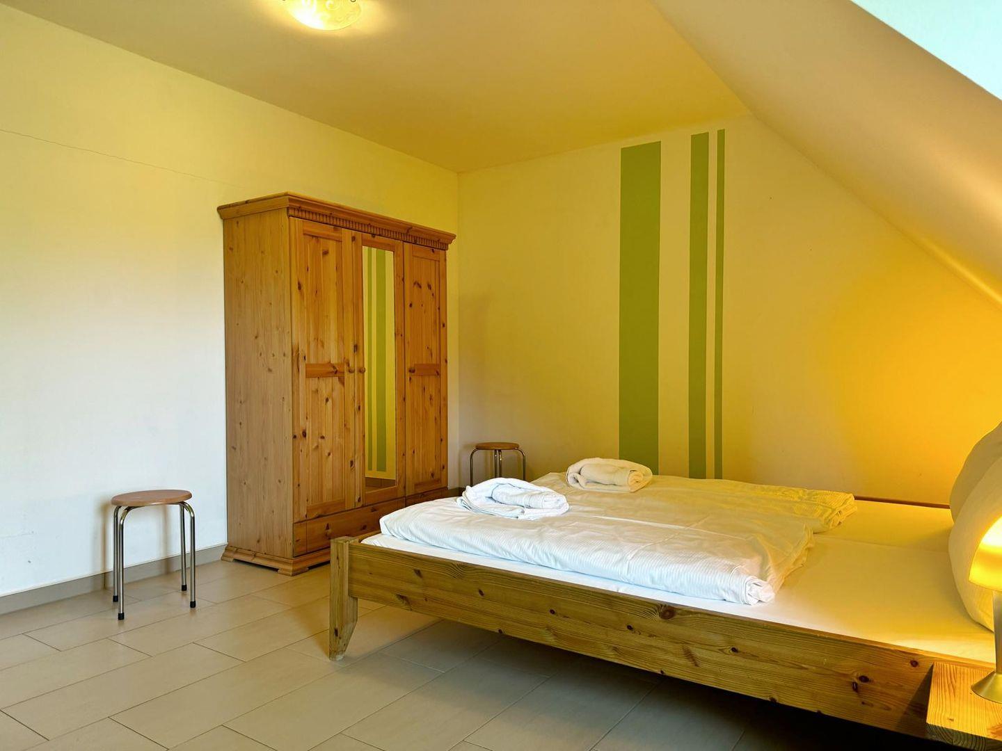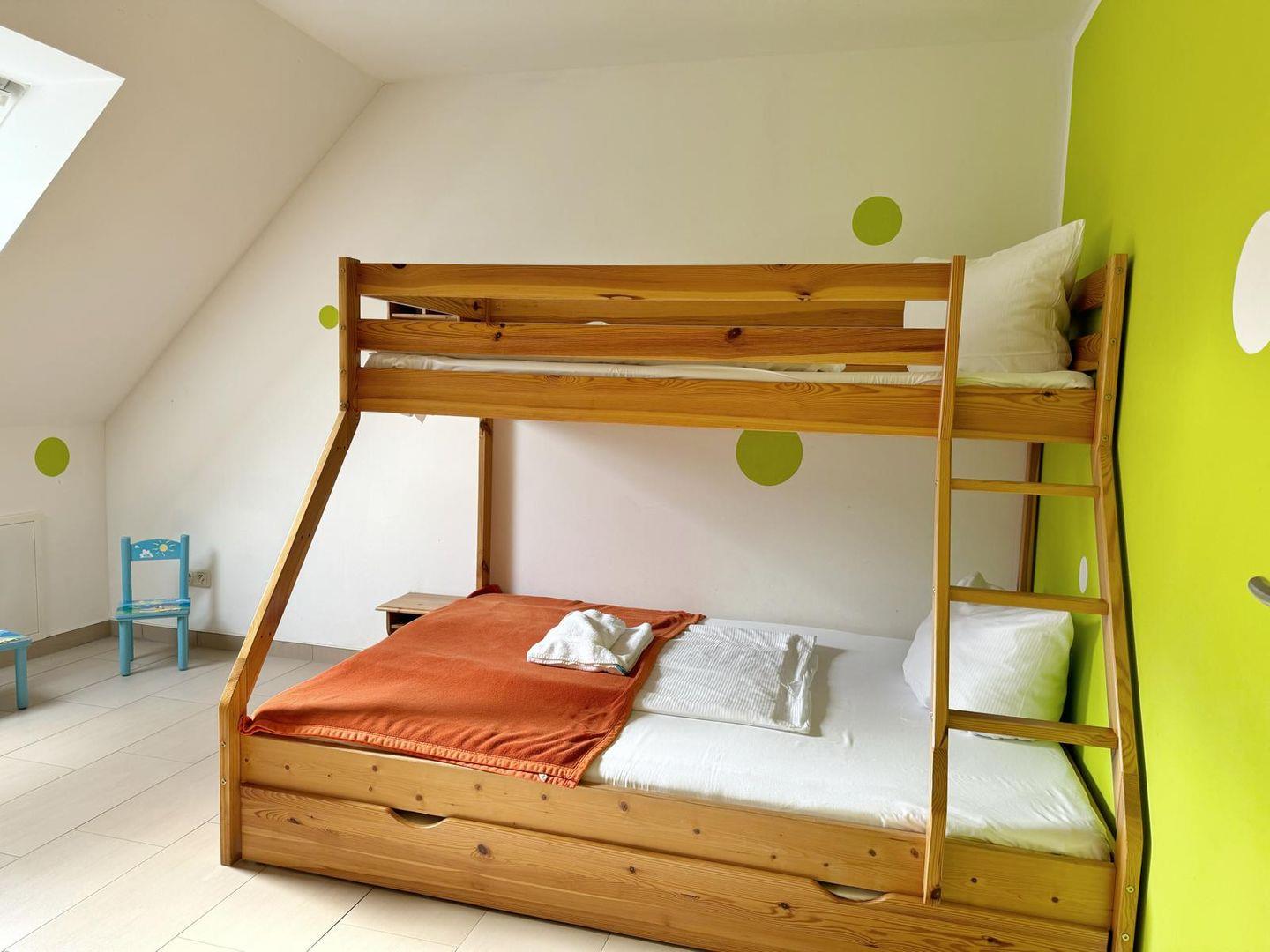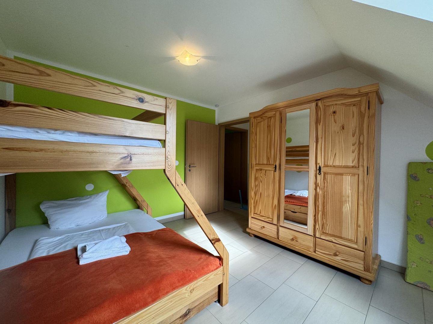 Es gibt ein Schlafzimmer mit Doppelbett und ein zweites Schlafzimmer bzw. Kinderzimmer mit einem Etagenbett. Dieses Etagenbett hat drei Ebenen /Liegeflächen (unter dem unteren Bett befindet sich noch ein weiteres gleich breites Bett zum ausziehen.) Die Kinder haben also viele Schlafmöglichkeiten und auch ein Elternteil kann sich mal mit hinein kuscheln, da die beiden unteren Liegeflächen breiter sind als das obere Bett. Im Wohnzimmer gibt es auf einer Couch mit Bettfunktion eine weitere Schlafmöglichkeit.